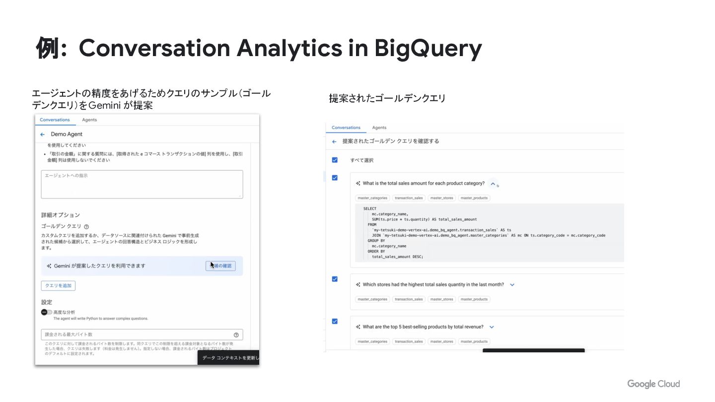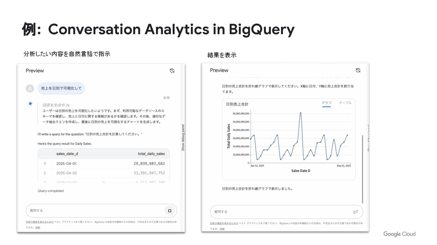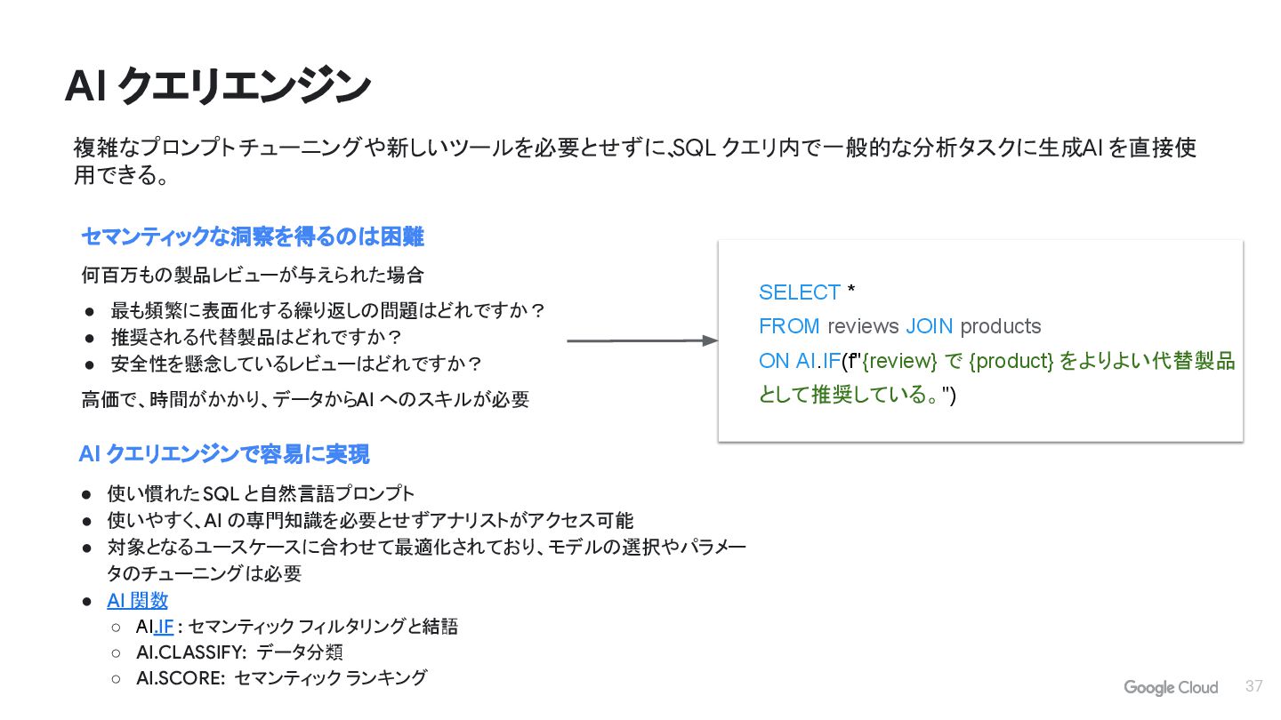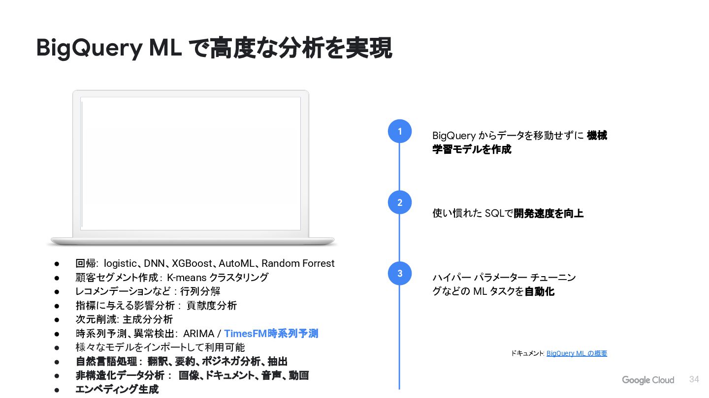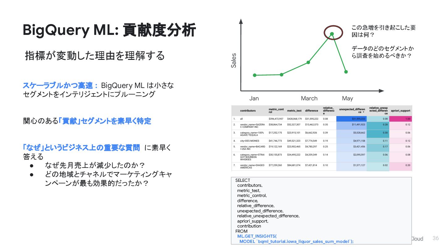 関心のある「貢献」セグメントを素早く特定 「なぜ」というビジネス上の重要な質問 に素早く 答える • なぜ先月売上が減少したのか? • どの地域とチャネルでマーケティングキャ ンペーンが最も効果的だったか? Jan March May Sales この急増を引き起こした要 因は何? データのどのセグメントか ら調査を始めるべきか? 指標が変動した理由を理解する SELECT contributors, metric_test, metric_control, difference, relative_difference, unexpected_difference, relative_unexpected_difference, apriori_support, contribution FROM ML.GET_INSIGHTS( MODEL `bqml_tutorial.iowa_liquor_sales_sum_model`);