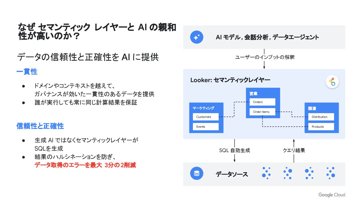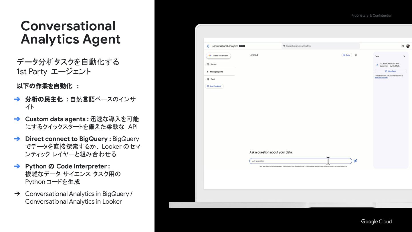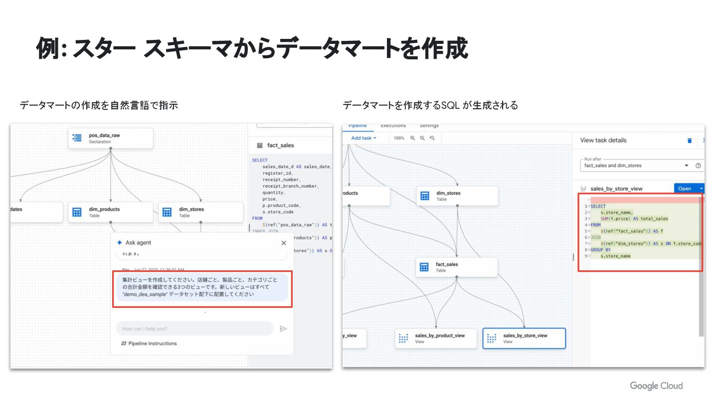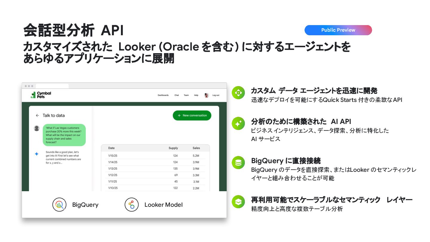 関心のある「貢献」セグメントを素早く特定 「なぜ」というビジネス上の重要な質問 に素早く 答える • なぜ先月売上が減少したのか? • どの地域とチャネルでマーケティングキャ ンペーンが最も効果的だったか? Jan March May Sales この急増を引き起こした要 因は何? データのどのセグメントか ら調査を始めるべきか? 指標が変動した理由を理解する SELECT contributors, metric_test, metric_control, difference, relative_difference, unexpected_difference, relative_unexpected_difference, apriori_support, contribution FROM ML.GET_INSIGHTS( MODEL `bqml_tutorial.iowa_liquor_sales_sum_model`);