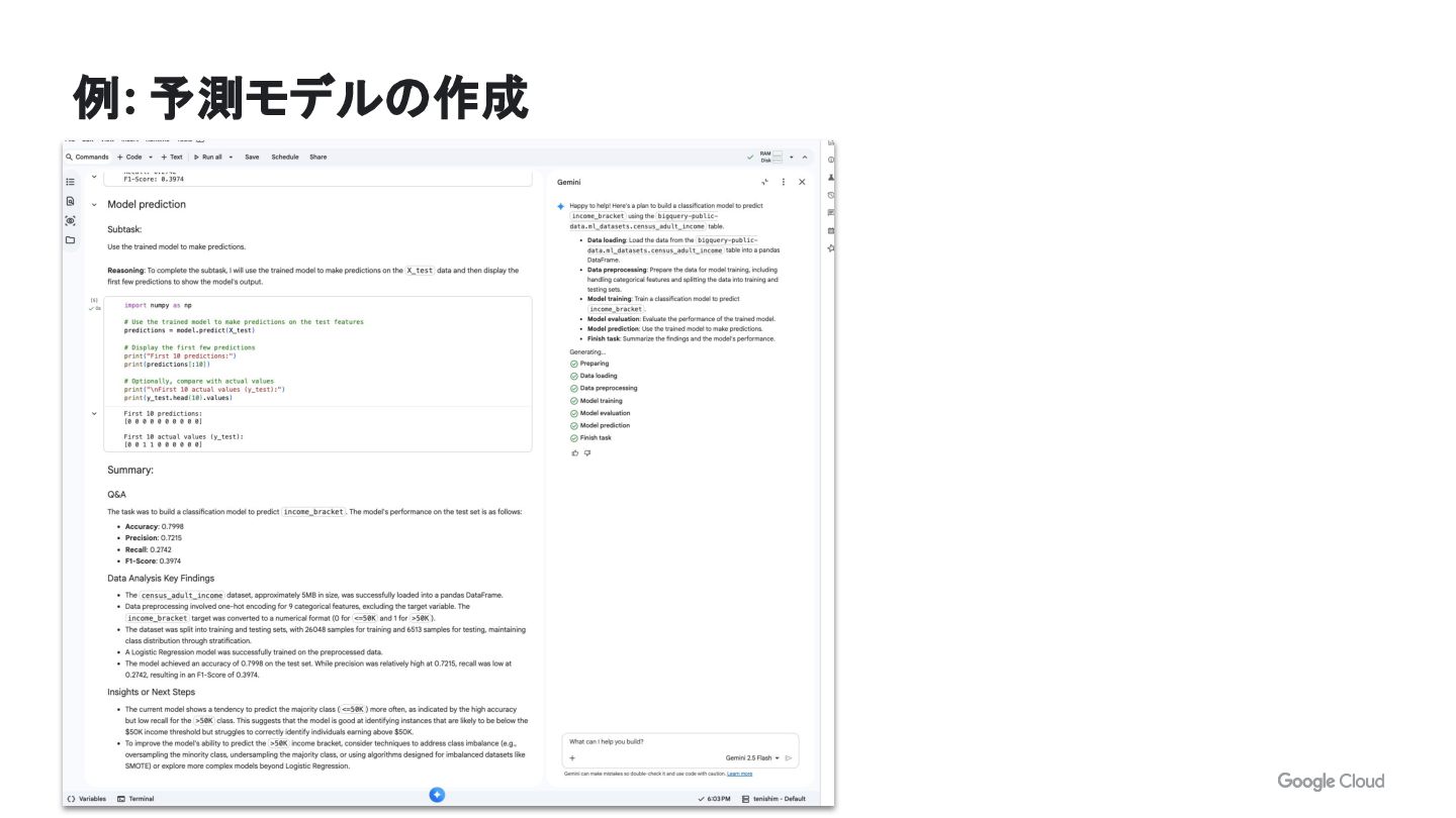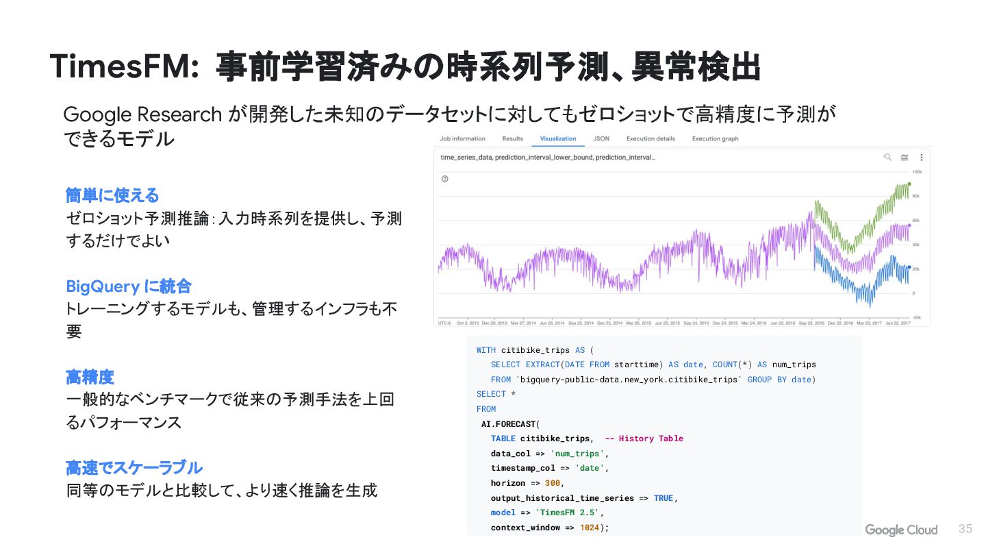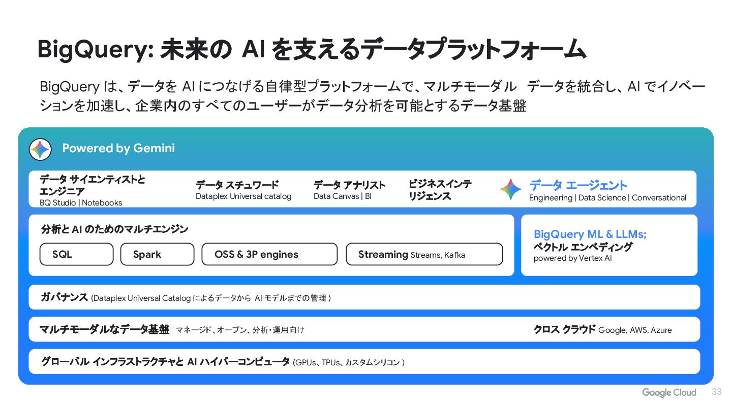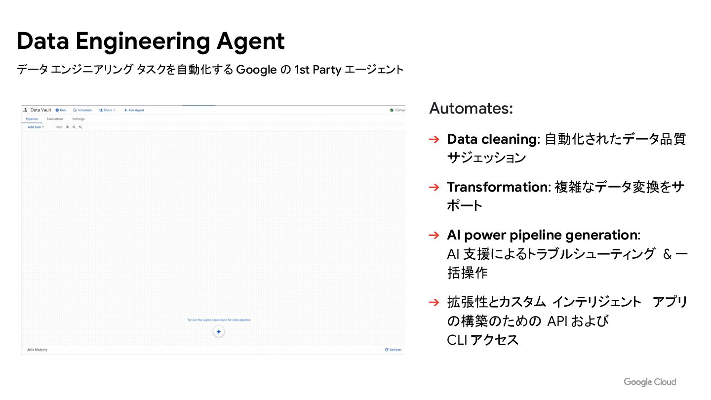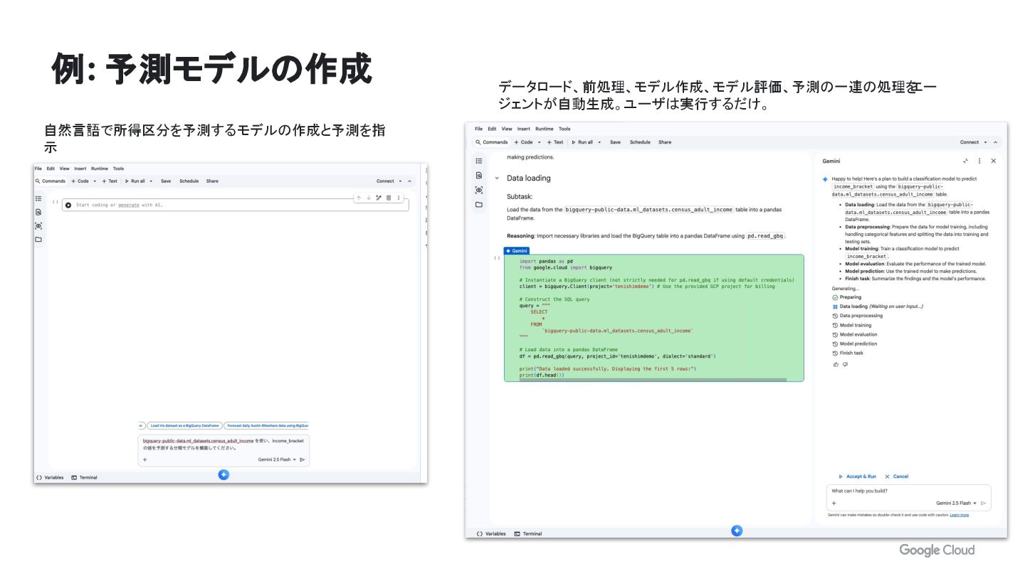 関心のある「貢献」セグメントを素早く特定 「なぜ」というビジネス上の重要な質問 に素早く 答える • なぜ先月売上が減少したのか? • どの地域とチャネルでマーケティングキャ ンペーンが最も効果的だったか? Jan March May Sales この急増を引き起こした要 因は何? データのどのセグメントか ら調査を始めるべきか? 指標が変動した理由を理解する SELECT contributors, metric_test, metric_control, difference, relative_difference, unexpected_difference, relative_unexpected_difference, apriori_support, contribution FROM ML.GET_INSIGHTS( MODEL `bqml_tutorial.iowa_liquor_sales_sum_model`);
