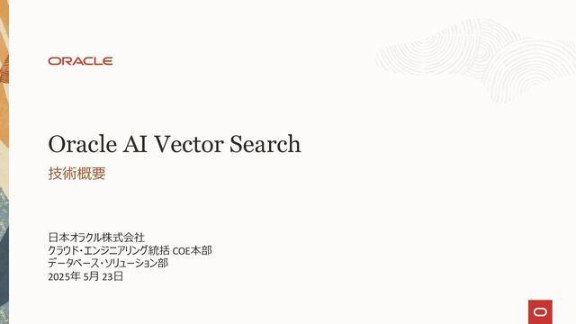 © 2025, Oracle and/or its affiliates 12 あらゆる生成AIを支える、マルチモーダルプラットフォーム 様々なデータ、検索手法を1つのデータベースでセキュアに管理 • 品質と鮮度の高いビジネスデータと、ベクトルデータを、 一つのデータベースに集約し、SQLで検索可能 • RAG精度向上の手法を、SQL機能で実現し、検索精度を向上 • ドキュメントのテキスト化からベクトル変換までデータベース内で実施 データ一貫性維持と、開発生産性向上を実現 • データベースの持つ堅牢なアクセスコントロール スケーラビリティ、高可用性 • データ整合性を保持しながら、スケールアウトを可能に • Exadata Cloudの持つ、高性能、高可用性を活用 充実のツール群 • ドキュメントローダー、テキストスプリッターのプロシージャ • ONNXモデルをインポートし、データベース内でベクトル化 • プロンプトエンジニアリングのプロシージャ 分類 価格 テキスト ベクトル(テキスト) 画像 ベクトル(画像) 0 001 ¥1,000 AAA…… 0.1, 0.2, 0.6. .... 0.5, 1.5, 2.6, .... 1 002 ¥2,000 BBB…… 0.8, 0.1, 0.4. .... 1.0, 0.9, 1.6, .... 2 003 ¥3,000 CCC…… 0.5, 0.3, 0.9. .... 0.6, 1.1, 1.3, .... SQL 7623 SQL Single Source of Truth Oracle Database 23ai AI Vector Search