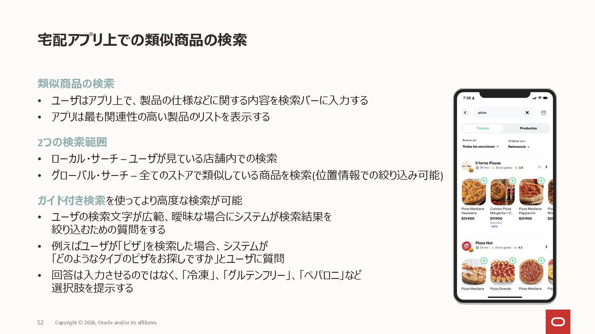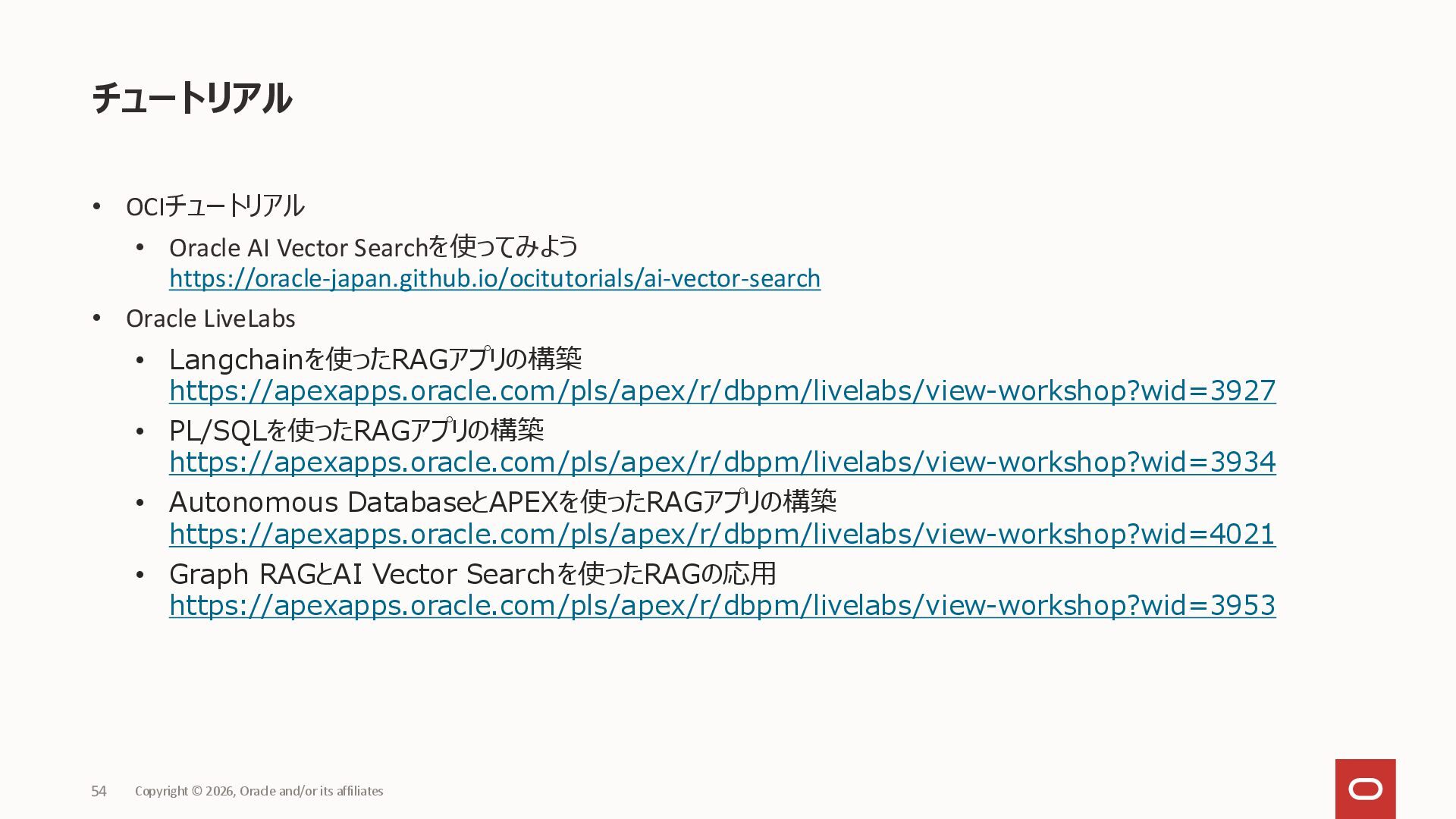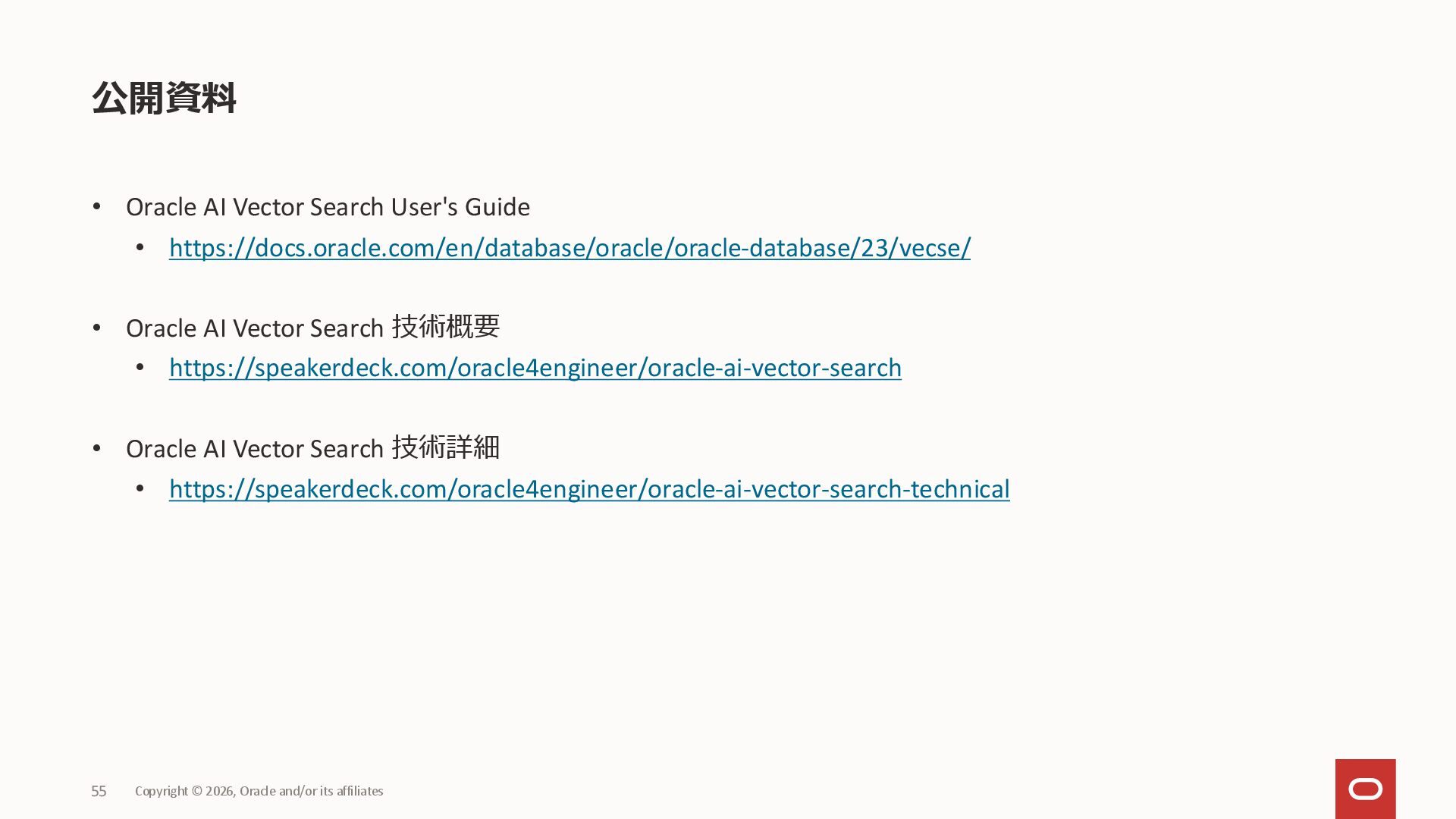 Copyright © 2026, Oracle and/or its affiliates 12 あらゆる生成AIを支える、マルチモーダルプラットフォーム 様々なデータ、検索手法を1つのデータベースでセキュアに管理 • 品質と鮮度の高いビジネスデータと、ベクトルデータを、 一つのデータベースに集約し、SQLで検索可能 • RAG精度向上の手法を、SQL機能で実現し、検索精度を向上 • ドキュメントのテキスト化からベクトル変換までデータベース内で実施 データ一貫性維持と、開発生産性向上を実現 • データベースの持つ堅牢なアクセスコントロール スケーラビリティ、高可用性 • データ整合性を保持しながら、スケールアウトを可能に • Exadata Cloudの持つ、高性能、高可用性を活用 充実のツール群 • ドキュメントローダー、テキストスプリッターのプロシージャ • ONNXモデルをインポートし、データベース内でベクトル化 • プロンプトエンジニアリングのプロシージャ 分類 価格 テキスト ベクトル(テキスト) 画像 ベクトル(画像) 0 001 ¥1,000 AAA…… 0.1, 0.2, 0.6. .... 0.5, 1.5, 2.6, .... 1 002 ¥2,000 BBB…… 0.8, 0.1, 0.4. .... 1.0, 0.9, 1.6, .... 2 003 ¥3,000 CCC…… 0.5, 0.3, 0.9. .... 0.6, 1.1, 1.3, .... SQL 7623 SQL Single Source of Truth Oracle AI Database 26ai AI Vector Search