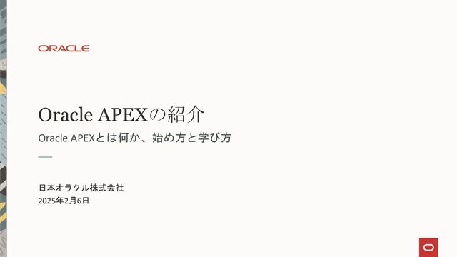 アジェンダ: 1. Oracle APEXの始め方 2. Oracle APEXとは何か 3. ページの生成 4. 開発ツール 5. コンポーネント 6. 必要な技術 7. 学習と情報の入手 8. 質問する、相談する