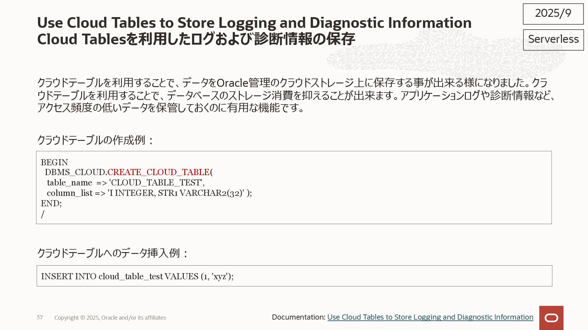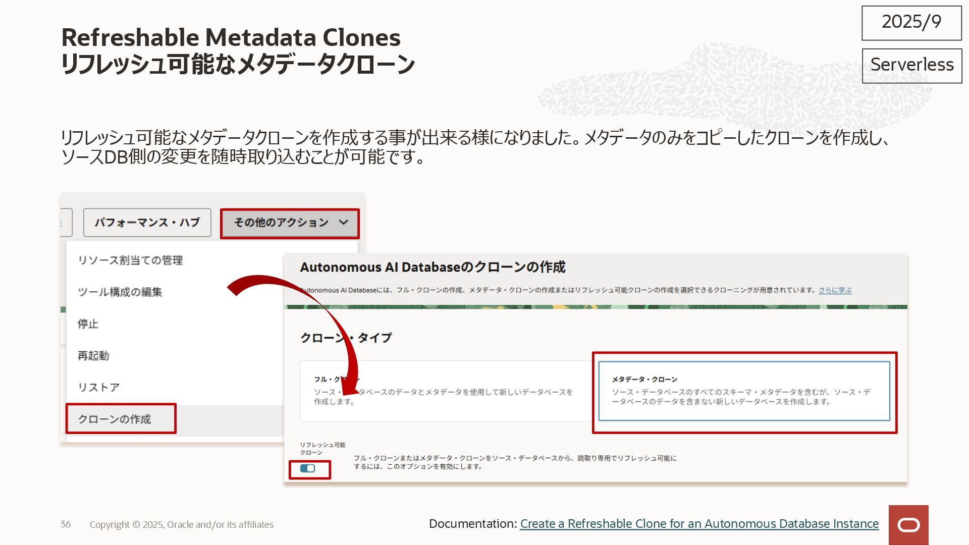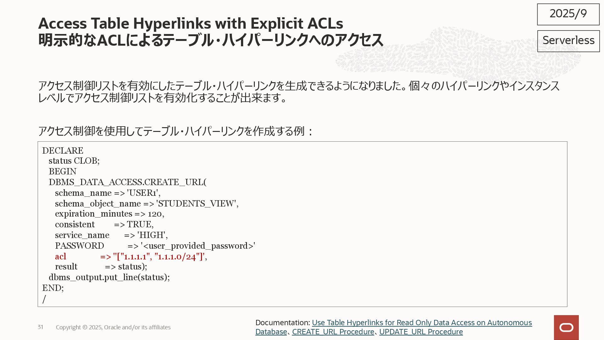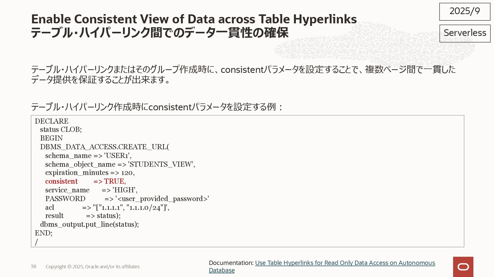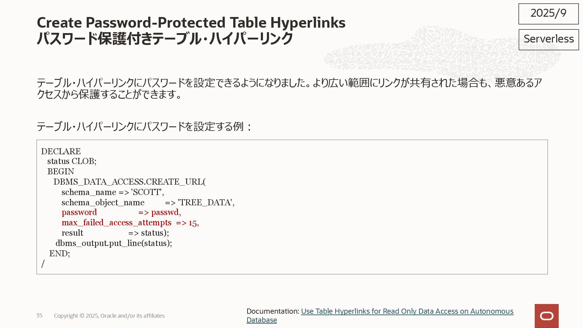 2025, Oracle and/or its affiliates 35 DECLARE status CLOB; BEGIN DBMS_DATA_ACCESS.CREATE_URL( schema_name => 'SCOTT', schema_object_name => 'TREE_DATA', password => passwd, max_failed_access_attempts => 15, result => status); dbms_output.put_line(status); END; / 2025/9 Serverless Documentation: Use Table Hyperlinks for Read Only Data Access on Autonomous Database