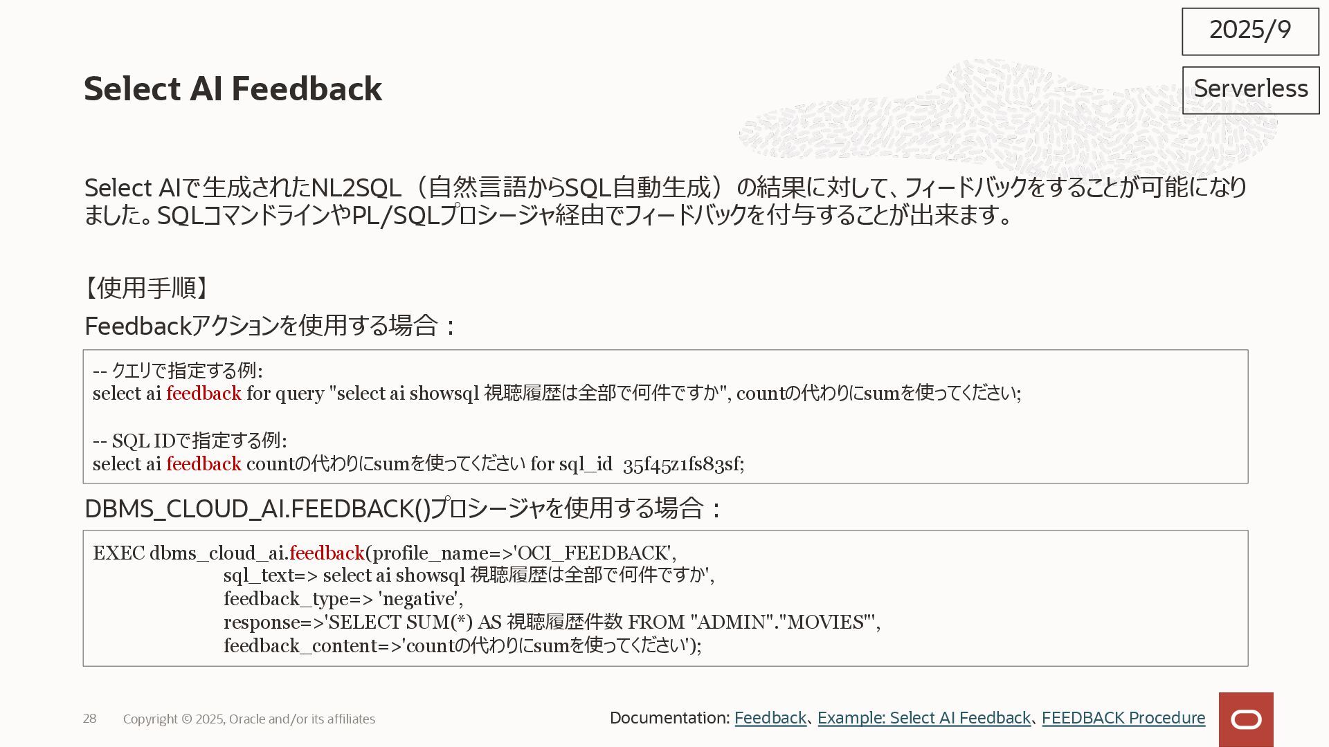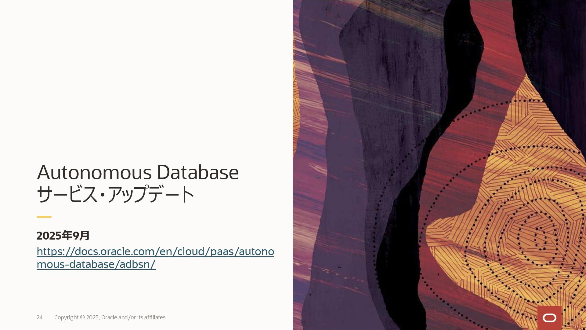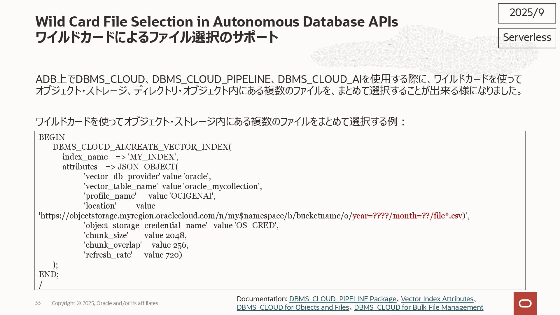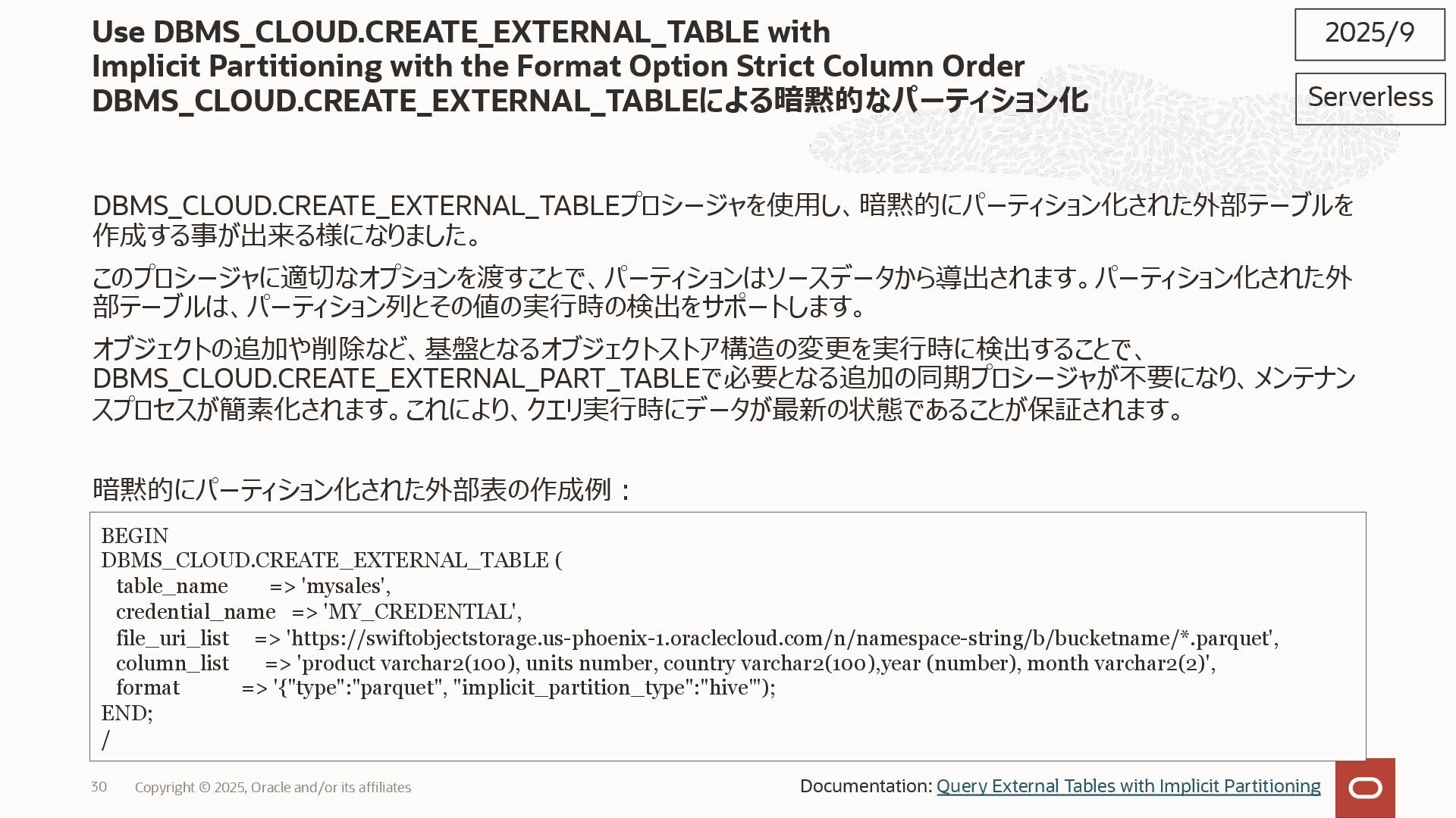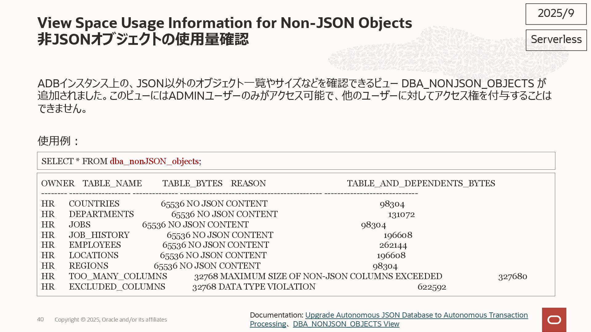 2025, Oracle and/or its affiliates 35 DECLARE status CLOB; BEGIN DBMS_DATA_ACCESS.CREATE_URL( schema_name => 'SCOTT', schema_object_name => 'TREE_DATA', password => passwd, max_failed_access_attempts => 15, result => status); dbms_output.put_line(status); END; / 2025/9 Serverless Documentation: Use Table Hyperlinks for Read Only Data Access on Autonomous Database