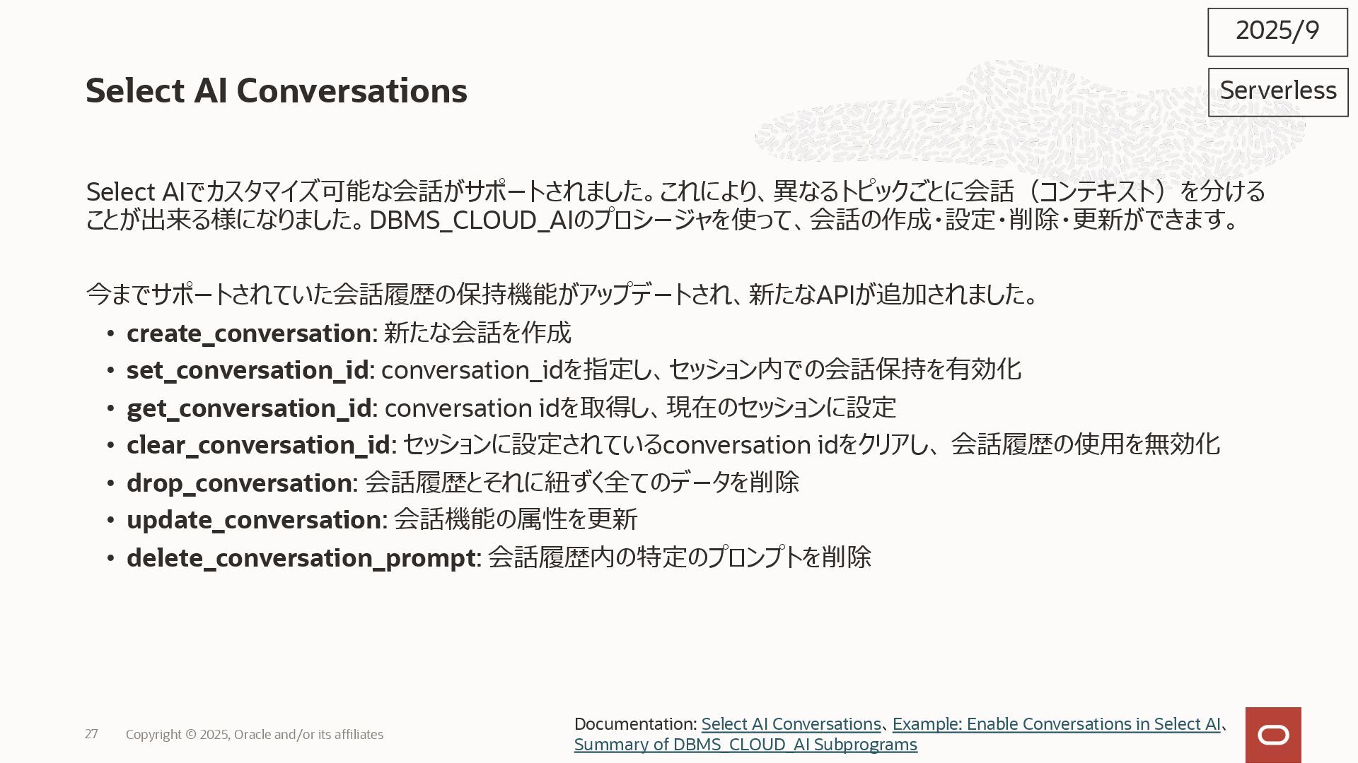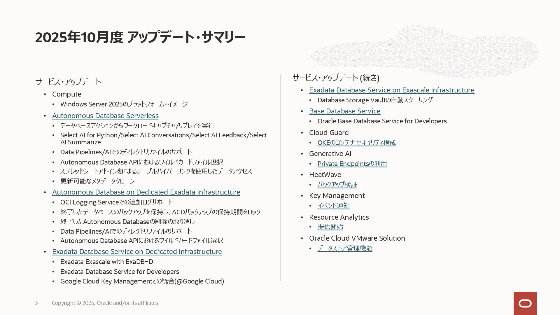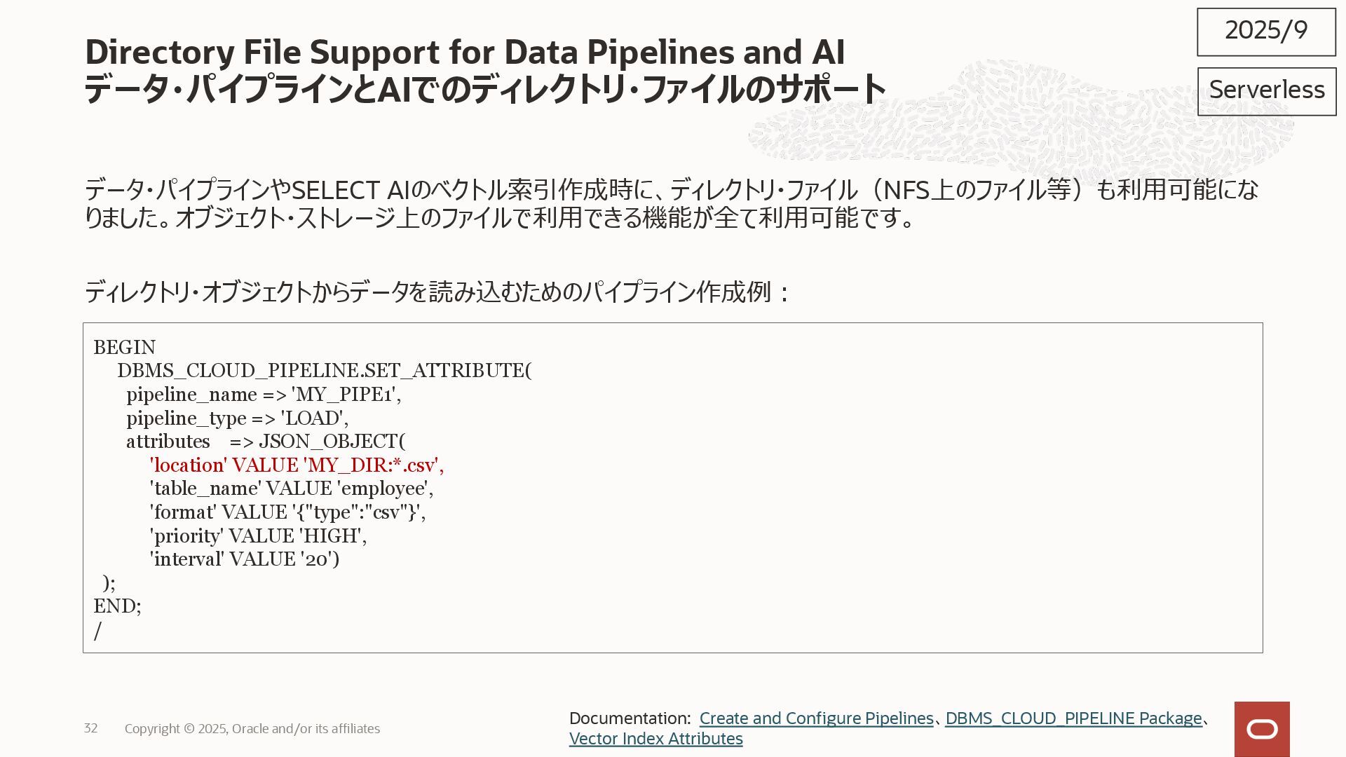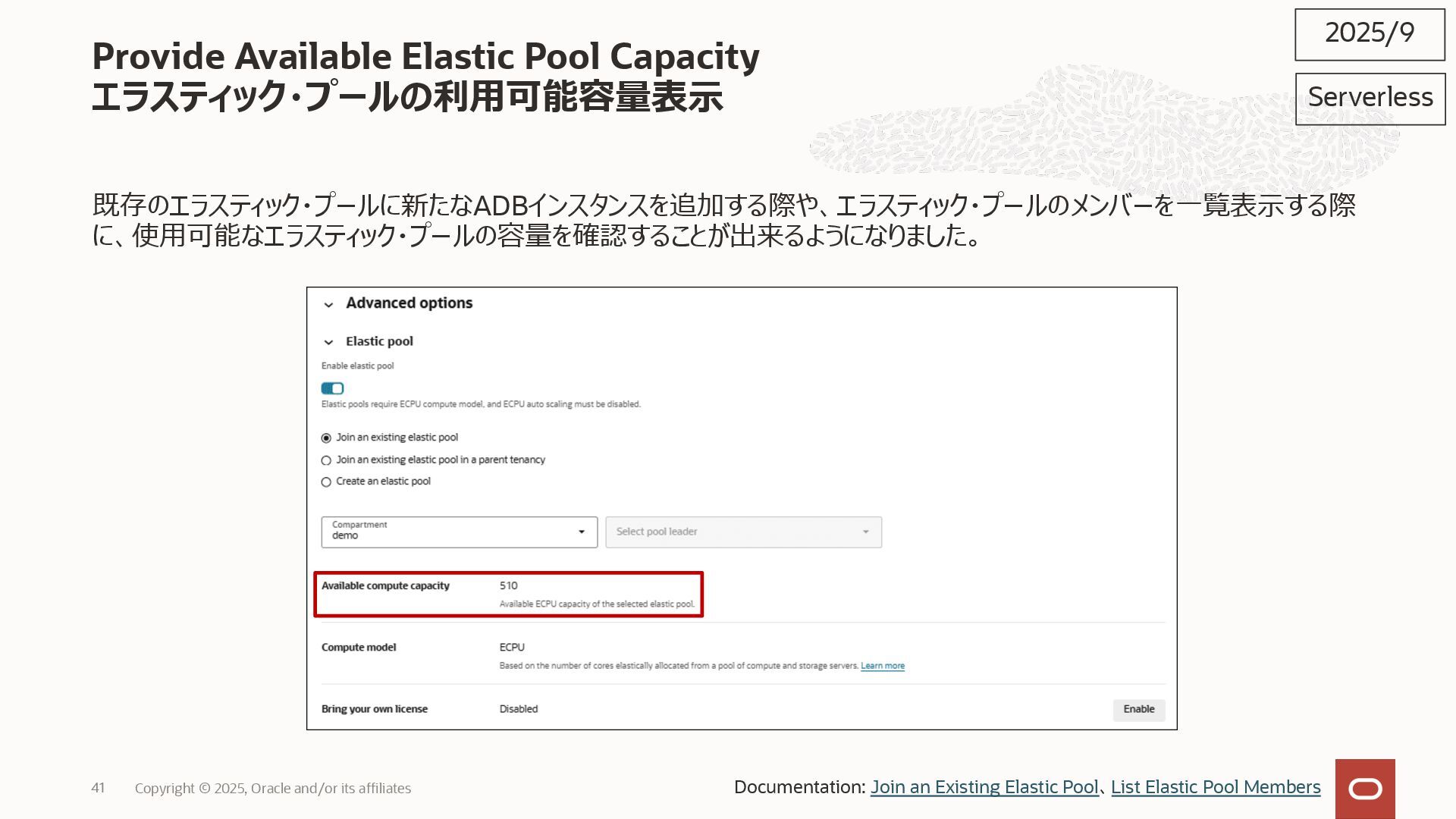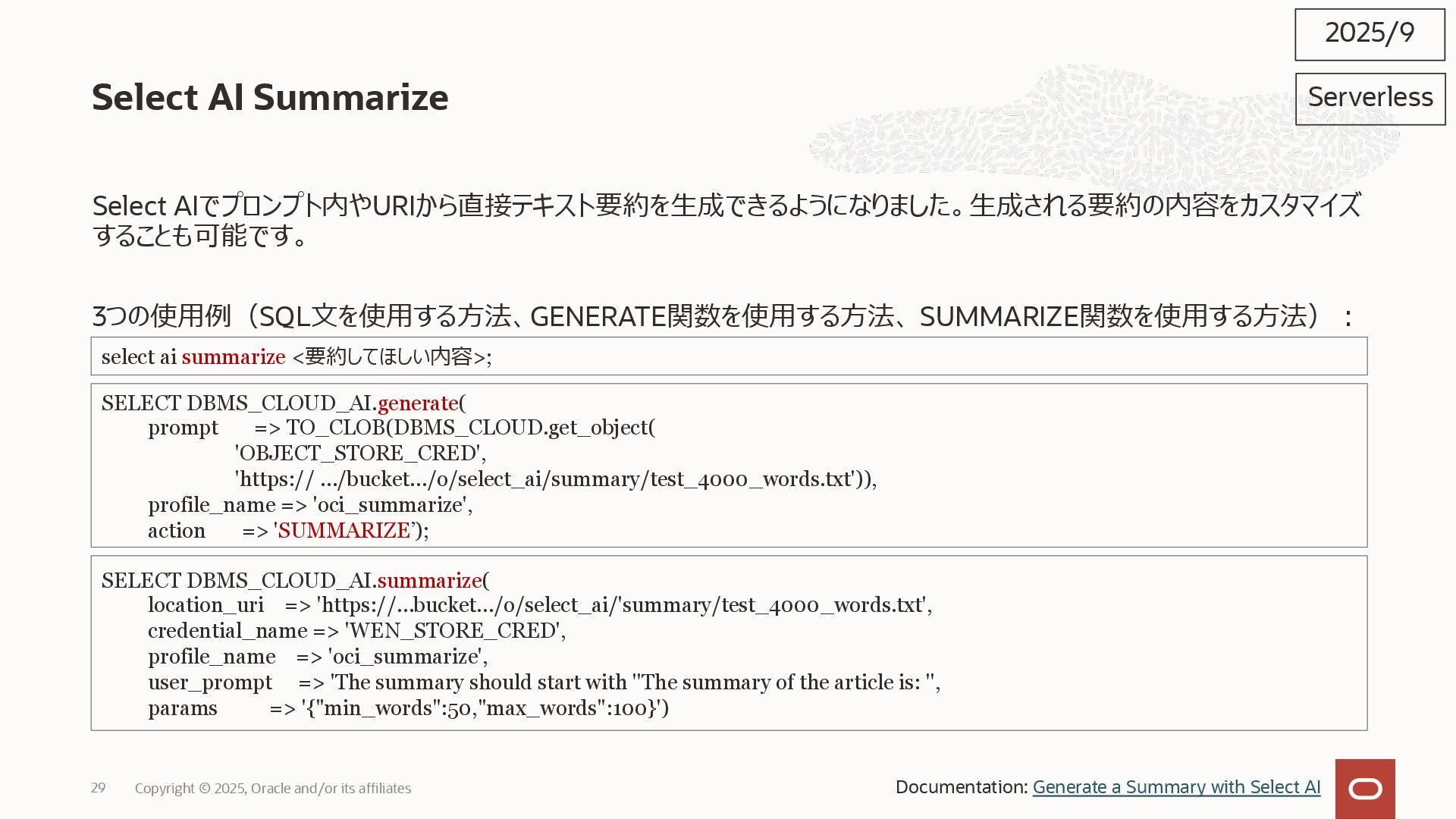 2025, Oracle and/or its affiliates 35 DECLARE status CLOB; BEGIN DBMS_DATA_ACCESS.CREATE_URL( schema_name => 'SCOTT', schema_object_name => 'TREE_DATA', password => passwd, max_failed_access_attempts => 15, result => status); dbms_output.put_line(status); END; / 2025/9 Serverless Documentation: Use Table Hyperlinks for Read Only Data Access on Autonomous Database