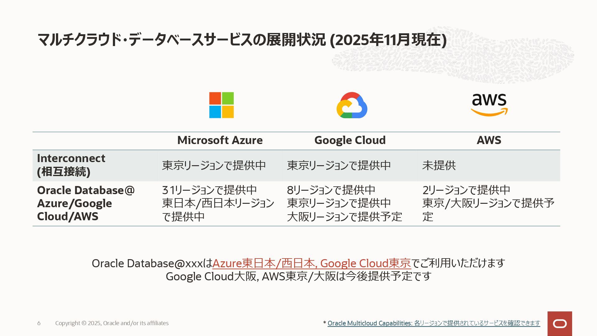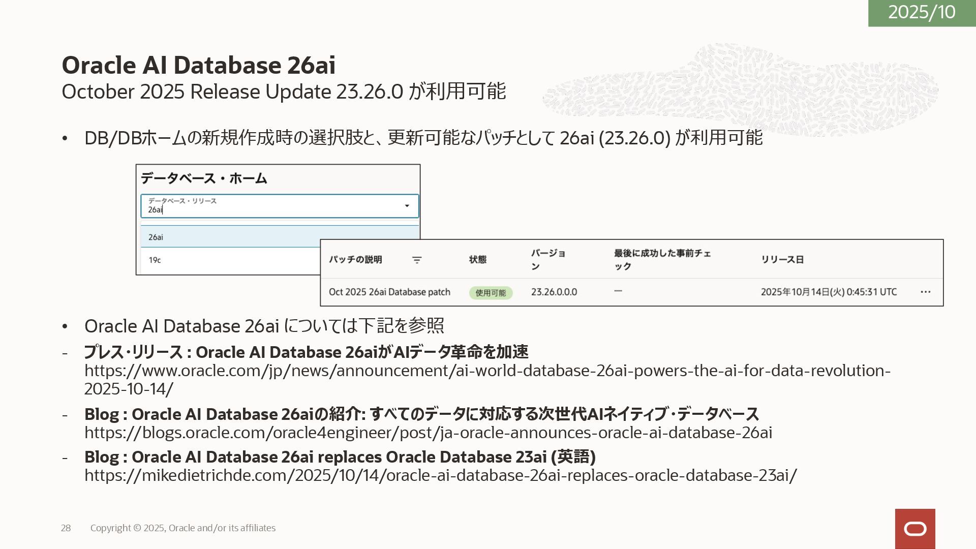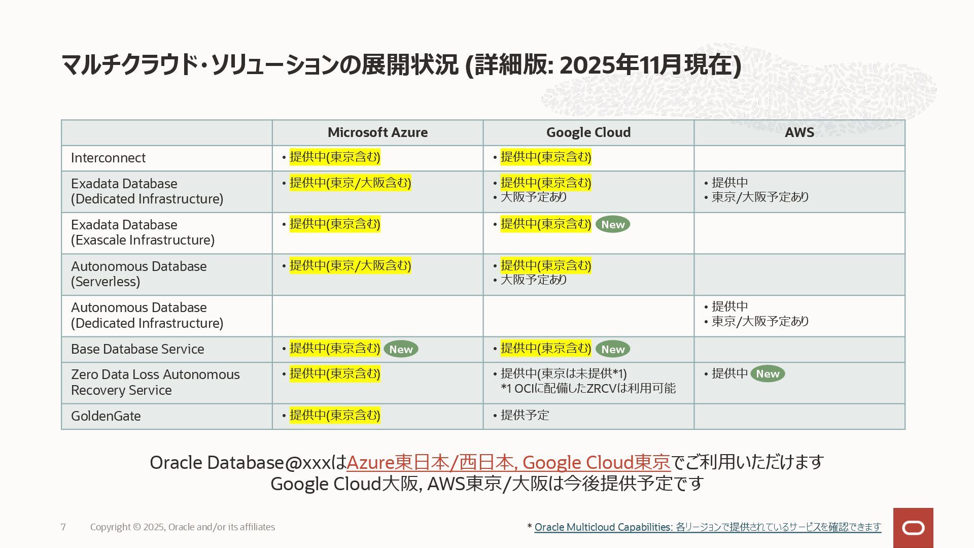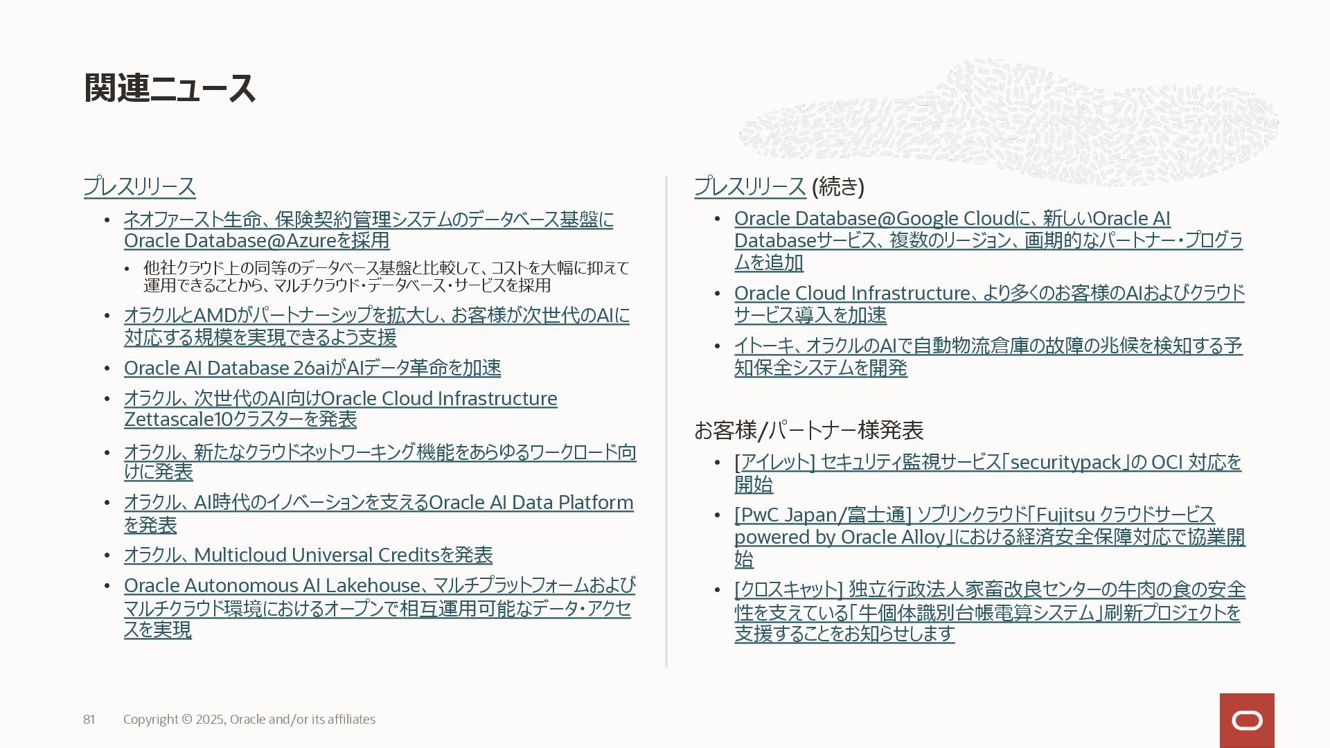 対応する規模を実現できるよう⽀援 • Oracle AI Database 26aiがAIデータ⾰命を加速 • オラクル、次世代のAI向けOracle Cloud Infrastructure Zettascale10クラスターを発表 • オラクル、新たなクラウドネットワーキング機能をあらゆるワークロード向 けに発表 • オラクル、AI時代のイノベーションを⽀えるOracle AI Data Platform を発表 • オラクル、Multicloud Universal Creditsを発表 • Oracle Autonomous AI Lakehouse、マルチプラットフォームおよび マルチクラウド環境におけるオープンで相互運⽤可能なデータ・アクセ スを実現 関連ニュース プレスリリース (続き) • Oracle Database@Google Cloudに、新しいOracle AI Databaseサービス、複数のリージョン、画期的なパートナー・プログラ ムを追加 • Oracle Cloud Infrastructure、より多くのお客様のAIおよびクラウド サービス導⼊を加速 • イトーキ、オラクルのAIで⾃動物流倉庫の故障の兆候を検知する予 知保全システムを開発 お客様/パートナー様発表 • [アイレット] セキュリティ監視サービス「securitypack」の OCI 対応を 開始 • [PwC Japan/富⼠通] ソブリンクラウド「Fujitsu クラウドサービス powered by Oracle Alloy」における経済安全保障対応で協業開 始 • [クロスキャット] 独⽴⾏政法⼈家畜改良センターの⽜⾁の⾷の安全 性を⽀えている「⽜個体識別台帳電算システム」刷新プロジェクトを ⽀援することをお知らせします Copyright © 2025, Oracle and/or its affiliates 81