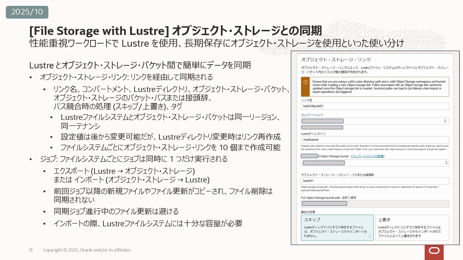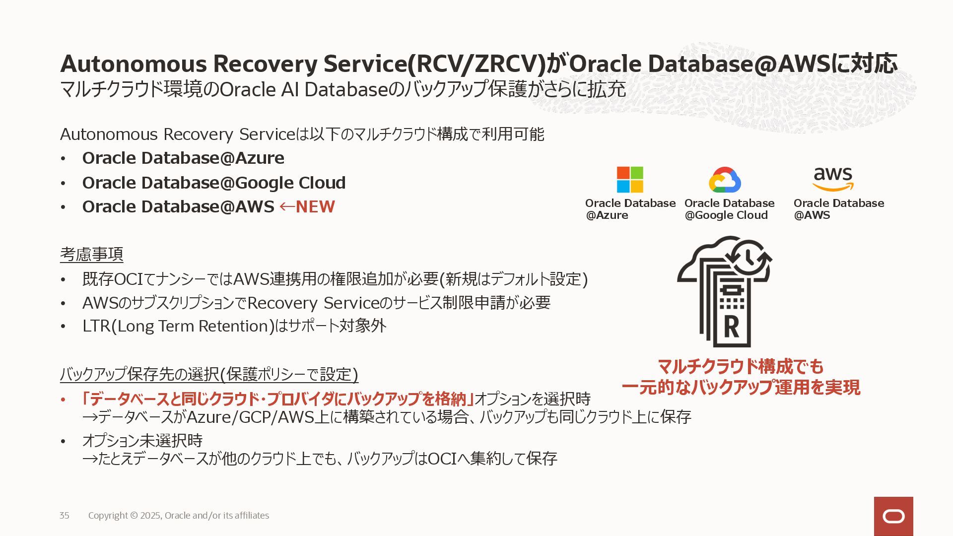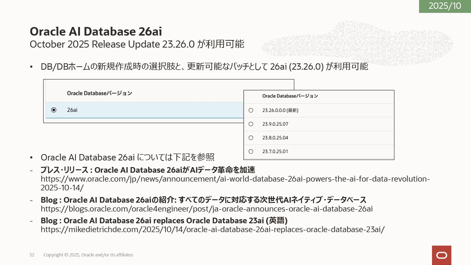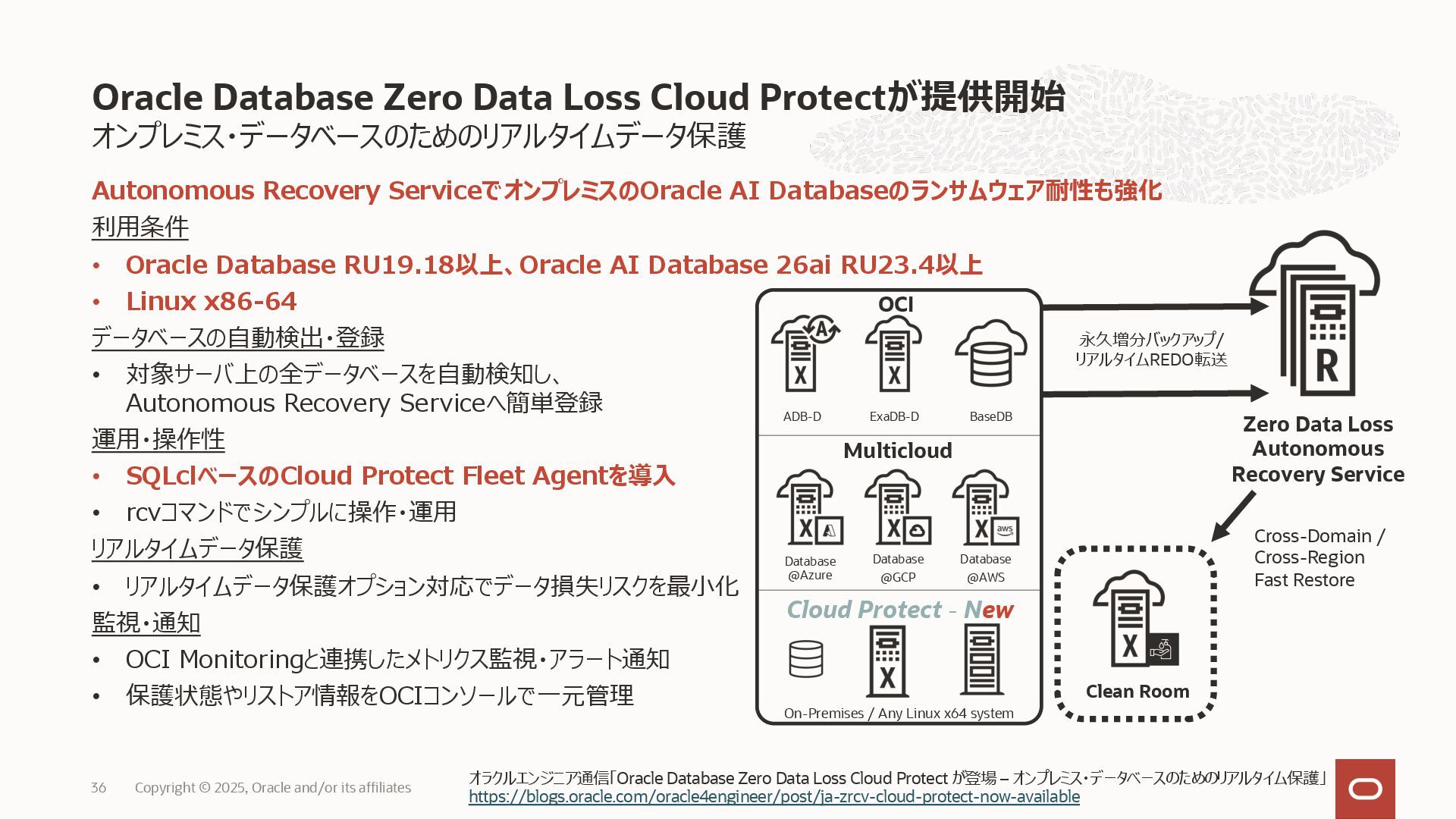 対応する規模を実現できるよう⽀援 • Oracle AI Database 26aiがAIデータ⾰命を加速 • オラクル、次世代のAI向けOracle Cloud Infrastructure Zettascale10クラスターを発表 • オラクル、新たなクラウドネットワーキング機能をあらゆるワークロード向 けに発表 • オラクル、AI時代のイノベーションを⽀えるOracle AI Data Platform を発表 • オラクル、Multicloud Universal Creditsを発表 • Oracle Autonomous AI Lakehouse、マルチプラットフォームおよび マルチクラウド環境におけるオープンで相互運⽤可能なデータ・アクセ スを実現 関連ニュース プレスリリース (続き) • Oracle Database@Google Cloudに、新しいOracle AI Databaseサービス、複数のリージョン、画期的なパートナー・プログラ ムを追加 • Oracle Cloud Infrastructure、より多くのお客様のAIおよびクラウド サービス導⼊を加速 • イトーキ、オラクルのAIで⾃動物流倉庫の故障の兆候を検知する予 知保全システムを開発 お客様/パートナー様発表 • [アイレット] セキュリティ監視サービス「securitypack」の OCI 対応を 開始 • [PwC Japan/富⼠通] ソブリンクラウド「Fujitsu クラウドサービス powered by Oracle Alloy」における経済安全保障対応で協業開 始 • [クロスキャット] 独⽴⾏政法⼈家畜改良センターの⽜⾁の⾷の安全 性を⽀えている「⽜個体識別台帳電算システム」刷新プロジェクトを ⽀援することをお知らせします Copyright © 2025, Oracle and/or its affiliates 81