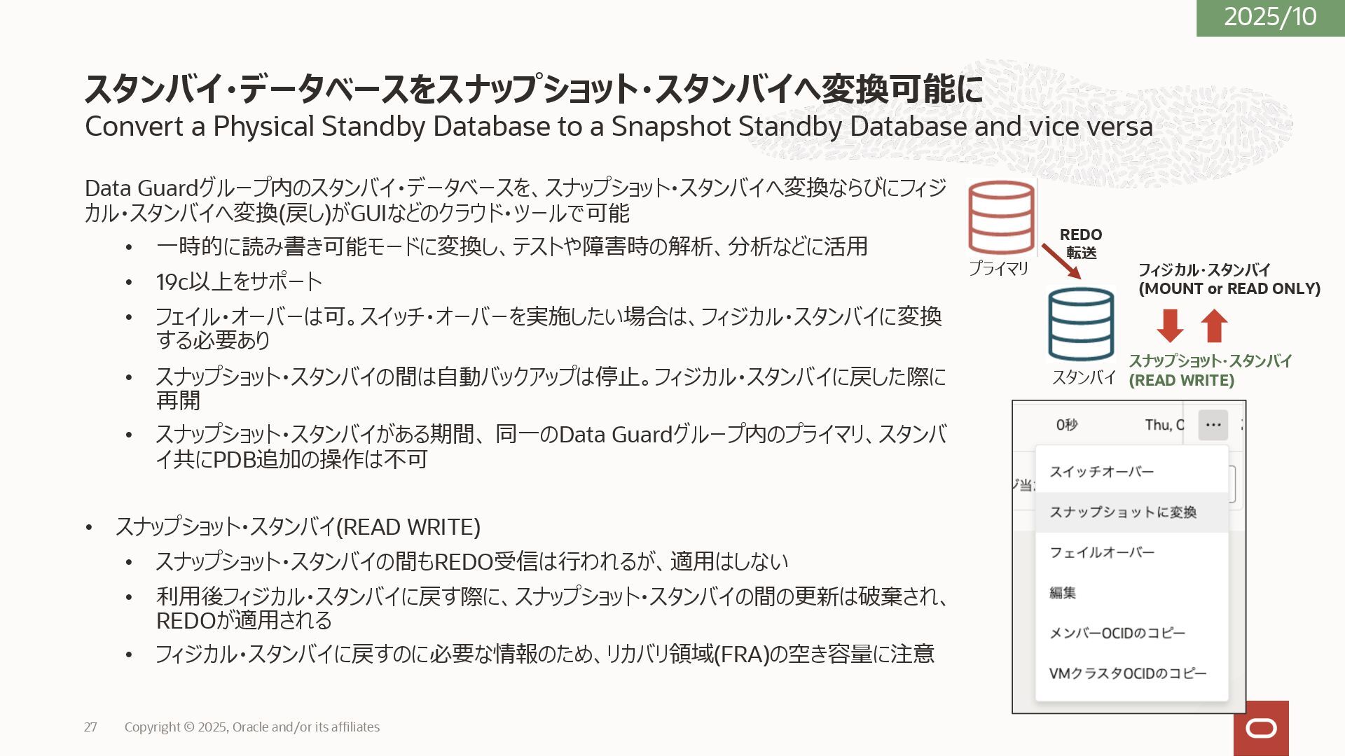 Exadata向け⾃動DRテスト(ドリル)機能の強化 スナップショット・スタンバイ機能を活⽤し、本番業務への影響を最⼩限に抑えたDRドリル検証が可能に • 物理スタンバイDBとスナップショット・スタンバイDB間の役割切り替えを⾃動実⾏ • 「DRドリル開始」「DRドリル終了」プラン作成時、必要なロール変更⼿順を⾃動で組み込んだプラン・グループを⽣成 • FSDRがこれらのプラン・グループを⼀元管理し、関連リソースも含めた⼀貫性のある運⽤テストを実現 サポート対象 ExaDB-D、ExaDB-C@C