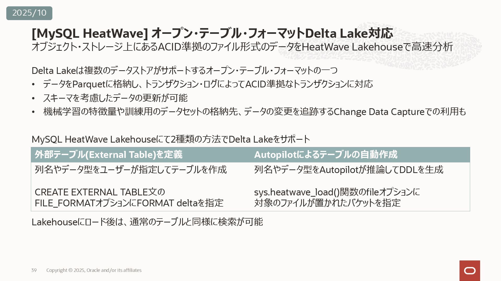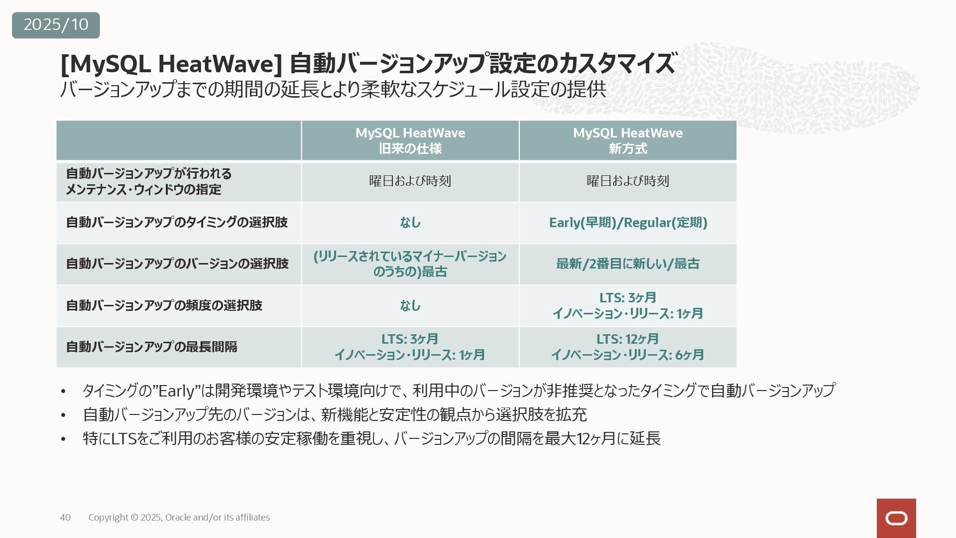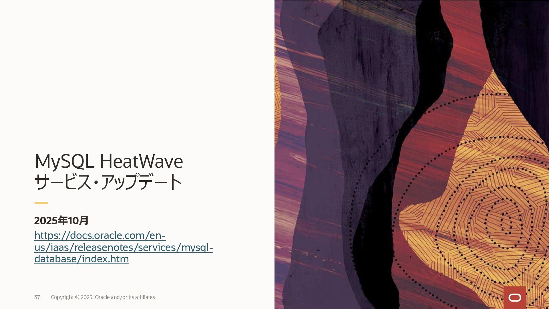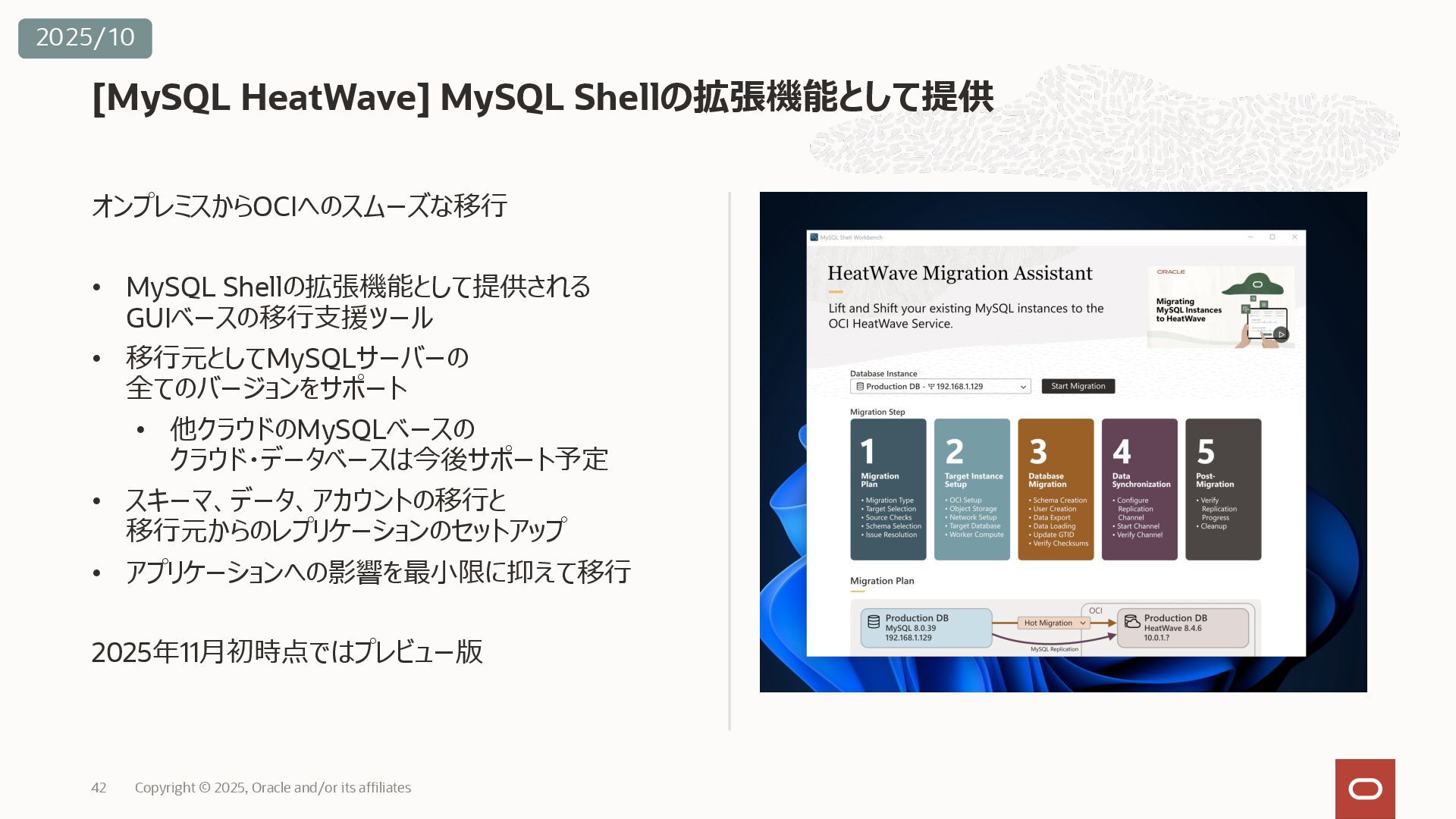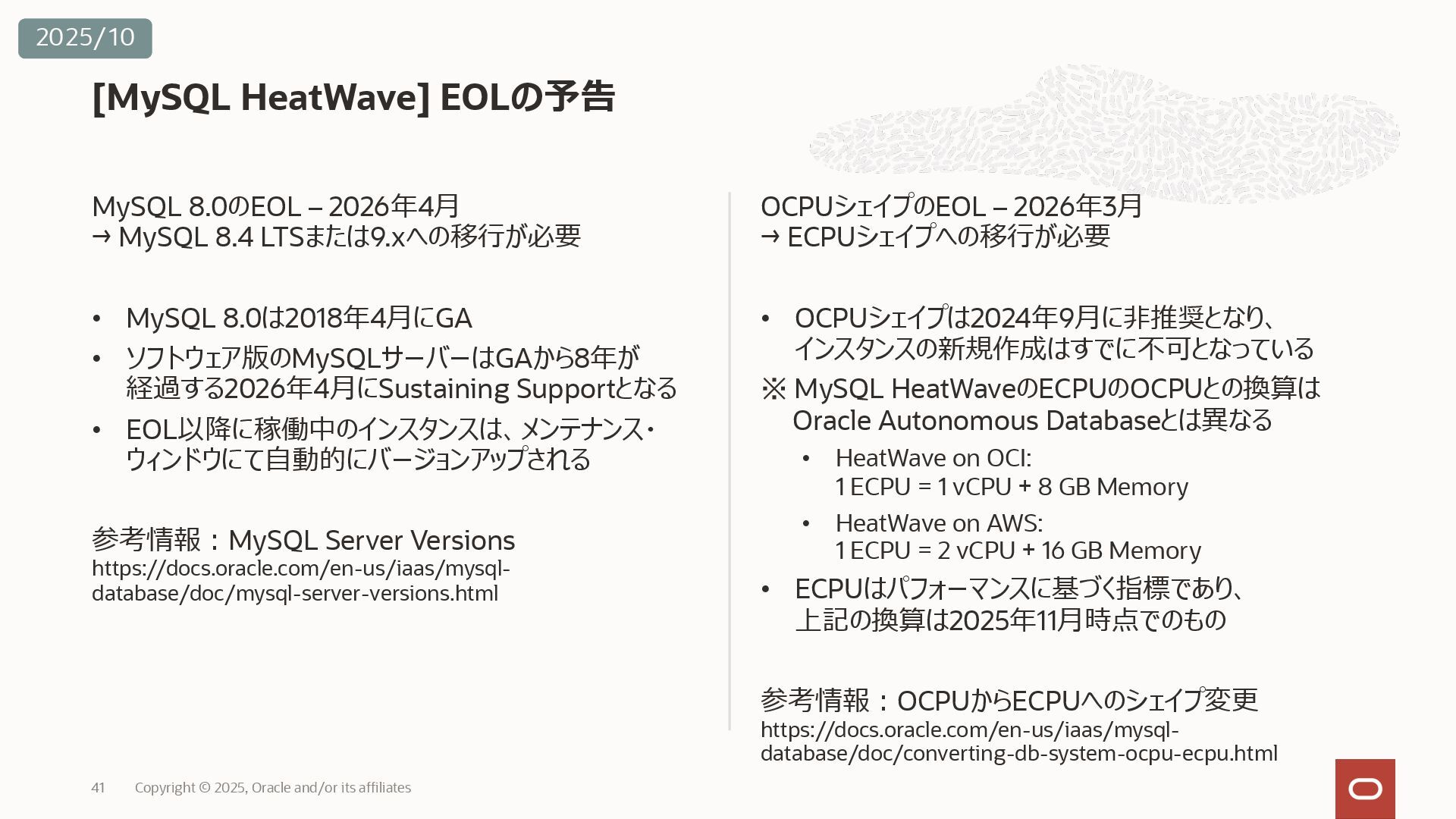 8.0は2018年4⽉にGA • ソフトウェア版のMySQLサーバーはGAから8年が 経過する2026年4⽉にSustaining Supportとなる • EOL以降に稼働中のインスタンスは、メンテナンス・ ウィンドウにて⾃動的にバージョンアップされる 参考情報︓MySQL Server Versions https://docs.oracle.com/en-us/iaas/mysql- database/doc/mysql-server-versions.html [MySQL HeatWave] EOLの予告 2025/10 OCPUシェイプのEOL – 2026年3⽉ → ECPUシェイプへの移⾏が必要 • OCPUシェイプは2024年9⽉に⾮推奨となり、 インスタンスの新規作成はすでに不可となっている ※ MySQL HeatWaveのECPUのOCPUとの換算は Oracle Autonomous Databaseとは異なる • HeatWave on OCI: 1 ECPU = 1 vCPU + 8 GB Memory • HeatWave on AWS: 1 ECPU = 2 vCPU + 16 GB Memory • ECPUはパフォーマンスに基づく指標であり、 上記の換算は2025年11⽉時点でのもの 参考情報︓OCPUからECPUへのシェイプ変更 https://docs.oracle.com/en-us/iaas/mysql- database/doc/converting-db-system-ocpu-ecpu.html Copyright © 2025, Oracle and/or its affiliates 41