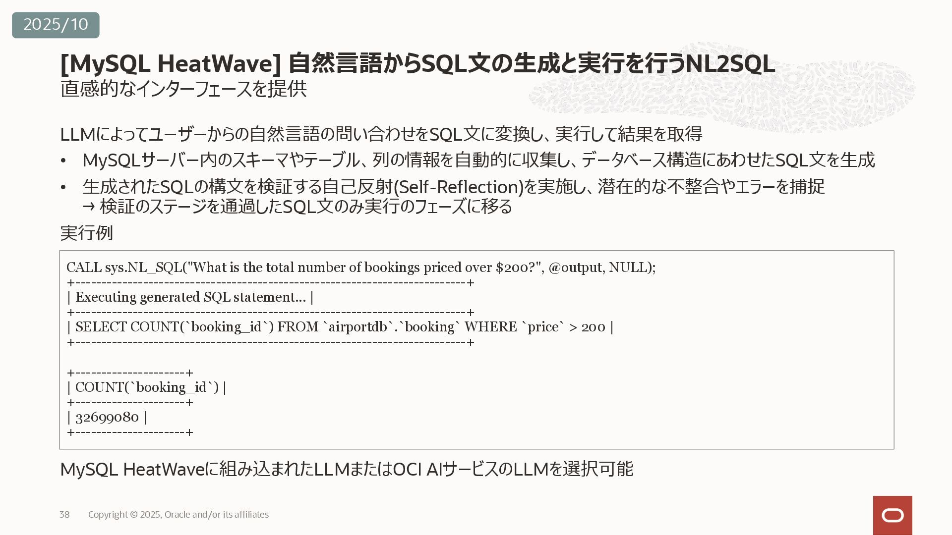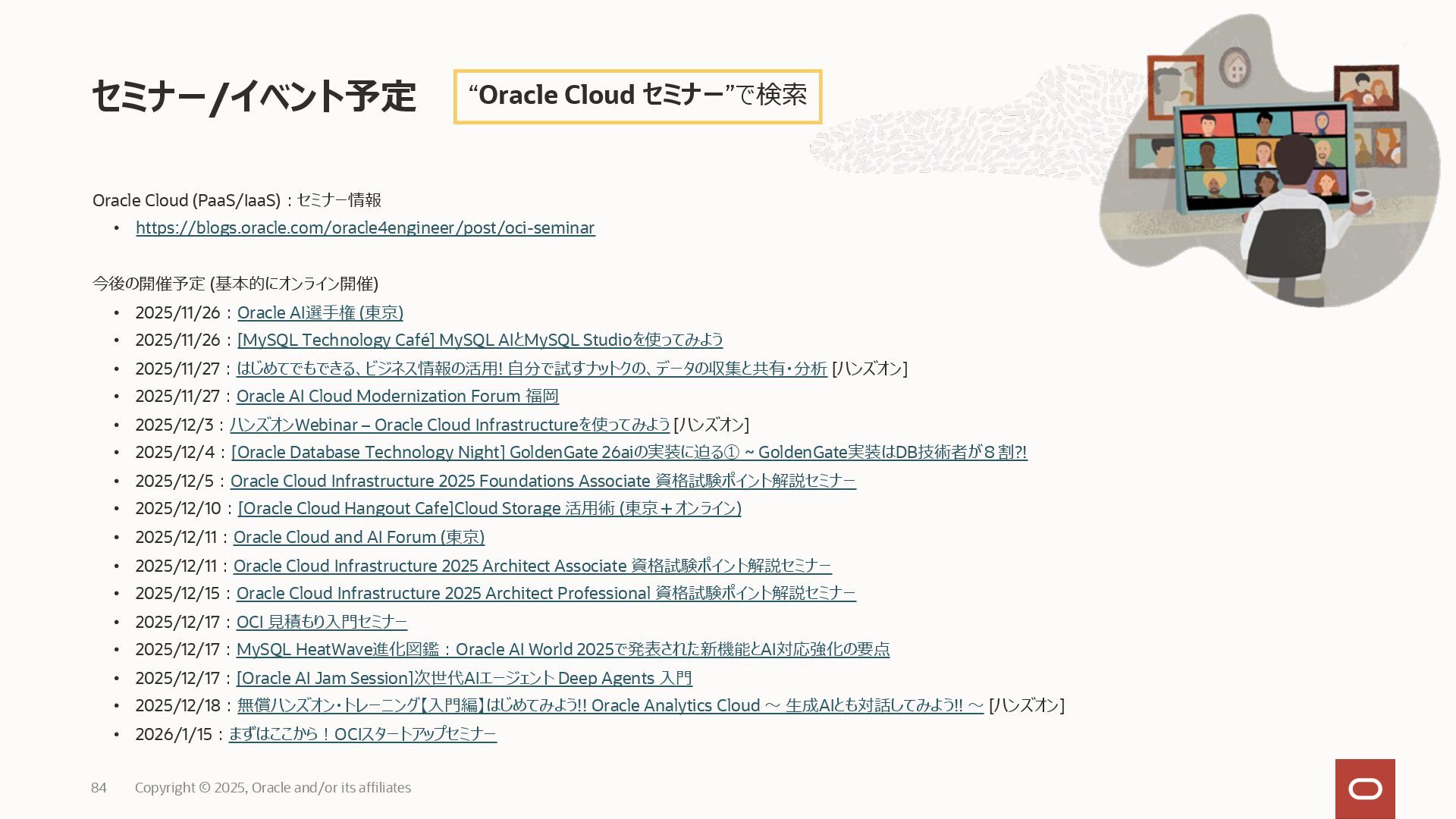 (東京) • 2025/11/26︓[MySQL Technology Café] MySQL AIとMySQL Studioを使ってみよう • 2025/11/27︓はじめてでもできる、ビジネス情報の活⽤! ⾃分で試すナットクの、データの収集と共有・分析 [ハンズオン] • 2025/11/27︓Oracle AI Cloud Modernization Forum 福岡 • 2025/12/3︓ハンズオンWebinar – Oracle Cloud Infrastructureを使ってみよう [ハンズオン] • 2025/12/4︓[Oracle Database Technology Night] GoldenGate 26aiの実装に迫る① ~ GoldenGate実装はDB技術者が8割?! • 2025/12/5︓Oracle Cloud Infrastructure 2025 Foundations Associate 資格試験ポイント解説セミナー • 2025/12/10︓[Oracle Cloud Hangout Cafe]Cloud Storage 活⽤術 (東京+オンライン) • 2025/12/11︓Oracle Cloud and AI Forum (東京) • 2025/12/11︓Oracle Cloud Infrastructure 2025 Architect Associate 資格試験ポイント解説セミナー • 2025/12/15︓Oracle Cloud Infrastructure 2025 Architect Professional 資格試験ポイント解説セミナー • 2025/12/17︓OCI ⾒積もり⼊⾨セミナー • 2025/12/17︓MySQL HeatWave進化図鑑︓Oracle AI World 2025で発表された新機能とAI対応強化の要点 • 2025/12/17︓[Oracle AI Jam Session]次世代AIエージェント Deep Agents ⼊⾨ • 2025/12/18︓無償ハンズオン・トレーニング【⼊⾨編】はじめてみよう!! Oracle Analytics Cloud 〜 ⽣成AIとも対話してみよう!! 〜 [ハンズオン] • 2026/1/15︓まずはここから︕OCIスタートアップセミナー セミナー/イベント予定 “Oracle Cloud セミナー”で検索 Copyright © 2025, Oracle and/or its affiliates 84