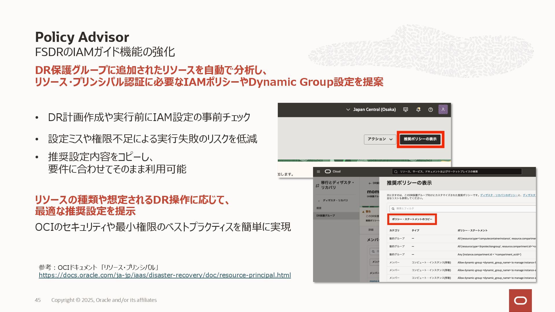 推奨設定内容をコピーし、 要件に合わせてそのまま利⽤可能 リソースの種類や想定されるDR操作に応じて、 最適な推奨設定を提⽰ OCIのセキュリティや最⼩権限のベストプラクティスを簡単に実現 FSDRのIAMガイド機能の強化 参考︓OCIドキュメント 「リソース・プリンシパル」 https://docs.oracle.com/ja-jp/iaas/disaster-recovery/doc/resource-principal.html Copyright © 2025, Oracle and/or its affiliates 45