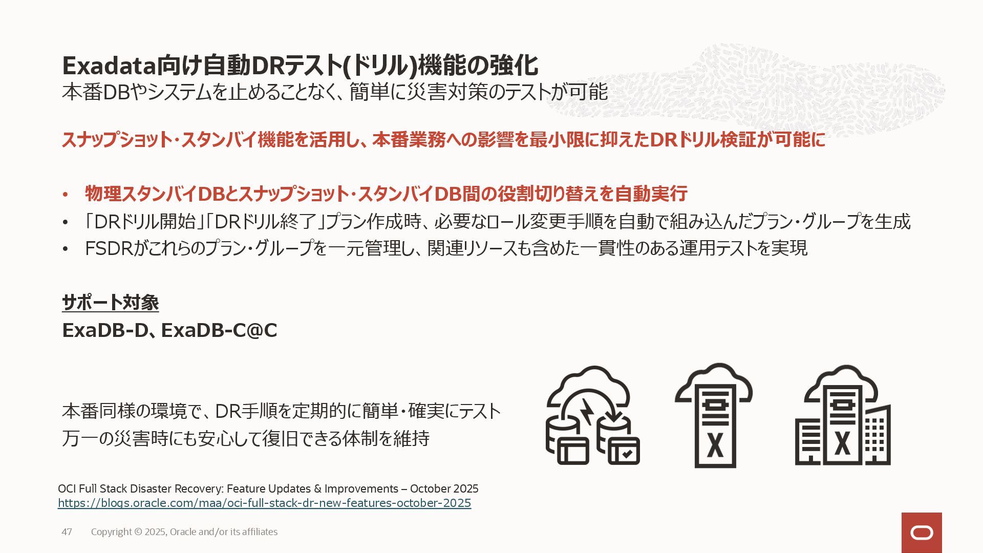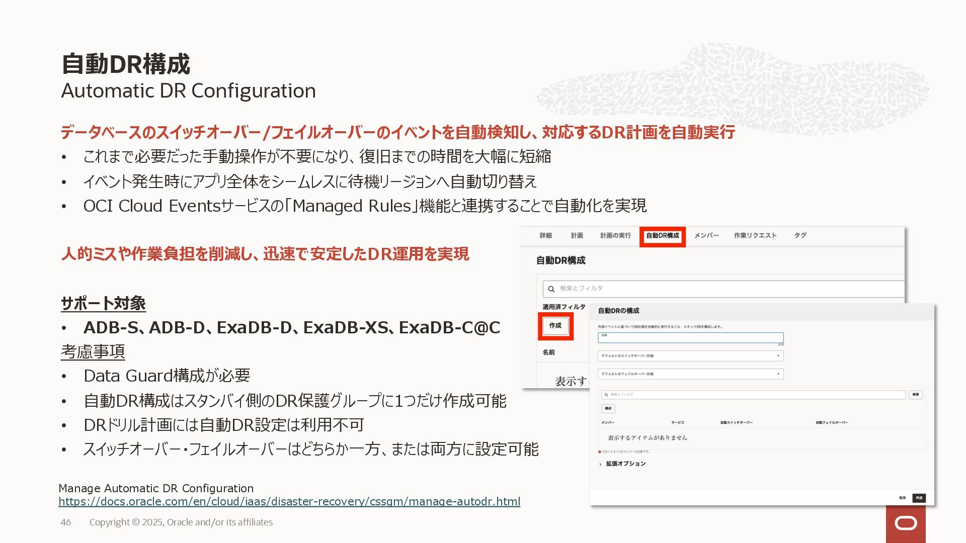 Rules」機能と連携することで⾃動化を実現 ⼈的ミスや作業負担を削減し、迅速で安定したDR運⽤を実現 サポート対象 • ADB-S、ADB-D、ExaDB-D、ExaDB-XS、ExaDB-C@C 考慮事項 • Data Guard構成が必要 • ⾃動DR構成はスタンバイ側のDR保護グループに1つだけ作成可能 • DRドリル計画には⾃動DR設定は利⽤不可 • スイッチオーバー・フェイルオーバーはどちらか⼀⽅、または両⽅に設定可能 Automatic DR Configuration Manage Automatic DR Configuration https://docs.oracle.com/en/cloud/iaas/disaster-recovery/cssgm/manage-autodr.html Copyright © 2025, Oracle and/or its affiliates 46
