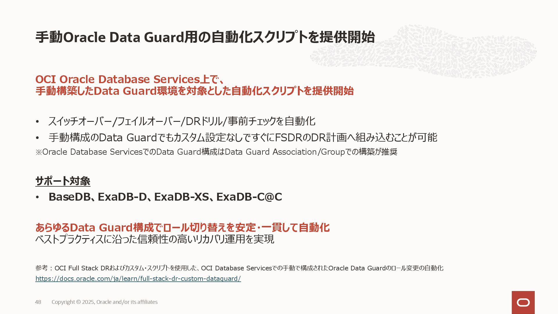 Guardでもカスタム設定なしですぐにFSDRのDR計画へ組み込むことが可能 ※Oracle Database ServicesでのData Guard構成はData Guard Association/Groupでの構築が推奨 サポート対象 • BaseDB、ExaDB-D、ExaDB-XS、ExaDB-C@C あらゆるData Guard構成でロール切り替えを安定・⼀貫して⾃動化 ベストプラクティスに沿った信頼性の⾼いリカバリ運⽤を実現 参考︓OCI Full Stack DRおよびカスタム・スクリプトを使⽤した、OCI Database Servicesでの⼿動で構成されたOracle Data Guardのロール変更の⾃動化 https://docs.oracle.com/ja/learn/full-stack-dr-custom-dataguard/ ⼿動Oracle Data Guard⽤の⾃動化スクリプトを提供開始 Copyright © 2025, Oracle and/or its affiliates 48