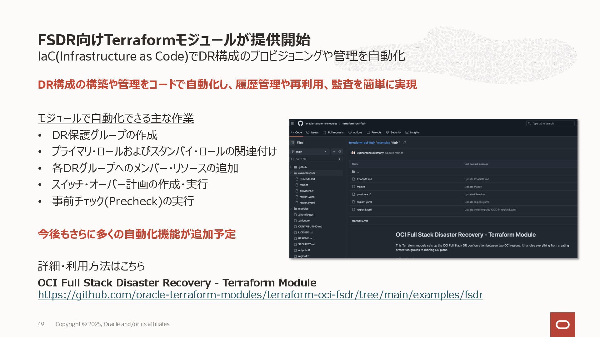 スイッチ・オーバー計画の作成・実⾏ • 事前チェック(Precheck)の実⾏ 今後もさらに多くの⾃動化機能が追加予定 詳細・利⽤⽅法はこちら OCI Full Stack Disaster Recovery - Terraform Module https://github.com/oracle-terraform-modules/terraform-oci-fsdr/tree/main/examples/fsdr IaC(Infrastructure as Code)でDR構成のプロビジョニングや管理を⾃動化 Copyright © 2025, Oracle and/or its affiliates 49