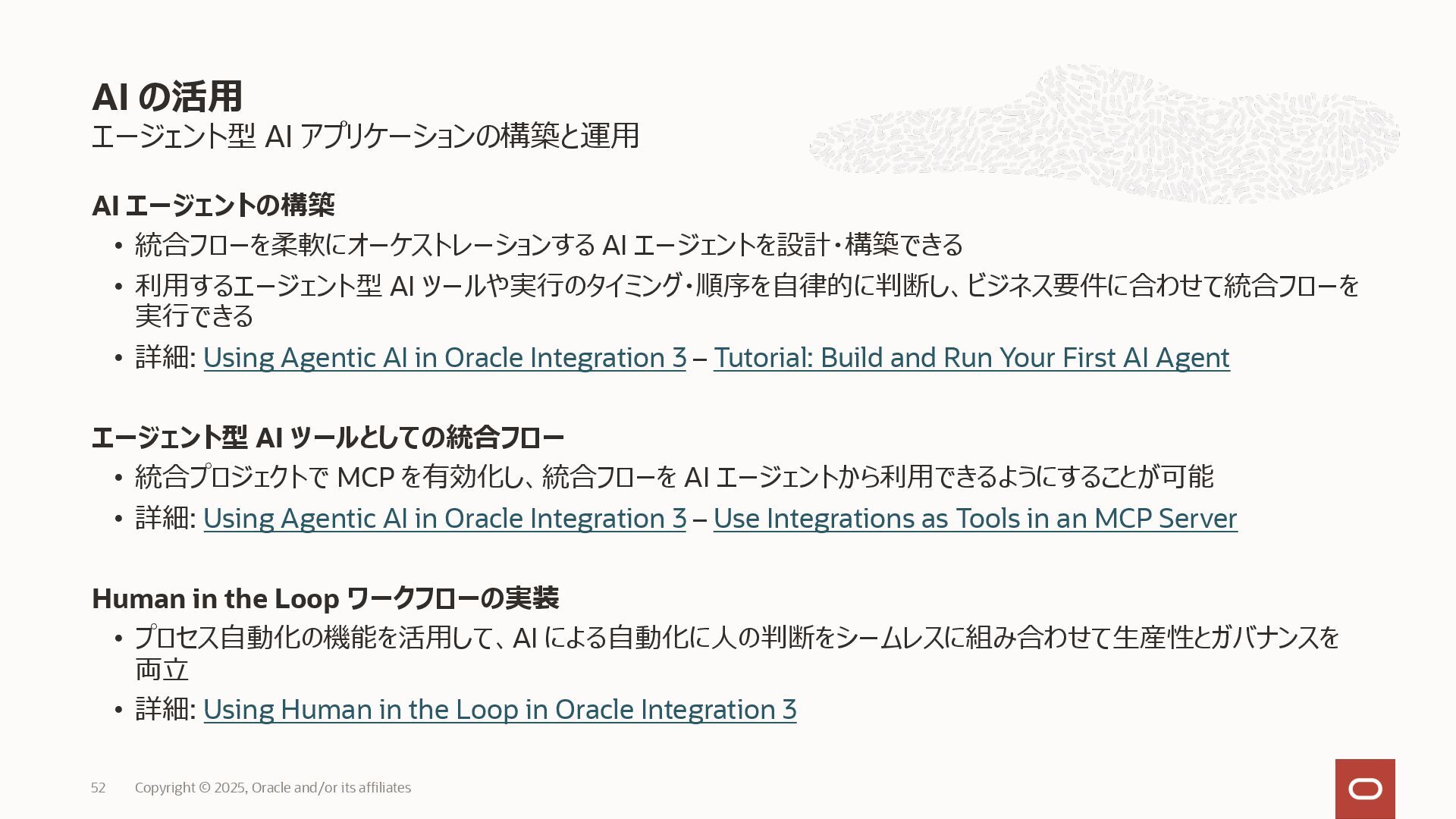 AI ツールや実⾏のタイミング・順序を⾃律的に判断し、ビジネス要件に合わせて統合フローを 実⾏できる • 詳細: Using Agentic AI in Oracle Integration 3 – Tutorial: Build and Run Your First AI Agent エージェント型 AI ツールとしての統合フロー • 統合プロジェクトで MCP を有効化し、統合フローを AI エージェントから利⽤できるようにすることが可能 • 詳細: Using Agentic AI in Oracle Integration 3 – Use Integrations as Tools in an MCP Server Human in the Loop ワークフローの実装 • プロセス⾃動化の機能を活⽤して、AI による⾃動化に⼈の判断をシームレスに組み合わせて⽣産性とガバナンスを 両⽴ • 詳細: Using Human in the Loop in Oracle Integration 3 エージェント型 AI アプリケーションの構築と運⽤ Copyright © 2025, Oracle and/or its affiliates 52