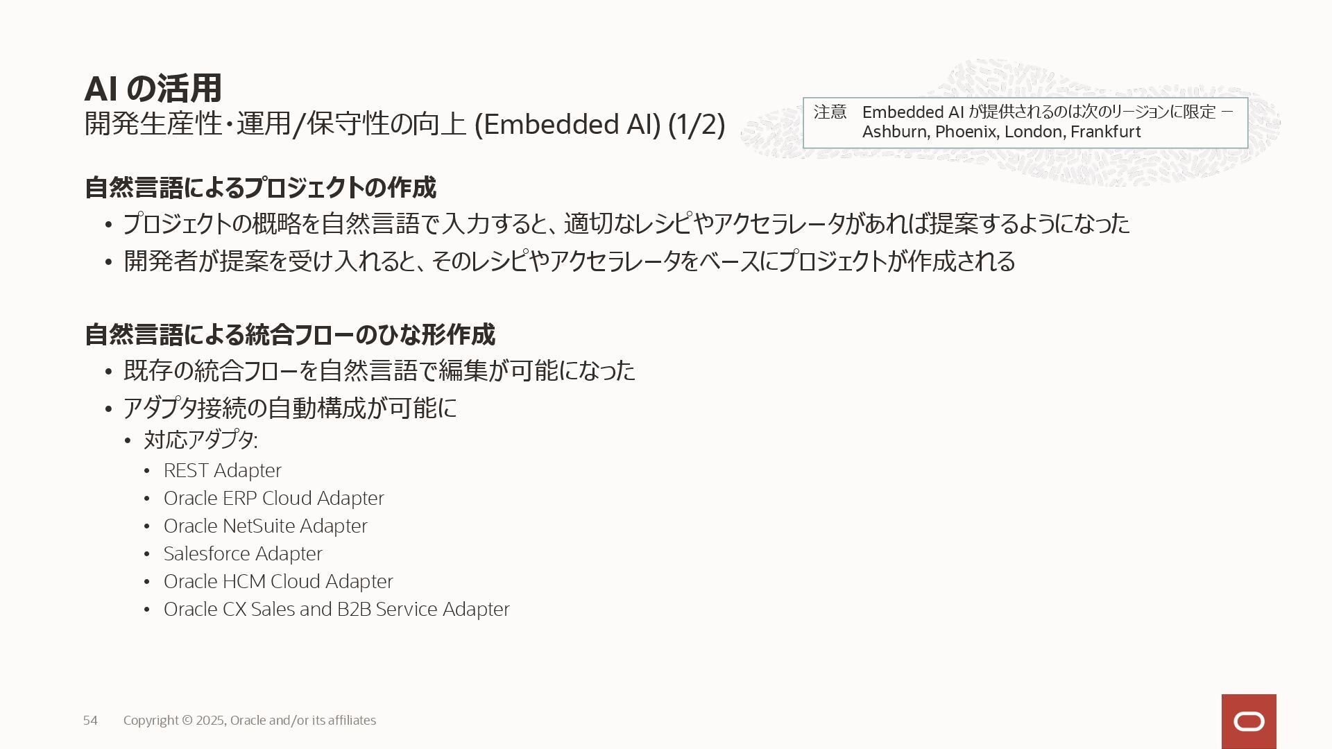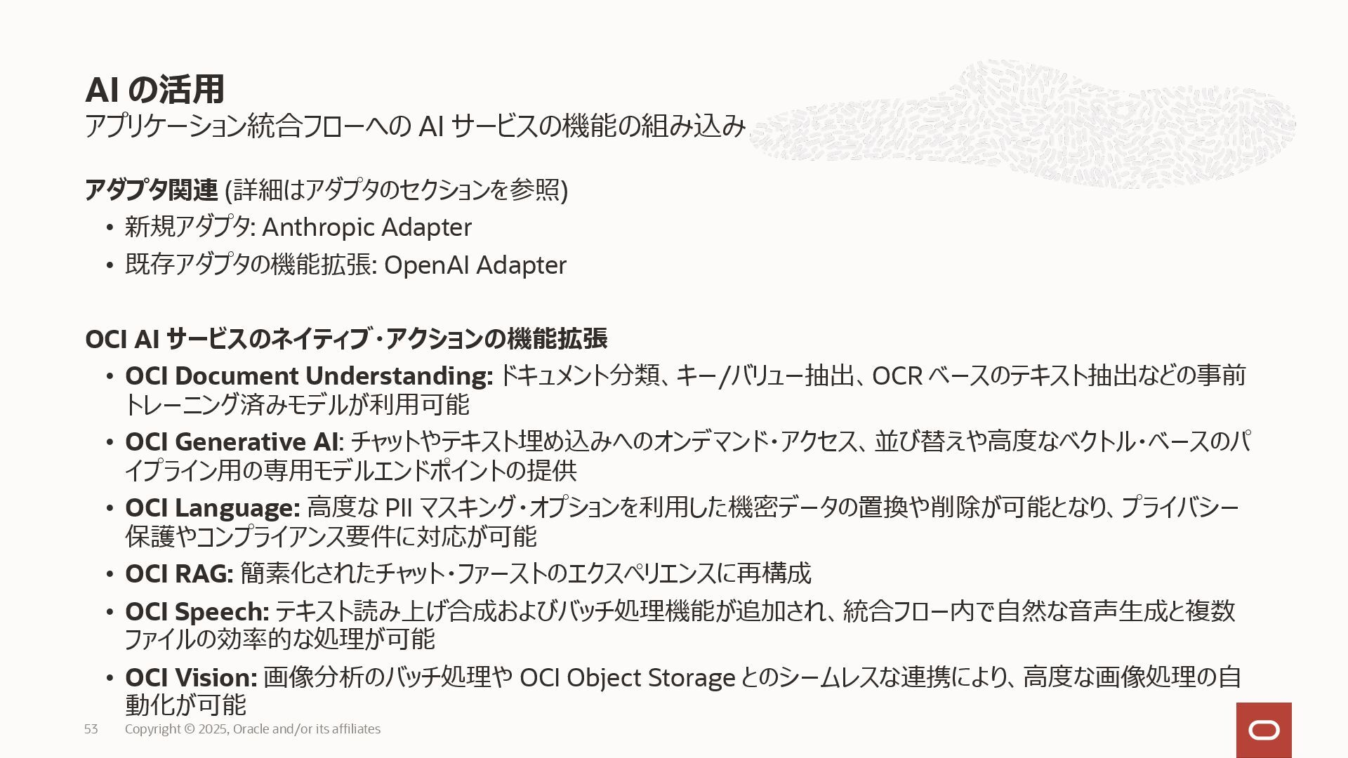 OpenAI Adapter OCI AI サービスのネイティブ・アクションの機能拡張 • OCI Document Understanding: ドキュメント分類、キー/バリュー抽出、OCR ベースのテキスト抽出などの事前 トレーニング済みモデルが利⽤可能 • OCI Generative AI: チャットやテキスト埋め込みへのオンデマンド・アクセス、並び替えや⾼度なベクトル・ベースのパ イプライン⽤の専⽤モデルエンドポイントの提供 • OCI Language: ⾼度な PII マスキング・オプションを利⽤した機密データの置換や削除が可能となり、プライバシー 保護やコンプライアンス要件に対応が可能 • OCI RAG: 簡素化されたチャット・ファーストのエクスペリエンスに再構成 • OCI Speech: テキスト読み上げ合成およびバッチ処理機能が追加され、統合フロー内で⾃然な⾳声⽣成と複数 ファイルの効率的な処理が可能 • OCI Vision: 画像分析のバッチ処理や OCI Object Storage とのシームレスな連携により、⾼度な画像処理の⾃ 動化が可能 アプリケーション統合フローへの AI サービスの機能の組み込み Copyright © 2025, Oracle and/or its affiliates 53