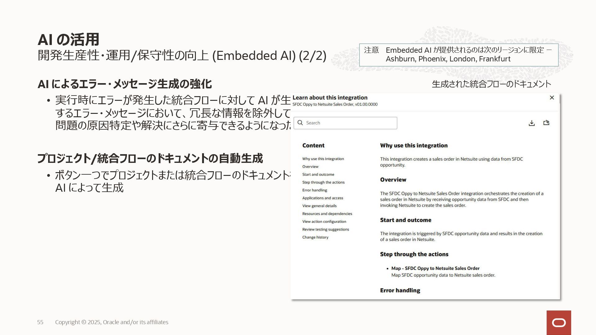 • アダプタ接続の⾃動構成が可能に • 対応アダプタ: • REST Adapter • Oracle ERP Cloud Adapter • Oracle NetSuite Adapter • Salesforce Adapter • Oracle HCM Cloud Adapter • Oracle CX Sales and B2B Service Adapter 開発⽣産性・運⽤/保守性の向上 (Embedded AI) (1/2) 注意 Embedded AI が提供されるのは次のリージョンに限定 ー Ashburn, Phoenix, London, Frankfurt Copyright © 2025, Oracle and/or its affiliates 54