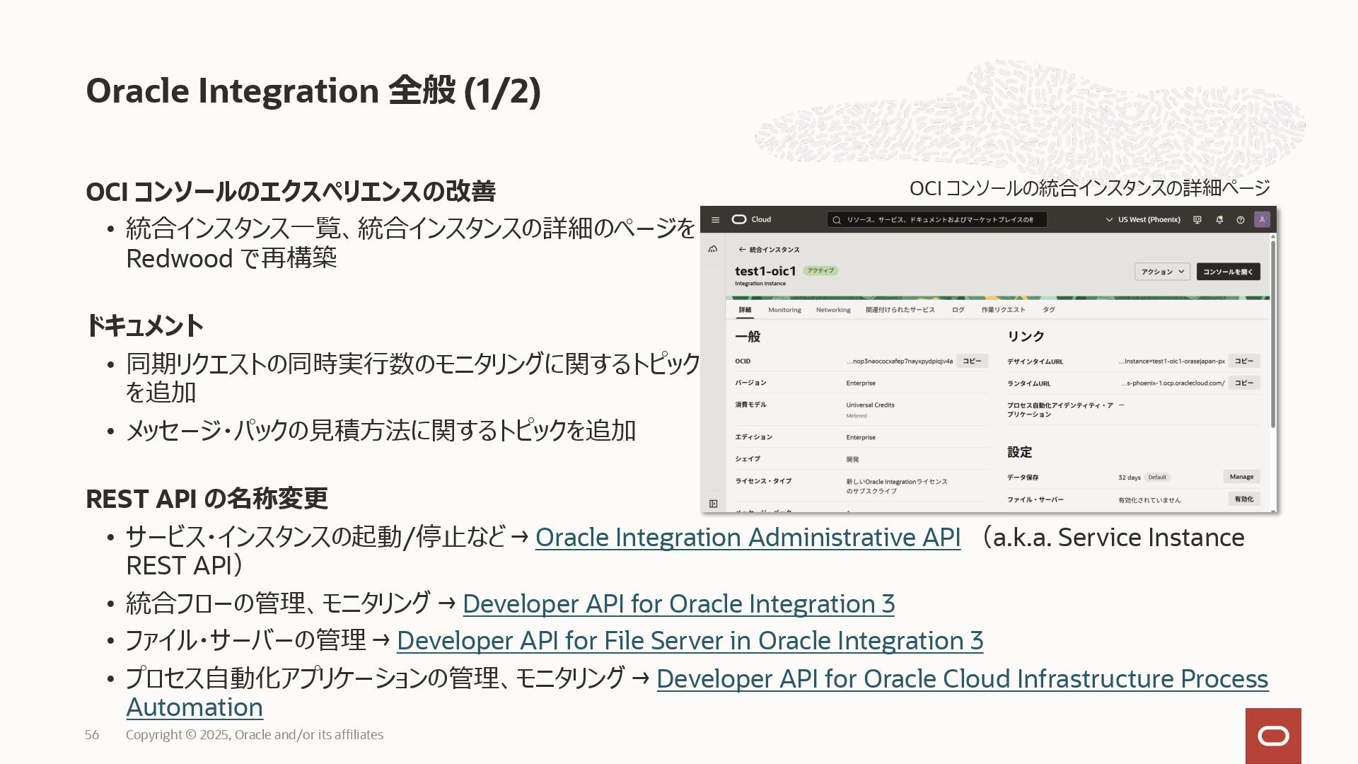 ドキュメント • 同期リクエストの同時実⾏数のモニタリングに関するトピック を追加 • メッセージ・パックの⾒積⽅法に関するトピックを追加 REST API の名称変更 • サービス・インスタンスの起動/停⽌など → Oracle Integration Administrative API (a.k.a. Service Instance REST API) • 統合フローの管理、モニタリング → Developer API for Oracle Integration 3 • ファイル・サーバーの管理 → Developer API for File Server in Oracle Integration 3 • プロセス⾃動化アプリケーションの管理、モニタリング → Developer API for Oracle Cloud Infrastructure Process Automation OCI コンソールの統合インスタンスの詳細ページ Copyright © 2025, Oracle and/or its affiliates 56