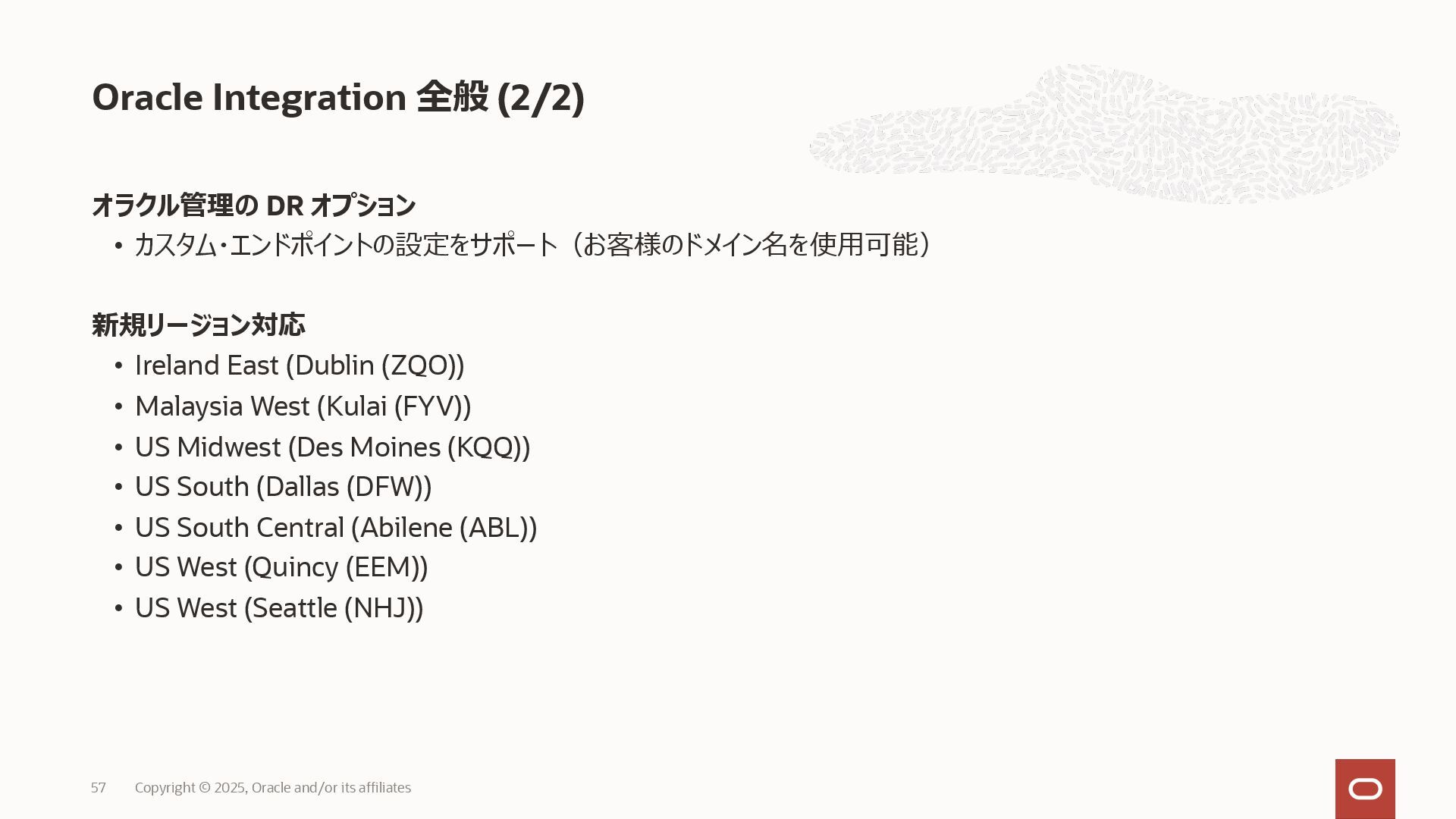 Oracle Integration 全般 (2/2) オラクル管理の DR オプション • カスタム・エンドポイントの設定をサポート(お客様のドメイン名を使⽤可能) 新規リージョン対応