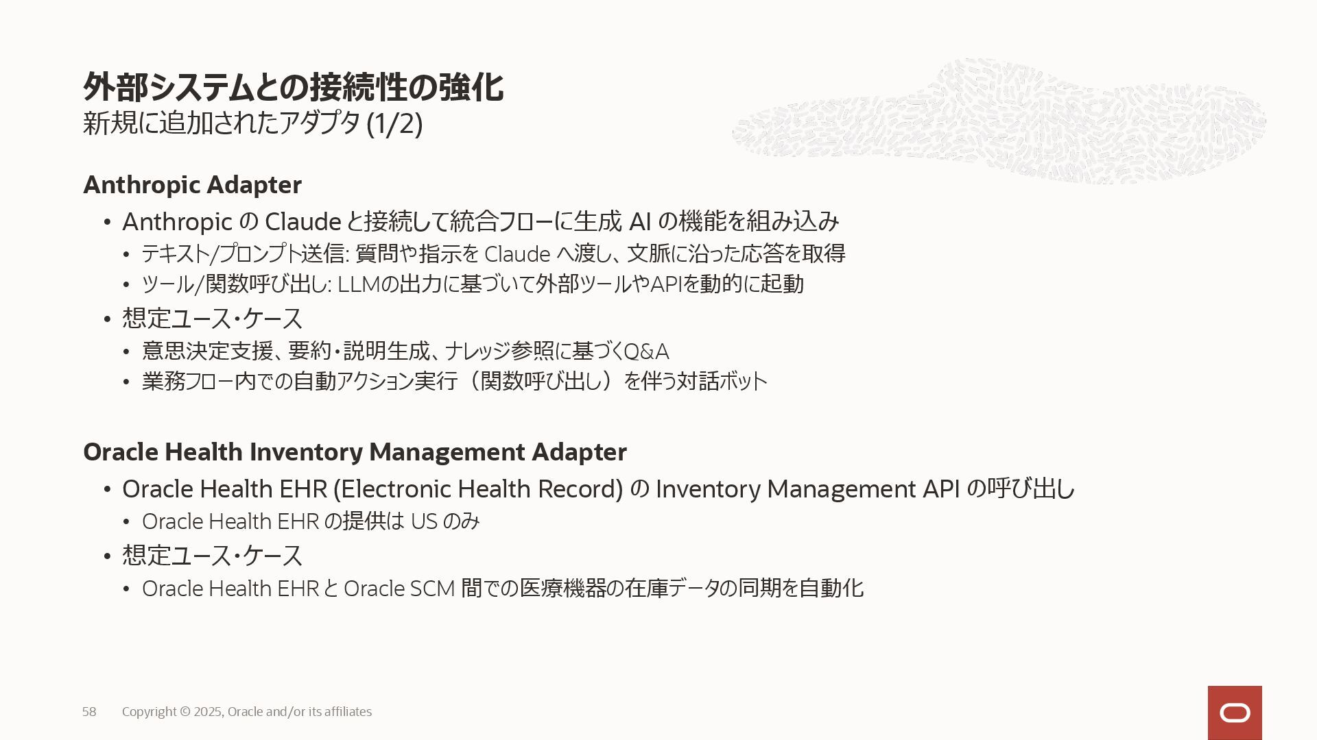 • テキスト/プロンプト送信: 質問や指⽰を Claude へ渡し、⽂脈に沿った応答を取得 • ツール/関数呼び出し: LLMの出⼒に基づいて外部ツールやAPIを動的に起動 • 想定ユース・ケース • 意思決定⽀援、要約・説明⽣成、ナレッジ参照に基づくQ&A • 業務フロー内での⾃動アクション実⾏(関数呼び出し)を伴う対話ボット Oracle Health Inventory Management Adapter • Oracle Health EHR (Electronic Health Record) の Inventory Management API の呼び出し • Oracle Health EHR の提供は US のみ • 想定ユース・ケース • Oracle Health EHR と Oracle SCM 間での医療機器の在庫データの同期を⾃動化 新規に追加されたアダプタ (1/2) Copyright © 2025, Oracle and/or its affiliates 58