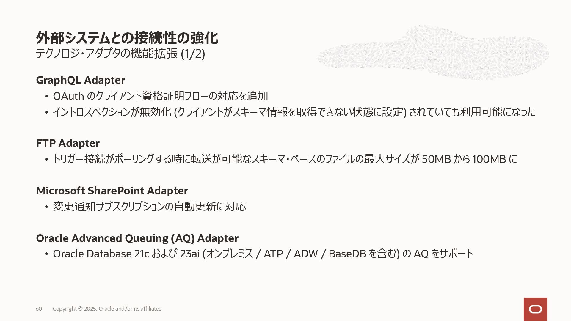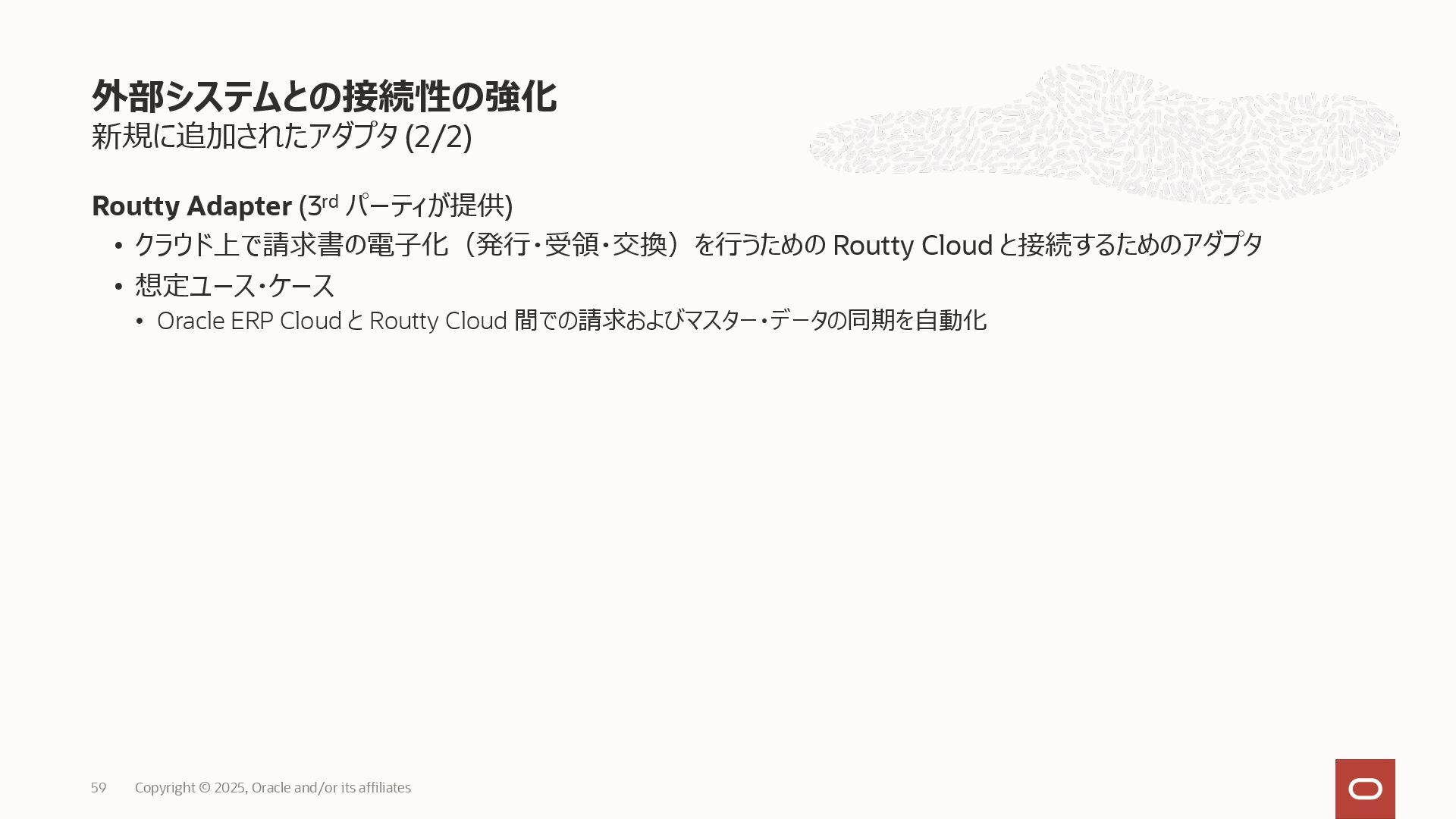 • 想定ユース・ケース • Oracle ERP Cloud と Routty Cloud 間での請求およびマスター・データの同期を⾃動化 新規に追加されたアダプタ (2/2) Copyright © 2025, Oracle and/or its affiliates 59