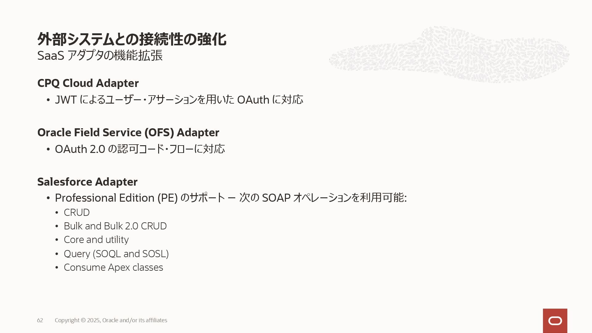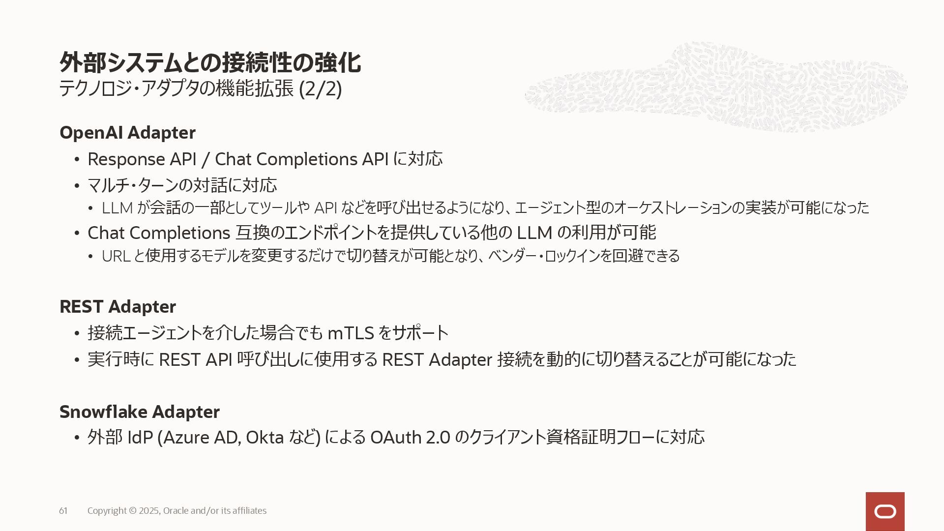 に対応 • マルチ・ターンの対話に対応 • LLM が会話の⼀部としてツールや API などを呼び出せるようになり、エージェント型のオーケストレーションの実装が可能になった • Chat Completions 互換のエンドポイントを提供している他の LLM の利⽤が可能 • URL と使⽤するモデルを変更するだけで切り替えが可能となり、ベンダー・ロックインを回避できる REST Adapter • 接続エージェントを介した場合でも mTLS をサポート • 実⾏時に REST API 呼び出しに使⽤する REST Adapter 接続を動的に切り替えることが可能になった Snowflake Adapter • 外部 IdP (Azure AD, Okta など) による OAuth 2.0 のクライアント資格証明フローに対応 テクノロジ・アダプタの機能拡張 (2/2) Copyright © 2025, Oracle and/or its affiliates 61