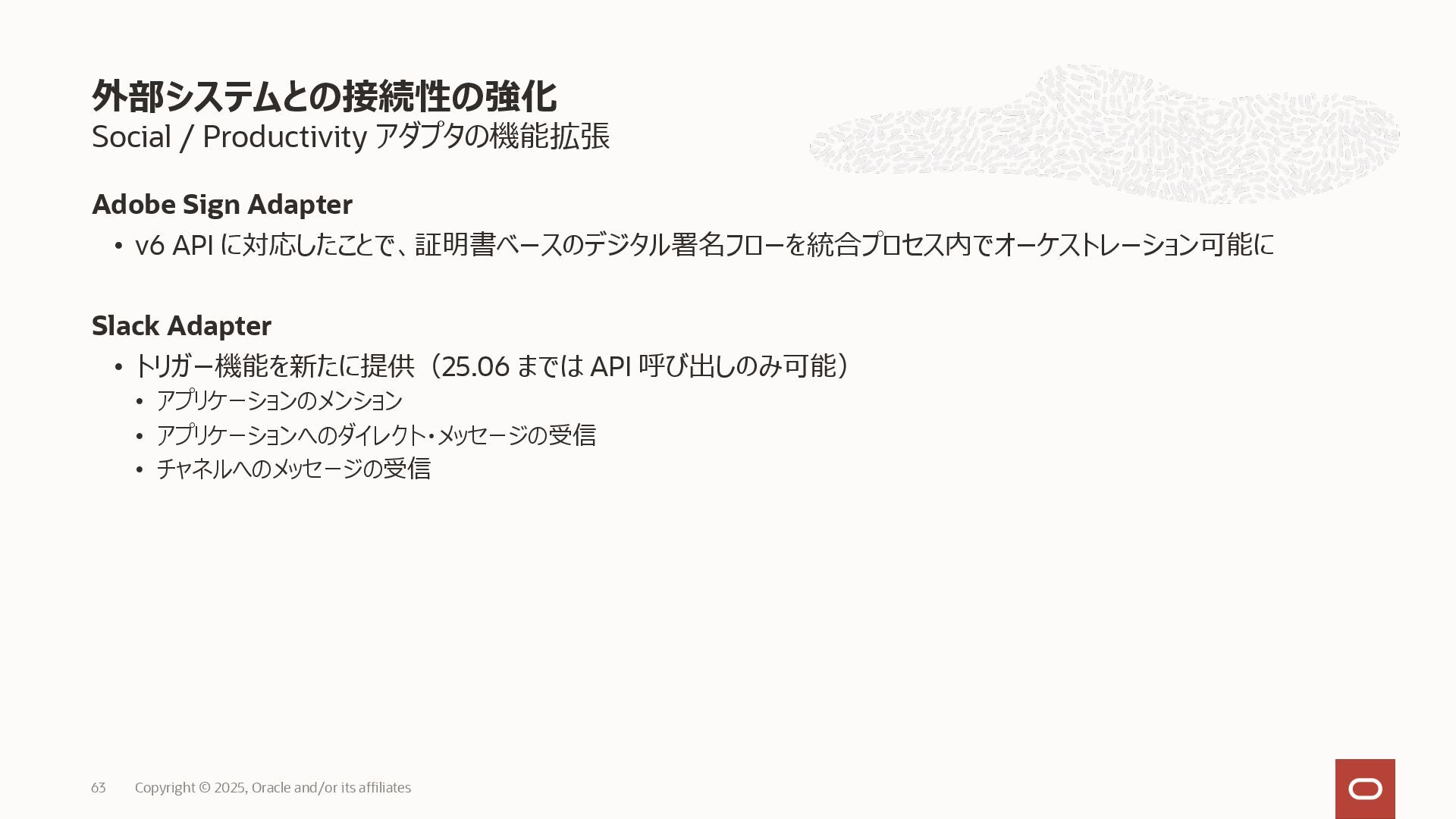 • トリガー機能を新たに提供(25.06 までは API 呼び出しのみ可能) • アプリケーションのメンション • アプリケーションへのダイレクト・メッセージの受信 • チャネルへのメッセージの受信 Social / Productivity アダプタの機能拡張 Copyright © 2025, Oracle and/or its affiliates 63