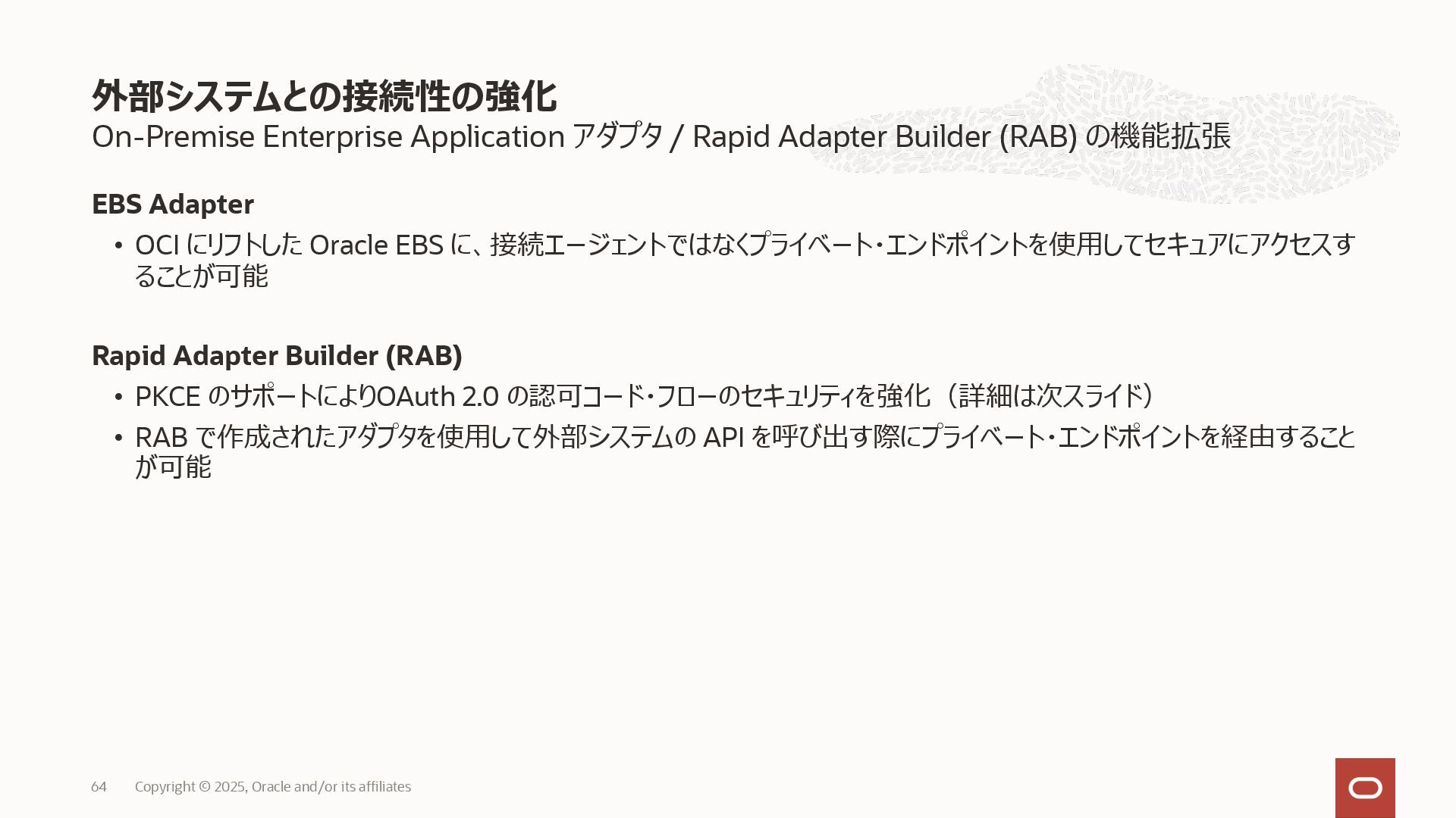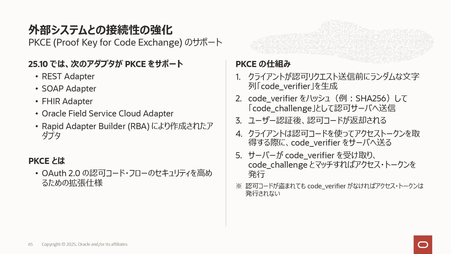 をサポート • REST Adapter • SOAP Adapter • FHIR Adapter • Oracle Field Service Cloud Adapter • Rapid Adapter Builder (RBA) により作成されたア ダプタ PKCE とは • OAuth 2.0 の認可コード・フローのセキュリティを⾼め るための拡張仕様 PKCE の仕組み 1. クライアントが認可リクエスト送信前にランダムな⽂字 列「code_verifier」を⽣成 2. code_verifier をハッシュ(例︓SHA256)して 「code_challenge」として認可サーバへ送信 3. ユーザー認証後、認可コードが返却される 4. クライアントは認可コードを使ってアクセストークンを取 得する際に、code_verifier をサーバへ送る 5. サーバーが code_verifier を受け取り、 code_challenge とマッチすればアクセス・トークンを 発⾏ ※ 認可コードが盗まれても code_verifier がなければアクセス・トークンは 発⾏されない 外部システムとの接続性の強化 Copyright © 2025, Oracle and/or its affiliates 65
