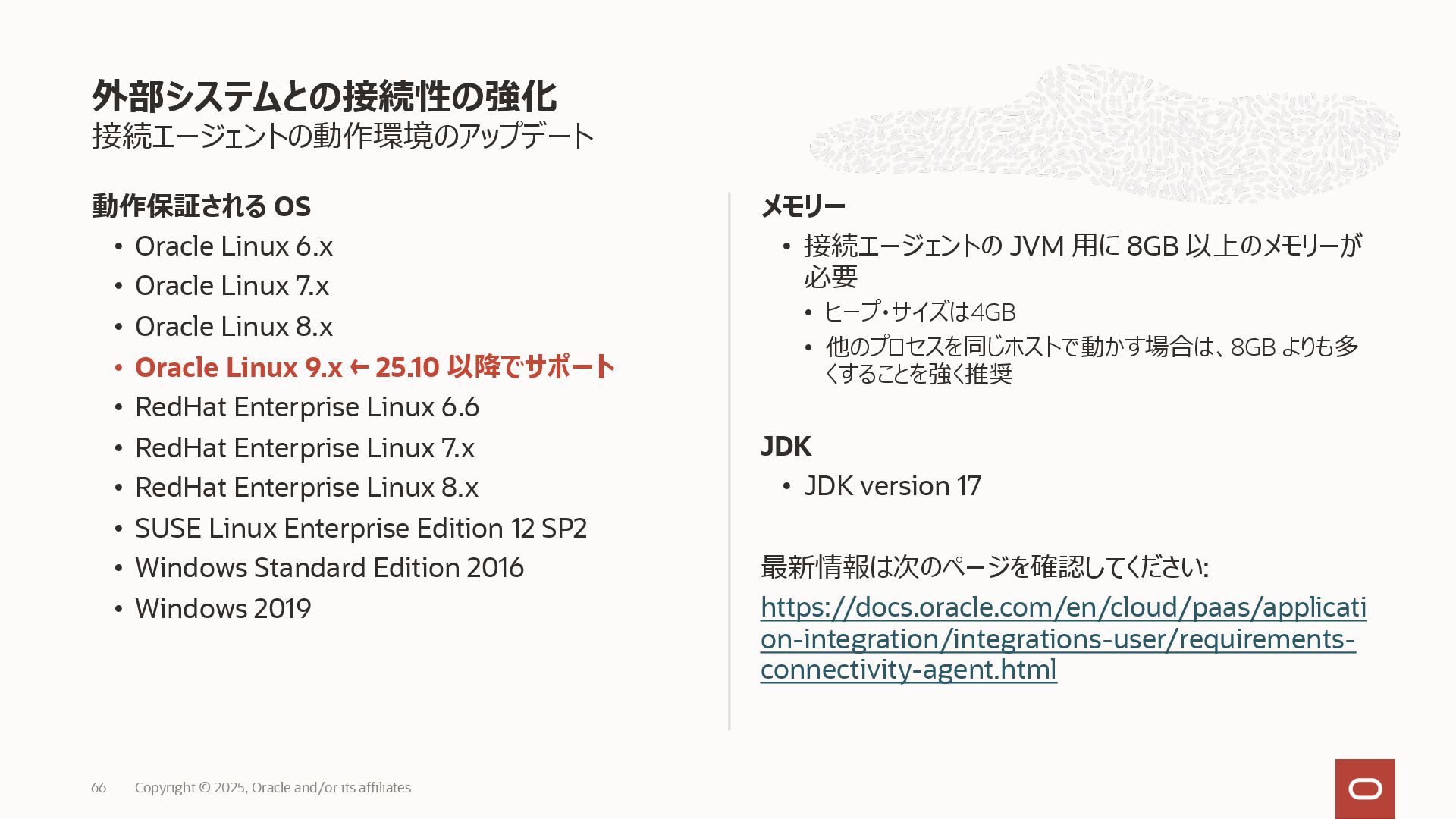 7.x • Oracle Linux 8.x • Oracle Linux 9.x ← 25.10 以降でサポート • RedHat Enterprise Linux 6.6 • RedHat Enterprise Linux 7.x • RedHat Enterprise Linux 8.x • SUSE Linux Enterprise Edition 12 SP2 • Windows Standard Edition 2016 • Windows 2019 メモリー • 接続エージェントの JVM ⽤に 8GB 以上のメモリーが 必要 • ヒープ・サイズは4GB • 他のプロセスを同じホストで動かす場合は、8GB よりも多 くすることを強く推奨 JDK • JDK version 17 最新情報は次のページを確認してください: https://docs.oracle.com/en/cloud/paas/applicati on-integration/integrations-user/requirements- connectivity-agent.html 外部システムとの接続性の強化 Copyright © 2025, Oracle and/or its affiliates 66