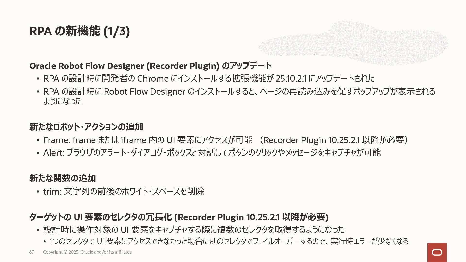 • RPA の設計時に開発者の Chrome にインストールする拡張機能が 25.10.2.1 にアップデートされた • RPA の設計時に Robot Flow Designer のインストールすると、ページの再読み込みを促すポップアップが表⽰される ようになった 新たなロボット・アクションの追加 • Frame: frame または iframe 内の UI 要素にアクセスが可能 (Recorder Plugin 10.25.2.1 以降が必要) • Alert: ブラウザのアラート・ダイアログ・ボックスと対話してボタンのクリックやメッセージをキャプチャが可能 新たな関数の追加 • trim: ⽂字列の前後のホワイト・スペースを削除 ターゲットの UI 要素のセレクタの冗⻑化 (Recorder Plugin 10.25.2.1 以降が必要) • 設計時に操作対象の UI 要素をキャプチャする際に複数のセレクタを取得するようになった • 1つのセレクタで UI 要素にアクセスできなかった場合に別のセレクタでフェイルオーバーするので、実⾏時エラーが少なくなる Copyright © 2025, Oracle and/or its affiliates 67