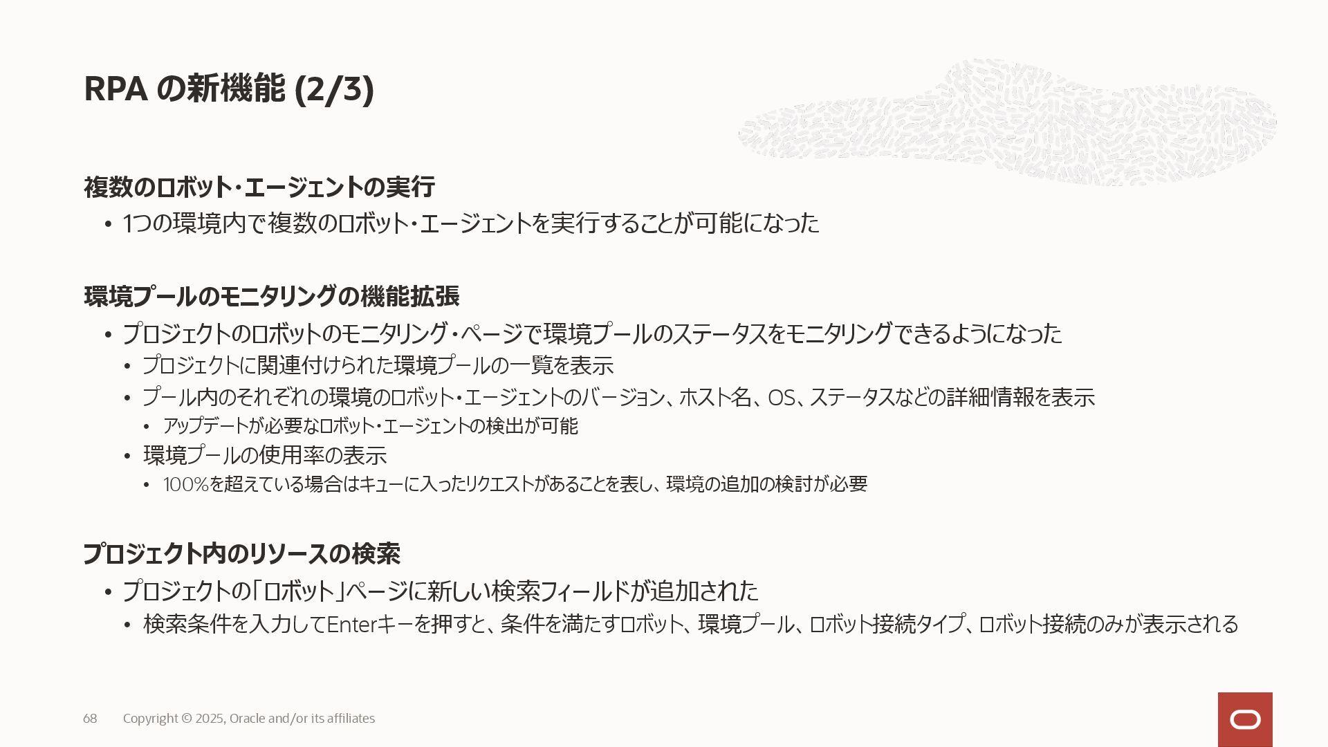 プロジェクトに関連付けられた環境プールの⼀覧を表⽰ • プール内のそれぞれの環境のロボット・エージェントのバージョン、ホスト名、OS、ステータスなどの詳細情報を表⽰ • アップデートが必要なロボット・エージェントの検出が可能 • 環境プールの使⽤率の表⽰ • 100%を超えている場合はキューに⼊ったリクエストがあることを表し、環境の追加の検討が必要 プロジェクト内のリソースの検索 • プロジェクトの「ロボット」ページに新しい検索フィールドが追加された • 検索条件を⼊⼒してEnterキーを押すと、条件を満たすロボット、環境プール、ロボット接続タイプ、ロボット接続のみが表⽰される Copyright © 2025, Oracle and/or its affiliates 68