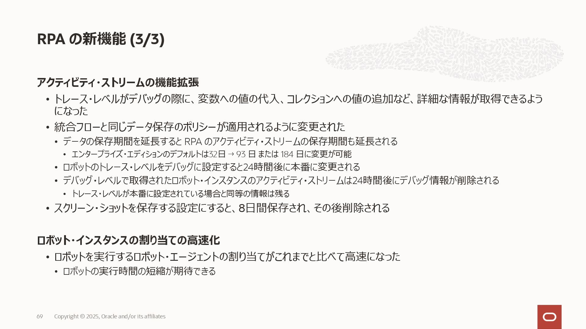 データの保存期間を延⻑すると RPA のアクティビティ・ストリームの保存期間も延⻑される • エンタープライズ・エディションのデフォルトは32⽇ → 93 ⽇ または 184 ⽇に変更が可能 • ロボットのトレース・レベルをデバッグに設定すると24時間後に本番に変更される • デバッグ・レベルで取得されたロボット・インスタンスのアクティビティ・ストリームは24時間後にデバッグ情報が削除される • トレース・レベルが本番に設定されている場合と同等の情報は残る • スクリーン・ショットを保存する設定にすると、8⽇間保存され、その後削除される ロボット・インスタンスの割り当ての⾼速化 • ロボットを実⾏するロボット・エージェントの割り当てがこれまでと⽐べて⾼速になった • ロボットの実⾏時間の短縮が期待できる Copyright © 2025, Oracle and/or its affiliates 69