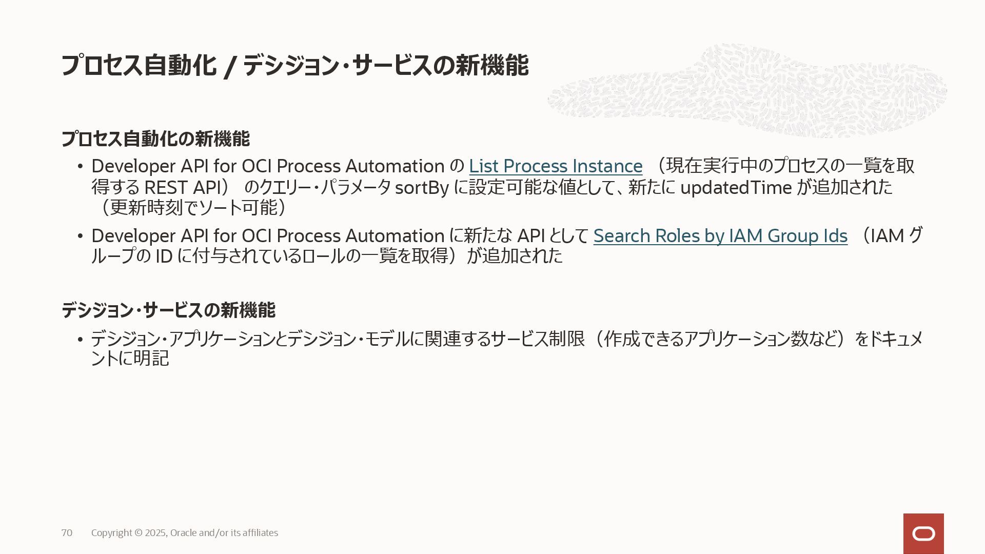 Automation の List Process Instance (現在実⾏中のプロセスの⼀覧を取 得する REST API) のクエリー・パラメータ sortBy に設定可能な値として、新たに updatedTime が追加された (更新時刻でソート可能) • Developer API for OCI Process Automation に新たな API として Search Roles by IAM Group Ids (IAM グ ループの ID に付与されているロールの⼀覧を取得)が追加された デシジョン・サービスの新機能 • デシジョン・アプリケーションとデシジョン・モデルに関連するサービス制限(作成できるアプリケーション数など)をドキュメ ントに明記 Copyright © 2025, Oracle and/or its affiliates 70