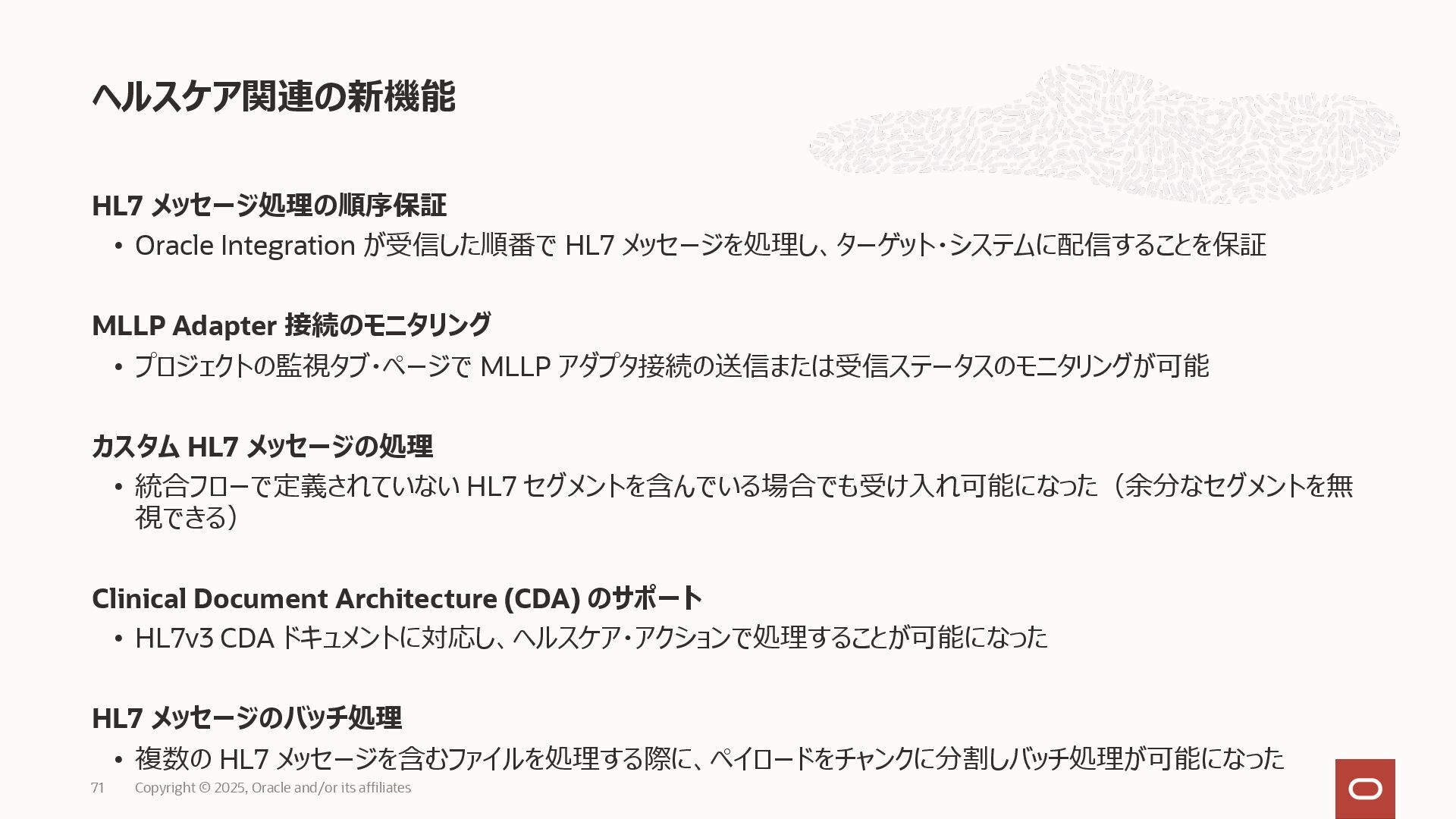 Adapter 接続のモニタリング • プロジェクトの監視タブ・ページで MLLP アダプタ接続の送信または受信ステータスのモニタリングが可能 カスタム HL7 メッセージの処理 • 統合フローで定義されていない HL7 セグメントを含んでいる場合でも受け⼊れ可能になった(余分なセグメントを無 視できる) Clinical Document Architecture (CDA) のサポート • HL7v3 CDA ドキュメントに対応し、ヘルスケア・アクションで処理することが可能になった HL7 メッセージのバッチ処理 • 複数の HL7 メッセージを含むファイルを処理する際に、ペイロードをチャンクに分割しバッチ処理が可能になった Copyright © 2025, Oracle and/or its affiliates 71