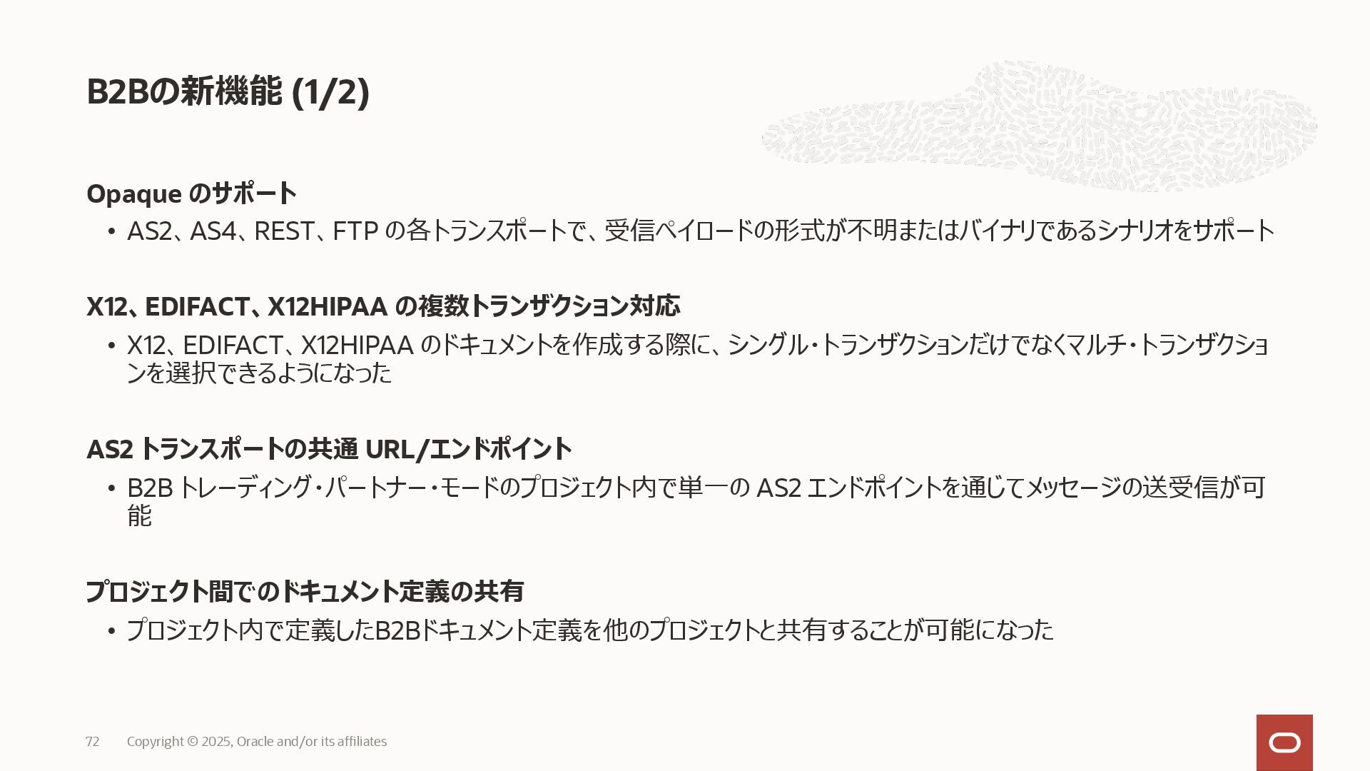 X12、EDIFACT、X12HIPAA のドキュメントを作成する際に、シングル・トランザクションだけでなくマルチ・トランザクショ ンを選択できるようになった AS2 トランスポートの共通 URL/エンドポイント • B2B トレーディング・パートナー・モードのプロジェクト内で単⼀の AS2 エンドポイントを通じてメッセージの送受信が可 能 プロジェクト間でのドキュメント定義の共有 • プロジェクト内で定義したB2Bドキュメント定義を他のプロジェクトと共有することが可能になった Copyright © 2025, Oracle and/or its affiliates 72