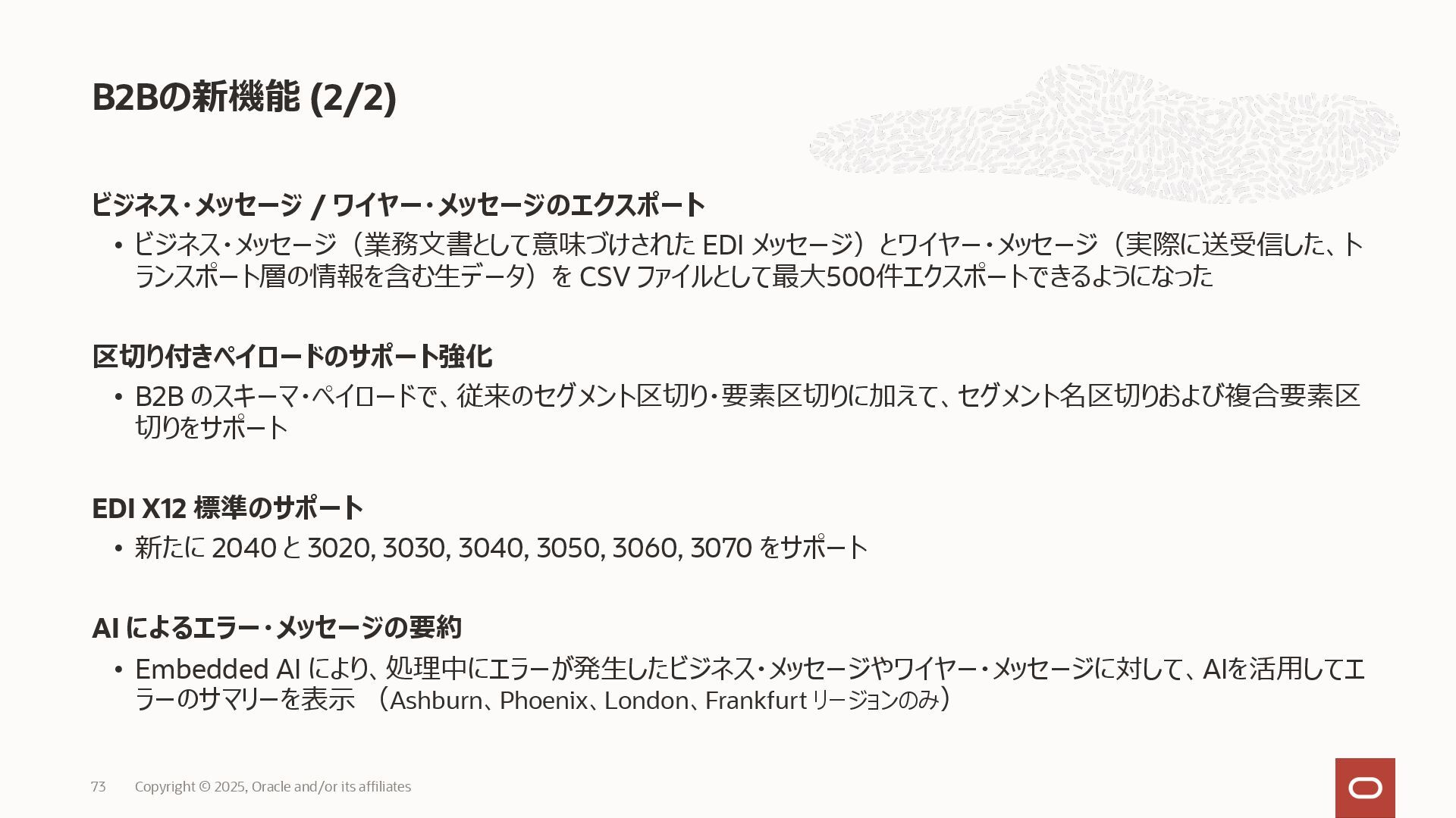 CSV ファイルとして最⼤500件エクスポートできるようになった 区切り付きペイロードのサポート強化 • B2B のスキーマ・ペイロードで、従来のセグメント区切り・要素区切りに加えて、セグメント名区切りおよび複合要素区 切りをサポート EDI X12 標準のサポート • 新たに 2040 と 3020, 3030, 3040, 3050, 3060, 3070 をサポート AI によるエラー・メッセージの要約 • Embedded AI により、処理中にエラーが発⽣したビジネス・メッセージやワイヤー・メッセージに対して、AIを活⽤してエ ラーのサマリーを表⽰ (Ashburn、Phoenix、London、Frankfurt リージョンのみ) Copyright © 2025, Oracle and/or its affiliates 73
