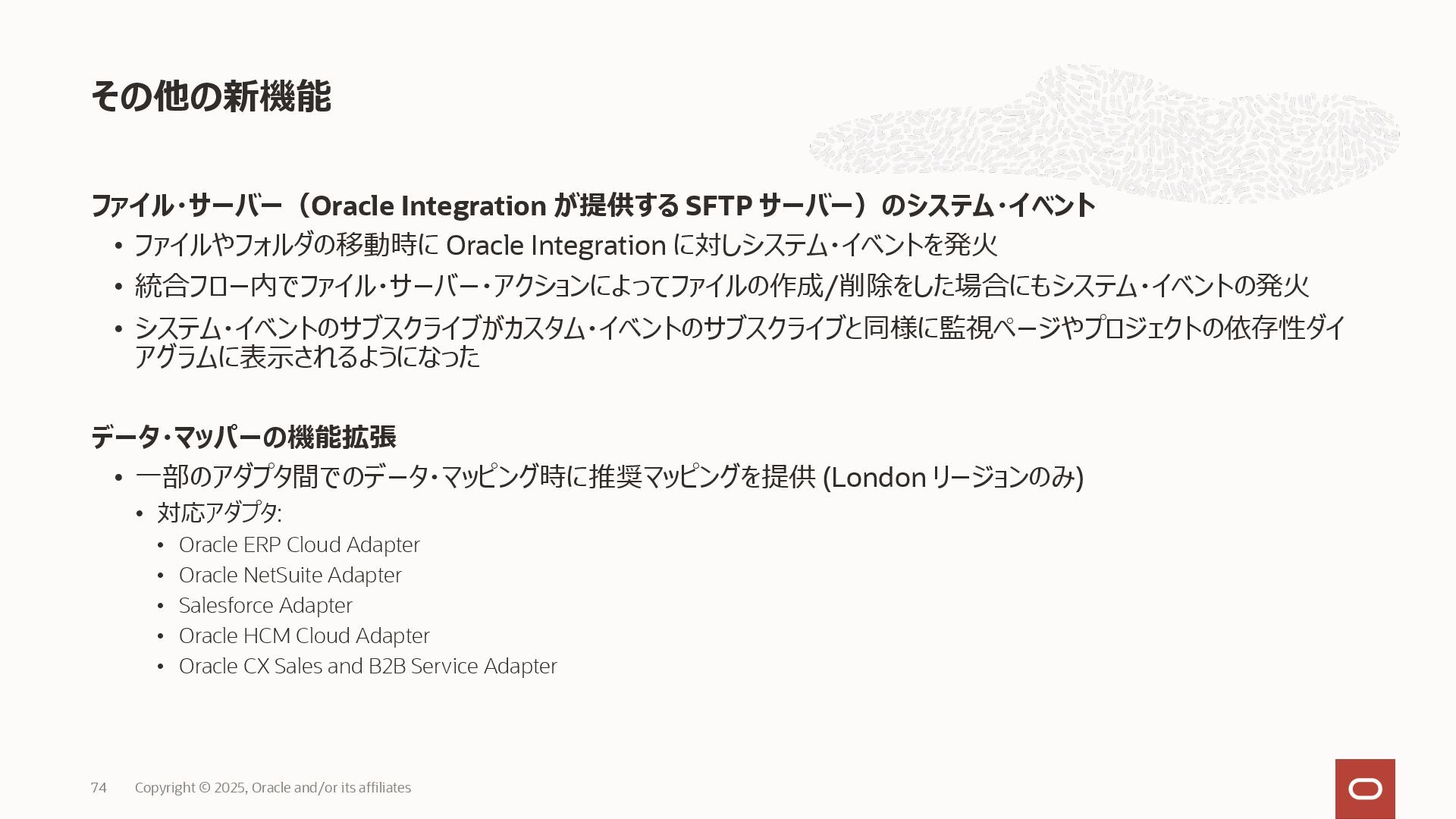 に対しシステム・イベントを発⽕ • 統合フロー内でファイル・サーバー・アクションによってファイルの作成/削除をした場合にもシステム・イベントの発⽕ • システム・イベントのサブスクライブがカスタム・イベントのサブスクライブと同様に監視ページやプロジェクトの依存性ダイ アグラムに表⽰されるようになった データ・マッパーの機能拡張 • ⼀部のアダプタ間でのデータ・マッピング時に推奨マッピングを提供 (London リージョンのみ) • 対応アダプタ: • Oracle ERP Cloud Adapter • Oracle NetSuite Adapter • Salesforce Adapter • Oracle HCM Cloud Adapter • Oracle CX Sales and B2B Service Adapter Copyright © 2025, Oracle and/or its affiliates 74