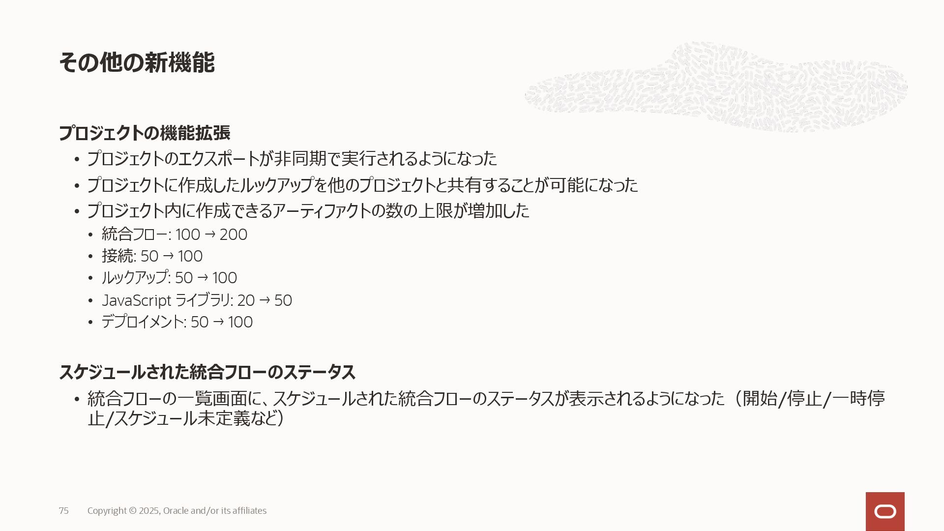 100 → 200 • 接続: 50 → 100 • ルックアップ: 50 → 100 • JavaScript ライブラリ: 20 → 50 • デプロイメント: 50 → 100 スケジュールされた統合フローのステータス • 統合フローの⼀覧画⾯に、スケジュールされた統合フローのステータスが表⽰されるようになった(開始/停⽌/⼀時停 ⽌/スケジュール未定義など) Copyright © 2025, Oracle and/or its affiliates 75