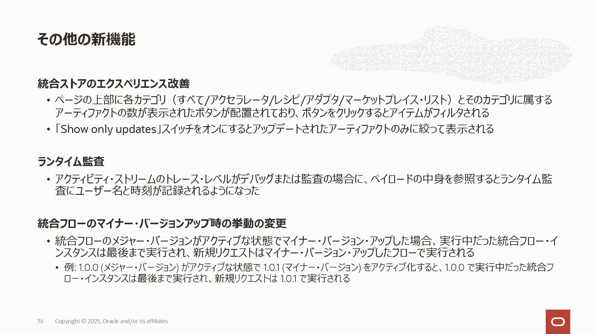 • アクティビティ・ストリームのトレース・レベルがデバッグまたは監査の場合に、ペイロードの中⾝を参照するとランタイム監 査にユーザー名と時刻が記録されるようになった 統合フローのマイナー・バージョンアップ時の挙動の変更 • 統合フローのメジャー・バージョンがアクティブな状態でマイナー・バージョン・アップした場合、実⾏中だった統合フロー・イ ンスタンスは最後まで実⾏され、新規リクエストはマイナー・バージョン・アップしたフローで実⾏される • 例: 1.0.0 (メジャー・バージョン) がアクティブな状態で 1.0.1 (マイナー・バージョン) をアクティブ化すると、1.0.0 で実⾏中だった統合フ ロー・インスタンスは最後まで実⾏され、新規リクエストは 1.0.1 で実⾏される Copyright © 2025, Oracle and/or its affiliates 76
