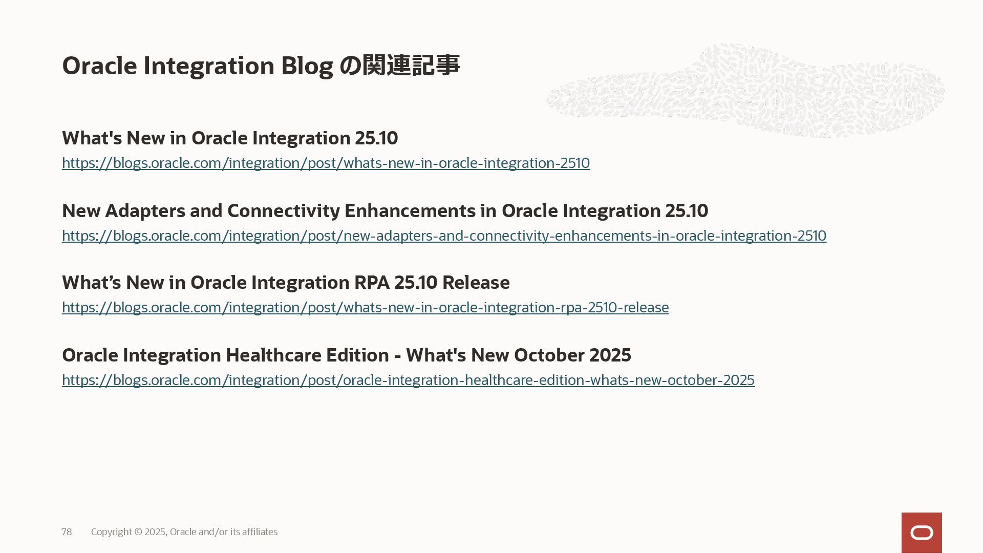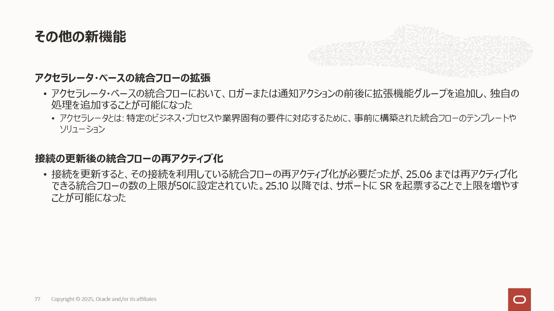 • 接続を更新すると、その接続を利⽤している統合フローの再アクティブ化が必要だったが、25.06 までは再アクティブ化 できる統合フローの数の上限が50に設定されていた。25.10 以降では、サポートに SR を起票することで上限を増やす ことが可能になった Copyright © 2025, Oracle and/or its affiliates 77