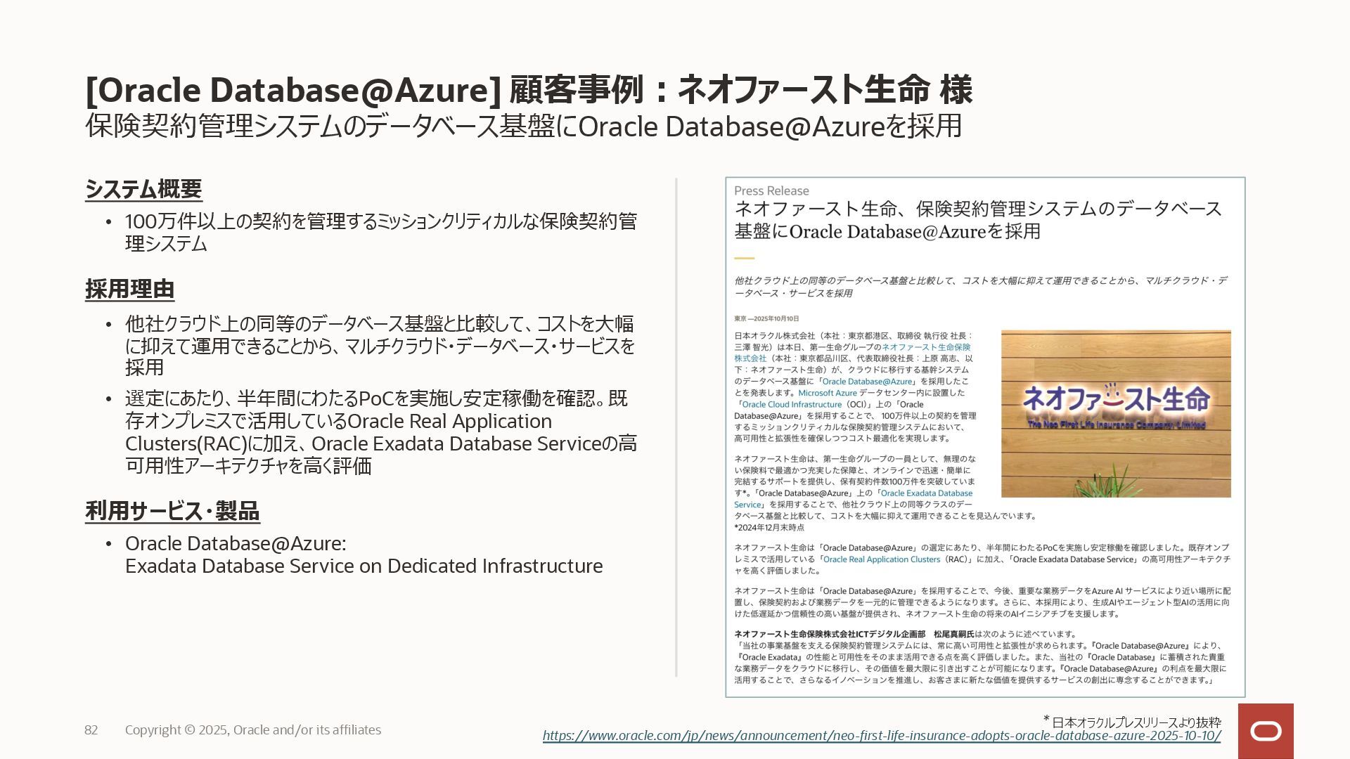 プレスリリース • ネオファースト⽣命、保険契約管理システムのデータベース基盤に Oracle Database@Azureを採⽤ • 他社クラウド上の同等のデータベース基盤と⽐較して、コストを⼤幅に抑えて 運⽤できることから、マルチクラウド・データベース・サービスを採⽤ • オラクルとAMDがパートナーシップを拡⼤し、お客様が次世代のAIに