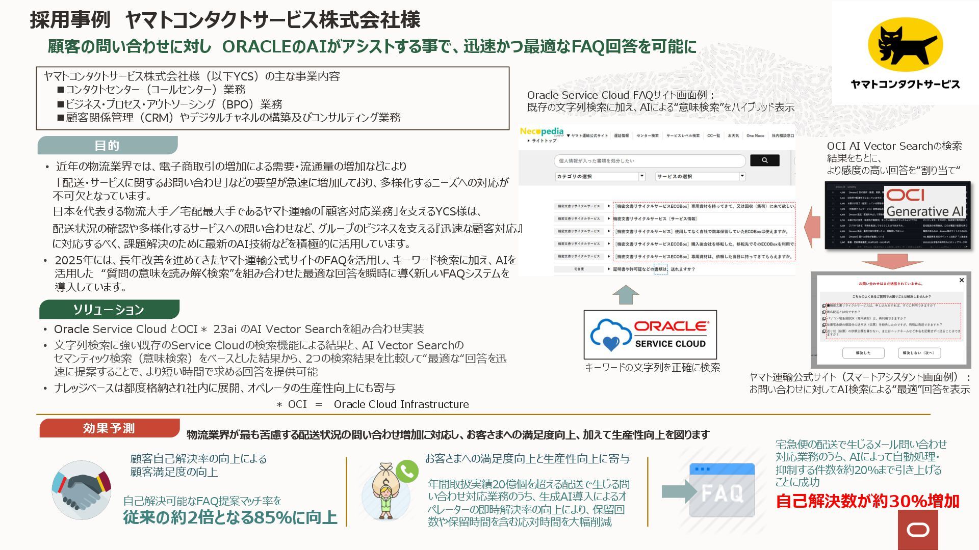 “質問の意味を読み解く検索”を組み合わせた最適な回答を瞬時に導く新しいFAQシステムを 導⼊しています。 顧客⾃⼰解決率の向上による 顧客満⾜度の向上 効果予測 Oracle Service Cloud FAQサイト画⾯例︓ 既存の⽂字列検索に加え、AIによる“意味検索”をハイブリッド表⽰ ヤマト運輸公式サイト(スマートアシスタント画⾯例)︓ お問い合わせに対してAI検索による“最適”回答を表⽰ 宅急便の配送で⽣じるメール問い合わせ 対応業務のうち、AIによって⾃動処理・ 抑制する件数を約20%まで引き上げる ことに成功 ⾃⼰解決数が約30%増加 ヤマトコンタクトサービス株式会社様(以下YCS)の主な事業内容 ▪コンタクトセンター(コールセンター)業務 ▪ビジネス・プロセス・アウトソーシング(BPO)業務 ▪顧客関係管理(CRM)やデジタルチャネルの構築及びコンサルティング業務 OCI AI Vector Searchの検索 結果をもとに、 より感度の⾼い回答を“割り当て“ • Oracle Service Cloud とOCI* 23ai のAI Vector Searchを組み合わせ実装 • ⽂字列検索に強い既存のService Cloudの検索機能による結果と、AI Vector Searchの セマンティック検索(意味検索)をベースとした結果から、2つの検索結果を⽐較して“最適な“回答を迅 速に提案することで、より短い時間で求める回答を提供可能 • ナレッジベースは都度格納され社内に展開、オペレータの⽣産性向上にも寄与 * OCI = Oracle Cloud Infrastructure 物流業界が最も苦慮する配送状況の問い合わせ増加に対応し、お客さまへの満⾜度向上、加えて⽣産性向上を図ります • 近年の物流業界では、電⼦商取引の増加による需要・流通量の増加などにより 「配送・サービスに関するお問い合わせ」などの要望が急速に増加しており、多様化するニーズへの対応が 不可⽋となっています。 ⽇本を代表する物流⼤⼿/宅配最⼤⼿であるヤマト運輸の「顧客対応業務」を⽀えるYCS様は、 配送状況の確認や多様化するサービスへの問い合わせなど、グループのビジネスを⽀える『迅速な顧客対応』 に対応するべく、課題解決のために最新のAI技術などを積極的に活⽤しています。 キーワードの⽂字列を正確に検索 年間取扱実績20億個を超える配送で⽣じる問 い合わせ対応業務のうち、⽣成AI導⼊によるオ ペレーターの即時解決率の向上により、保留回 数や保留時間を含む応対時間を⼤幅削減 ⾃⼰解決可能なFAQ提案マッチ率を 従来の約2倍となる85%に向上