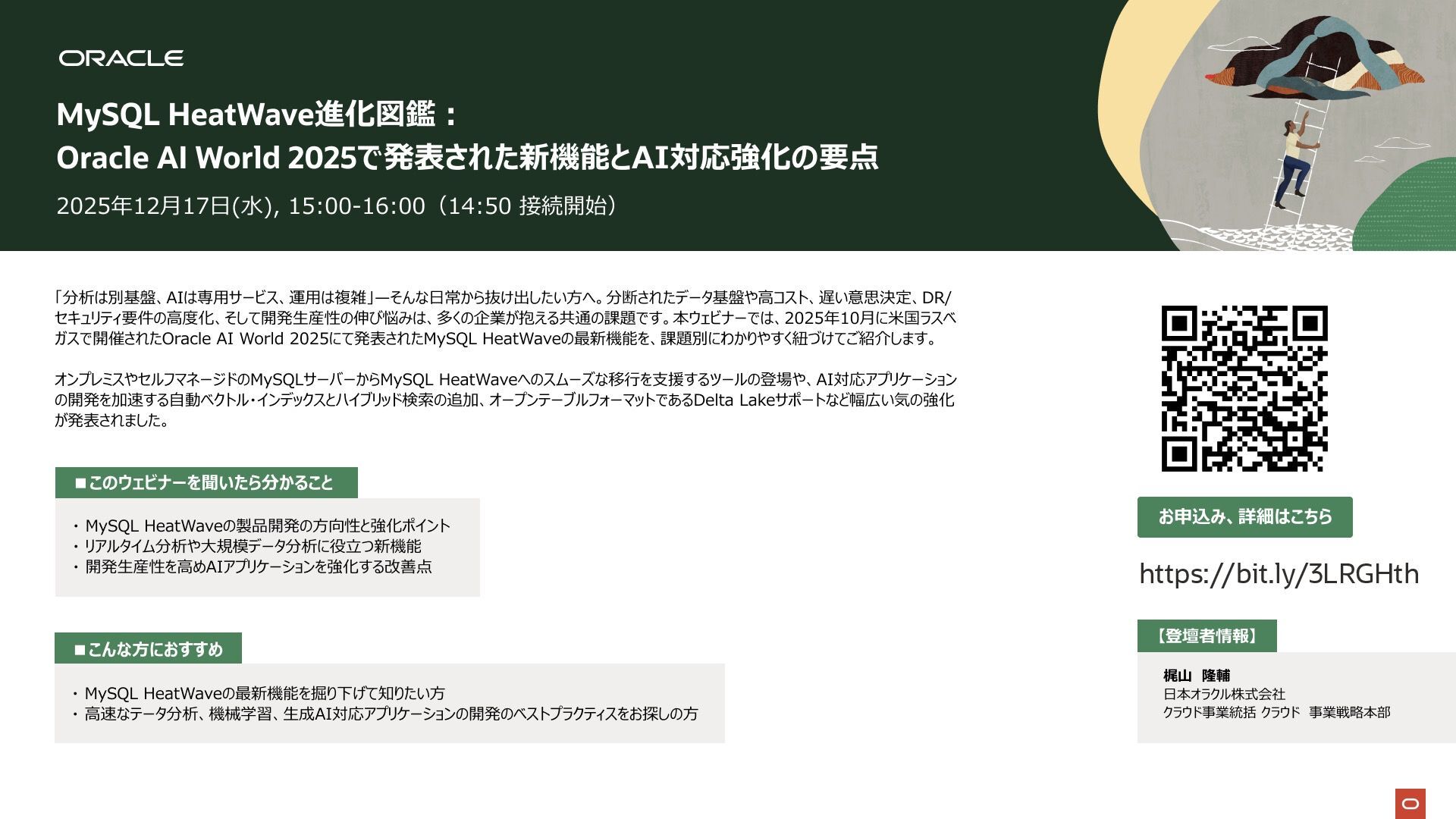 や Oracle Database をはじめとする、さまざまな製品につい ての最新情報や活⽤事例および技術情報を業務部⾨からIT部⾨のエンジニアの⽅々までの幅広い皆様へ向けてウェビナーを通じ てお届けします。 さまざまなテーマや理解度レベルのコンテンツを取り揃えていますので、ぜひご活⽤ください。 定期的に開催となります。 『はじめてのOCI』 『Database関連テーマ』 『時々の旬なテーマ、最新トピック』を中⼼にお伝えしていきます。 Oracle Cloud ウェビナー ハンズオン・トレーニング Oracle Cloudのご紹介とビジネス課題を解決したお客様事 例やその時々のホットなトピックをお届けします Oracle Cloudの使い⽅や活⽤イメージを実際にOracle Cloudを操作していただきながら具体的にご紹介します 開催スケジュール oracle.com/goto/ocws-jp 2025年12⽉17⽇(⽔) 15:00〜16:00 MySQL HeatWave進化図鑑︓Oracle AI World 2025で 発表された新機能とAI対応強化の要点 2025年11⽉26⽇(⽔) 13:30〜17:00 実践Kubernetesハンズオン 〜OKEでKubernetesをバーチャル 体験しよう〜 2025年11⽉27⽇(⽔) 13:00〜15:00 はじめてでもできる、ビジネス情報の活⽤! ⾃分で試すナットクの、データ の収集と共有・分析 2025年12⽉3⽇(⽔) 13:00〜17:00 ハンズオンWebinar - Oracle Cloud Infrastructureを使ってみよう 2025年12⽉18⽇(⽔) 15:00〜17:00 無償ハンズオン・トレーニング【⼊⾨編】はじめてみよう!! Oracle Analytics Cloud 〜 ⽣成AIとも対話してみよう!! 〜 Copyright © 2025, Oracle and/or its affiliates 85