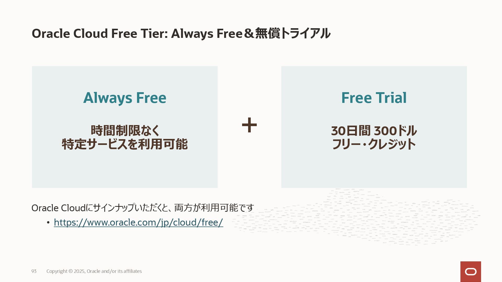 Always Free 時間制限なく 特定サービスを利⽤可能 Free Trial 30⽇間 300ドル フリー・クレジット + Copyright © 2025, Oracle and/or its affiliates 93