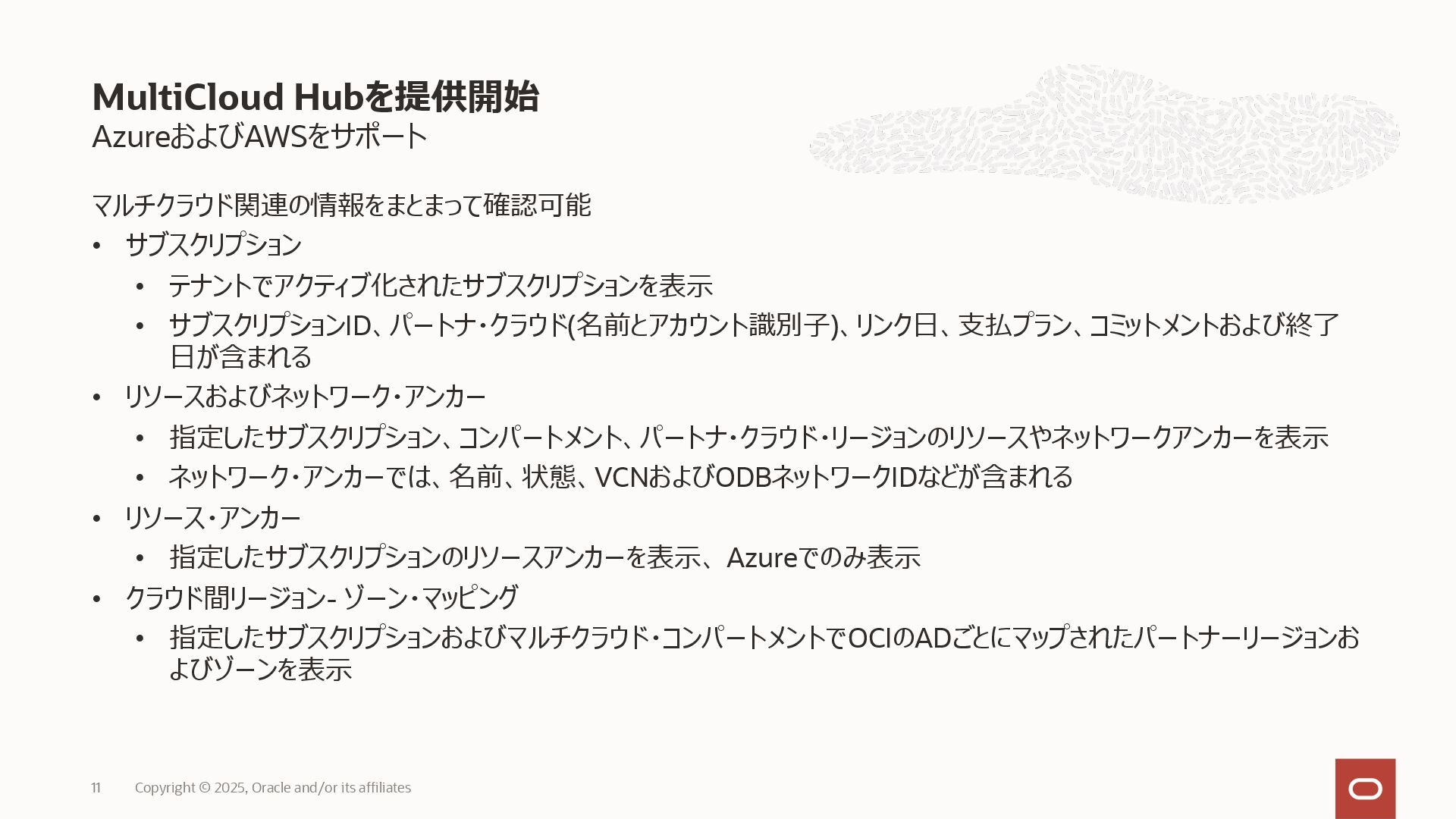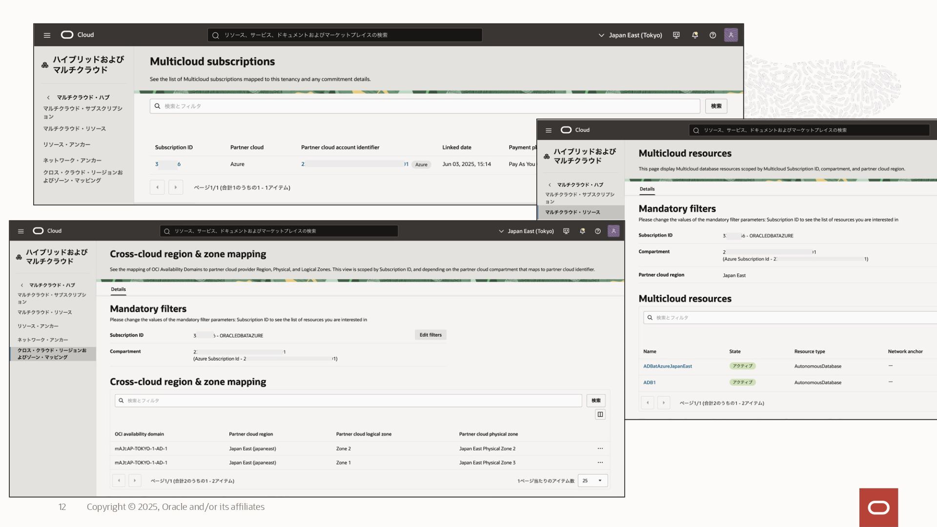 ⽇が含まれる • リソースおよびネットワーク・アンカー • 指定したサブスクリプション、コンパートメント、パートナ・クラウド・リージョンのリソースやネットワークアンカーを表⽰ • ネットワーク・アンカーでは、名前、状態、VCNおよびODBネットワークIDなどが含まれる • リソース・アンカー • 指定したサブスクリプションのリソースアンカーを表⽰、 Azureでのみ表⽰ • クラウド間リージョン- ゾーン・マッピング • 指定したサブスクリプションおよびマルチクラウド・コンパートメントでOCIのADごとにマップされたパートナーリージョンお よびゾーンを表⽰ Copyright © 2025, Oracle and/or its affiliates 11