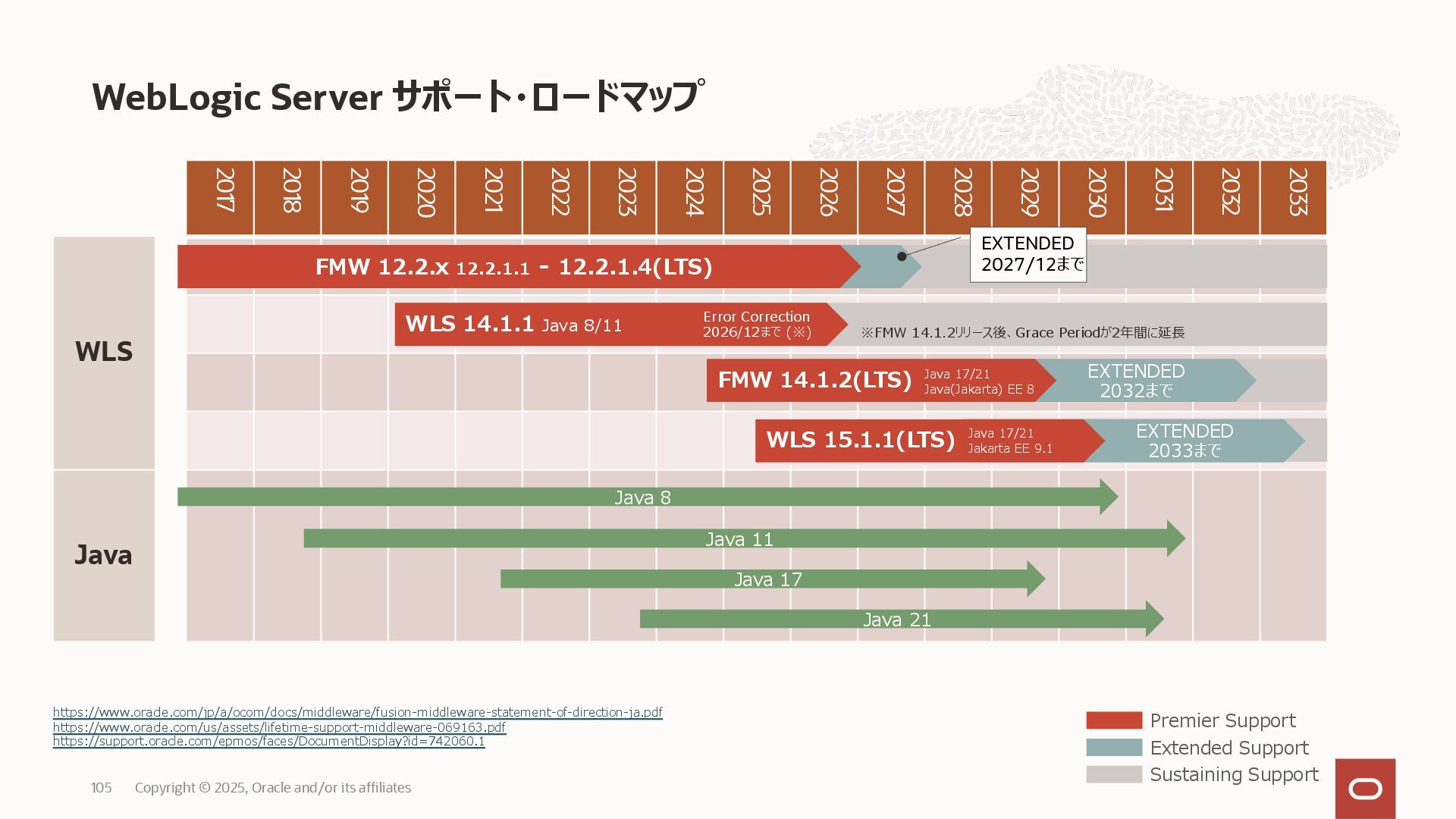 2027 2028 2029 2030 2031 2032 2033 WLS Java WebLogic Server サポート・ロードマップ Java 8 Extended Support Premier Support Sustaining Support FMW 12.2.x 12.2.1.1 - 12.2.1.4(LTS) WLS 14.1.1 Java 8/11 EXTENDED 2032まで FMW 14.1.2(LTS) Java 11 Java 17 Java 21 ※FMW 14.1.2リリース後、Grace Periodが2年間に延⻑ Error Correction 2026/12まで (※) https://www.oracle.com/jp/a/ocom/docs/middleware/fusion-middleware-statement-of-direction-ja.pdf https://www.oracle.com/us/assets/lifetime-support-middleware-069163.pdf https://support.oracle.com/epmos/faces/DocumentDisplay?id=742060.1 EXTENDED 2027/12まで Java 17/21 Java(Jakarta) EE 8 EXTENDED 2033まで WLS 15.1.1(LTS) Java 17/21 Jakarta EE 9.1 Copyright © 2025, Oracle and/or its affiliates 105