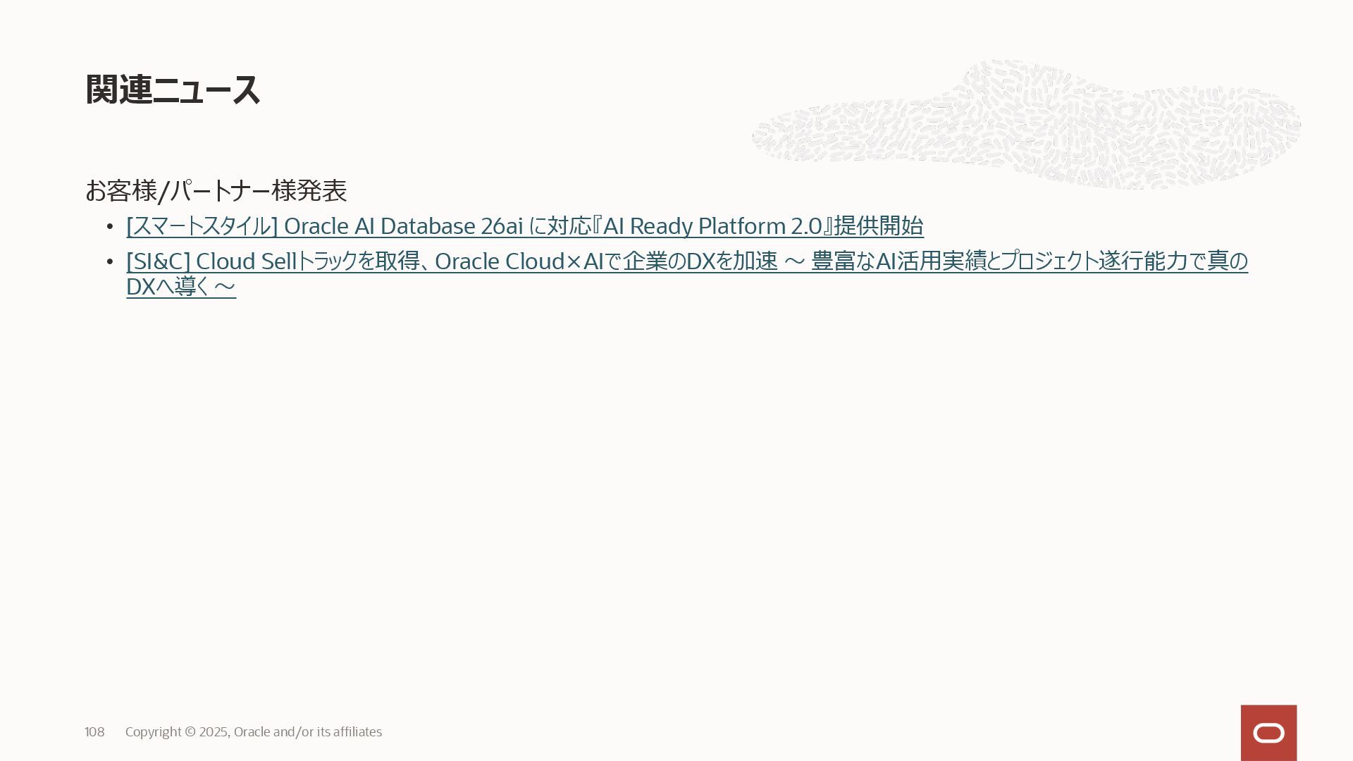 2.0』提供開始 • [SI&C] Cloud Sellトラックを取得、Oracle Cloud×AIで企業のDXを加速 〜 豊富なAI活⽤実績とプロジェクト遂⾏能⼒で真の DXへ導く 〜 関連ニュース Copyright © 2025, Oracle and/or its affiliates 108