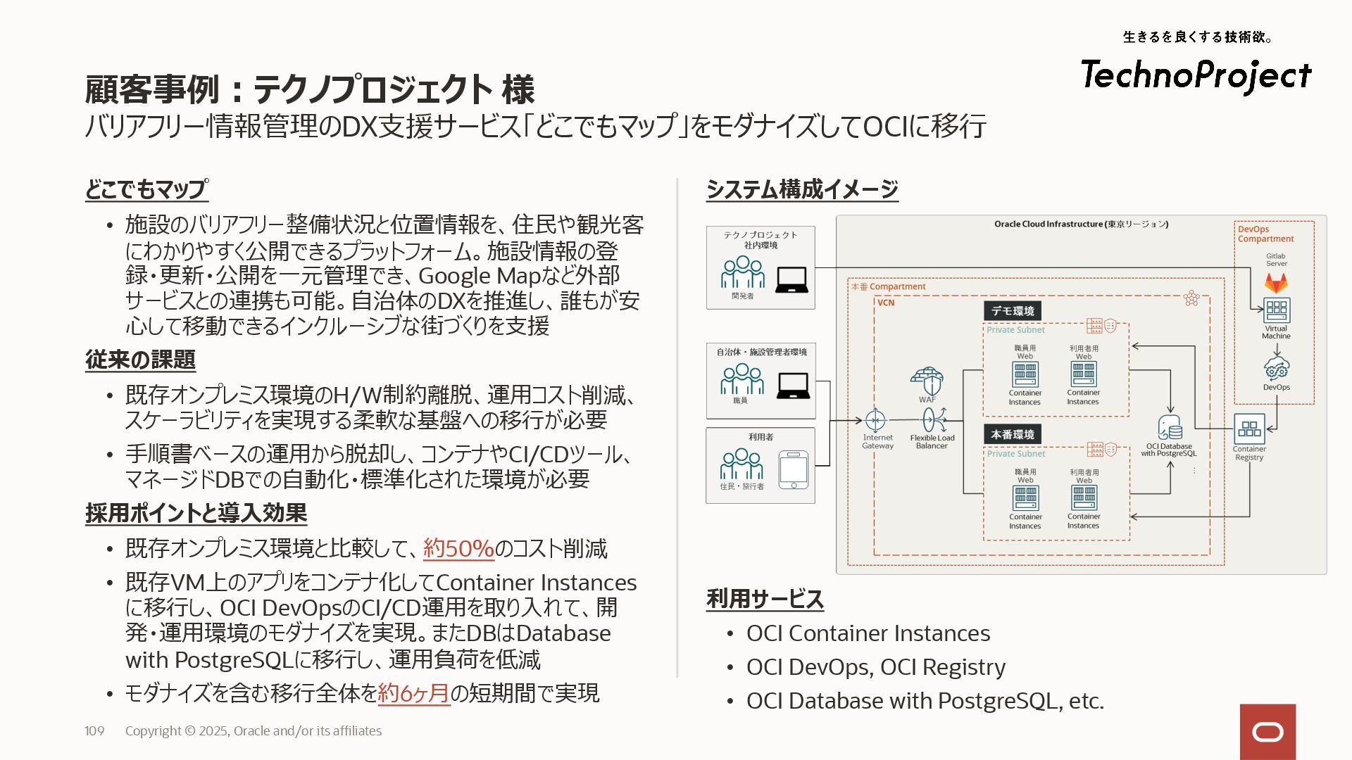 • 既存オンプレミス環境のH/W制約離脱、運⽤コスト削減、 スケーラビリティを実現する柔軟な基盤への移⾏が必要 • ⼿順書ベースの運⽤から脱却し、コンテナやCI/CDツール、 マネージドDBでの⾃動化・標準化された環境が必要 採⽤ポイントと導⼊効果 • 既存オンプレミス環境と⽐較して、約50%のコスト削減 • 既存VM上のアプリをコンテナ化してContainer Instances に移⾏し、OCI DevOpsのCI/CD運⽤を取り⼊れて、開 発・運⽤環境のモダナイズを実現。またDBはDatabase with PostgreSQLに移⾏し、運⽤負荷を低減 • モダナイズを含む移⾏全体を約6ヶ⽉の短期間で実現 システム構成イメージ 利⽤サービス • OCI Container Instances • OCI DevOps, OCI Registry • OCI Database with PostgreSQL, etc. 顧客事例︓テクノプロジェクト 様 Copyright © 2025, Oracle and/or its affiliates 109