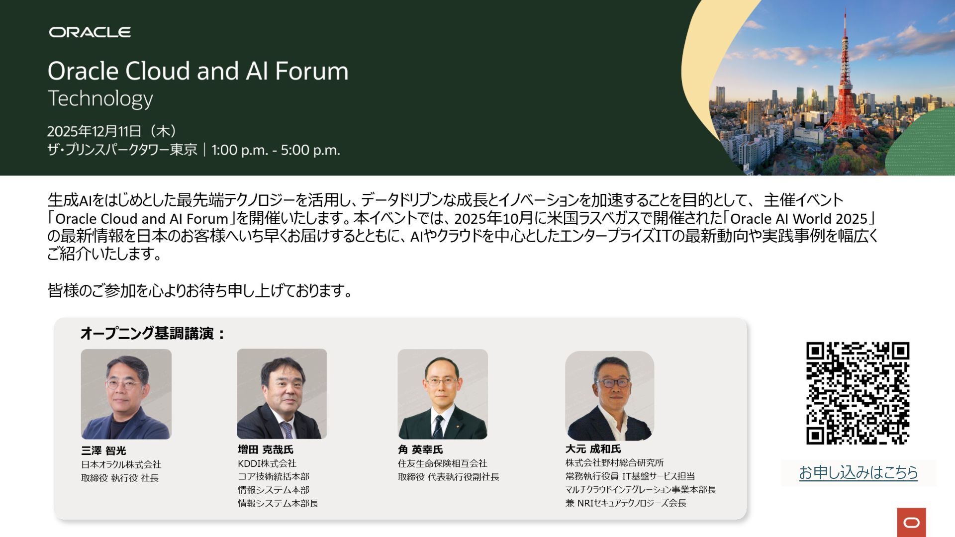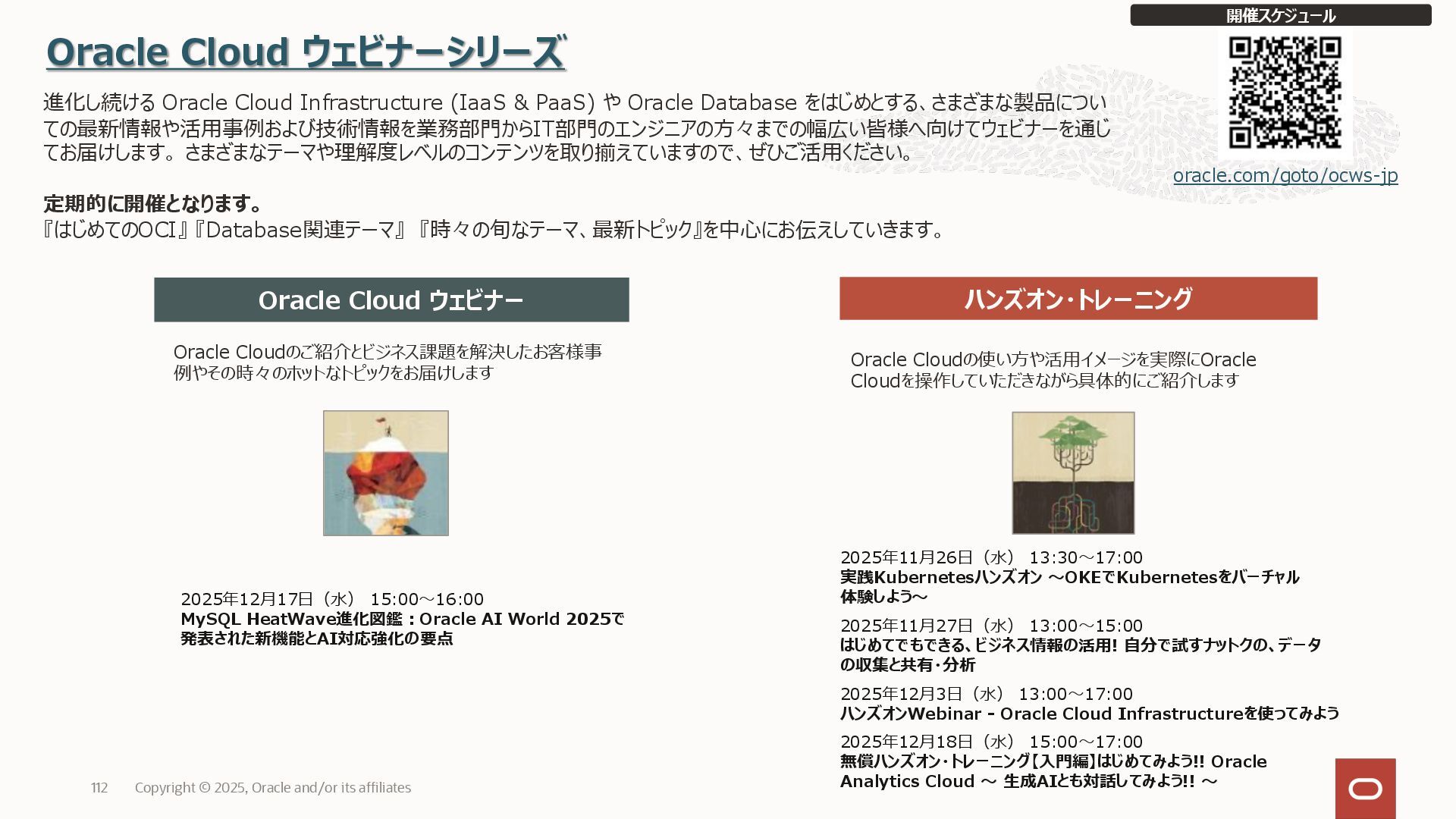 や Oracle Database をはじめとする、さまざまな製品につい ての最新情報や活⽤事例および技術情報を業務部⾨からIT部⾨のエンジニアの⽅々までの幅広い皆様へ向けてウェビナーを通じ てお届けします。 さまざまなテーマや理解度レベルのコンテンツを取り揃えていますので、ぜひご活⽤ください。 定期的に開催となります。 『はじめてのOCI』 『Database関連テーマ』 『時々の旬なテーマ、最新トピック』を中⼼にお伝えしていきます。 Oracle Cloud ウェビナー ハンズオン・トレーニング Oracle Cloudのご紹介とビジネス課題を解決したお客様事 例やその時々のホットなトピックをお届けします Oracle Cloudの使い⽅や活⽤イメージを実際にOracle Cloudを操作していただきながら具体的にご紹介します 開催スケジュール oracle.com/goto/ocws-jp 2025年12⽉17⽇(⽔) 15:00〜16:00 MySQL HeatWave進化図鑑︓Oracle AI World 2025で 発表された新機能とAI対応強化の要点 2025年11⽉26⽇(⽔) 13:30〜17:00 実践Kubernetesハンズオン 〜OKEでKubernetesをバーチャル 体験しよう〜 2025年11⽉27⽇(⽔) 13:00〜15:00 はじめてでもできる、ビジネス情報の活⽤! ⾃分で試すナットクの、データ の収集と共有・分析 2025年12⽉3⽇(⽔) 13:00〜17:00 ハンズオンWebinar - Oracle Cloud Infrastructureを使ってみよう 2025年12⽉18⽇(⽔) 15:00〜17:00 無償ハンズオン・トレーニング【⼊⾨編】はじめてみよう!! Oracle Analytics Cloud 〜 ⽣成AIとも対話してみよう!! 〜 Copyright © 2025, Oracle and/or its affiliates 112