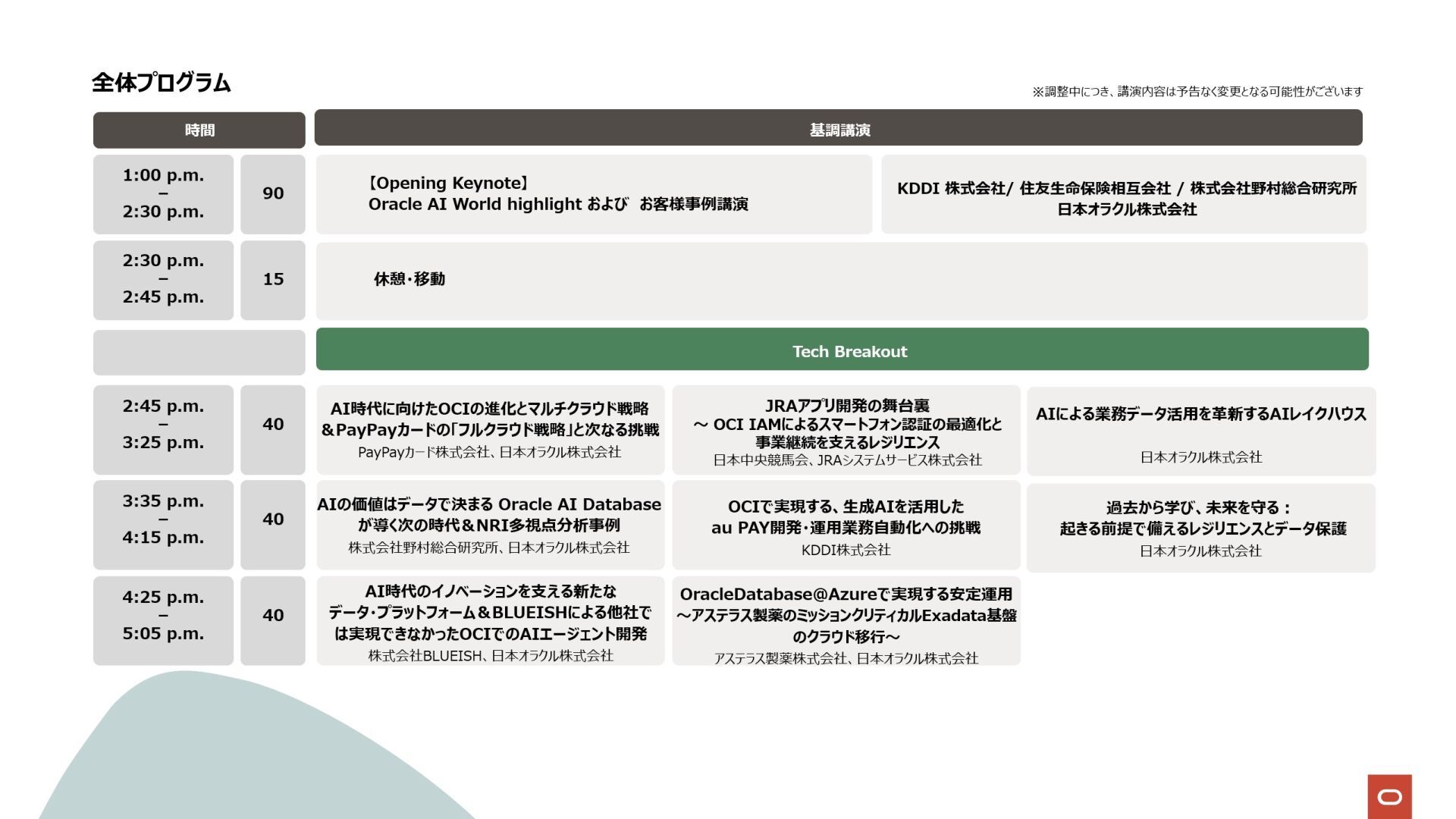 Infrastructure 2025 Architect Associate 資格試験ポイント解説セミナー • 2025/1/14︓OCI Success Journey 製造業界でのOCI活⽤、成功のポイントは︖ • 2025/1/14︓ランサムウェアが突く「侵⼊の隙」とバックアップの「死⾓」 〜 過去の教訓に学ぶ — 侵⼊前提の防御とデータ保護 〜 • 2026/1/15︓まずはここから︕OCIスタートアップセミナー • 2025/1/21︓[Oracle AI Database + Azure] AI-Ready データ戦略の最短ルート︓Azure AIでビジネス データの価値を最⼤化 • 2025/1/21︓[Oracle AI Jam Session]知っているふりをしないためのMCPサーバー⼊⾨ • 2025/1/22︓Oracle Cloud Infrastructure 2025 Architect Professional 資格試験ポイント解説セミナー • 2025/1/27︓実践Kubernetesハンズオン 〜OKEでKubernetesをバーチャル体験しよう〜 [ハンズオン] • 2025/1/28︓はじめてでもできる、ビジネス情報の活⽤! ⾃分で試すナットクの、データの収集と共有・分析 [ハンズオン] • 2025/1/28︓[Oracle AI Database + Google Cloud] AIとデータ分析でイノベーションを推進 • 2025/1/29︓[Oracle Database Technology Night]Oracle Databaseカーネル⼤改造史 ~ 増補改訂版 • 2025/2/4︓[Oracle AI Database + AWS] Oracle Database@AWSで広がるクラウドの新たな選択肢とAI時代のデータ戦略 • 2025/2/10︓Oracle Cloud Infrastructure 2025 Foundations Associate 資格試験ポイント解説セミナー • 2025/2/13︓Oracle Cloud Infrastructure 2025 Architect Associate 資格試験ポイント解説セミナー • 2025/2/16︓Oracle Cloud Infrastructure 2025 Architect Professional 資格試験ポイント解説セミナー • 2025/2/20︓続・営業向け誰でも話せるOCIセールストーク(2026年2⽉度 AWSよりOCIの優位性が分からない編) セミナー/イベント予定 “Oracle Cloud セミナー”で検索 Copyright © 2025, Oracle and/or its affiliates 111